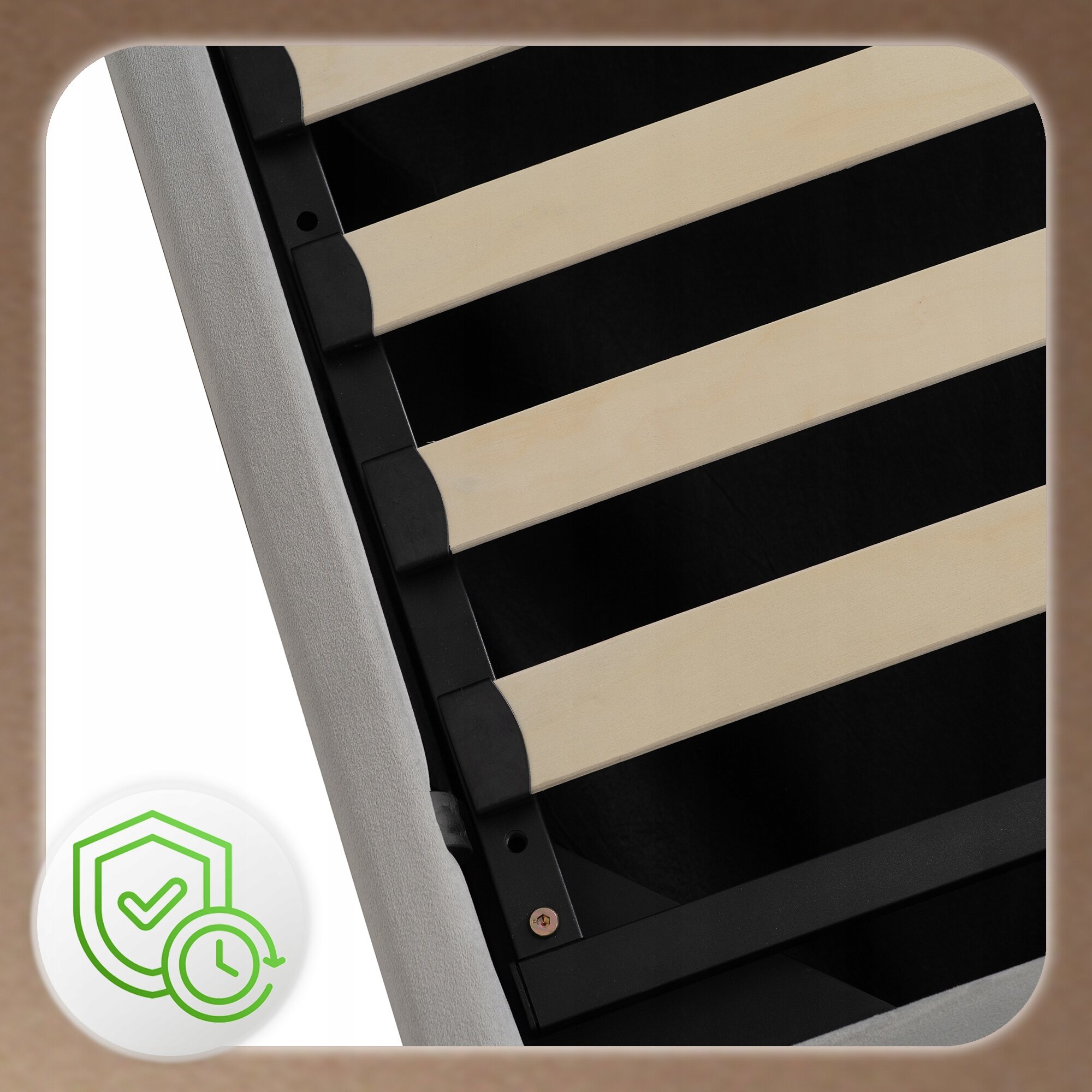 Łóżko zostało wyposażone w solidny stelaż z elastycznych listew, które gwarantują nie tylko stabilność, ale także odpowiednie podparcie dla materaca. Dzięki swojej wytrzymałości szczebelki zapewniają komfortowy i zdrowy sen przez długie lata, sprawiając, że łóżko posłuży Ci niezawodnie każdego dnia.