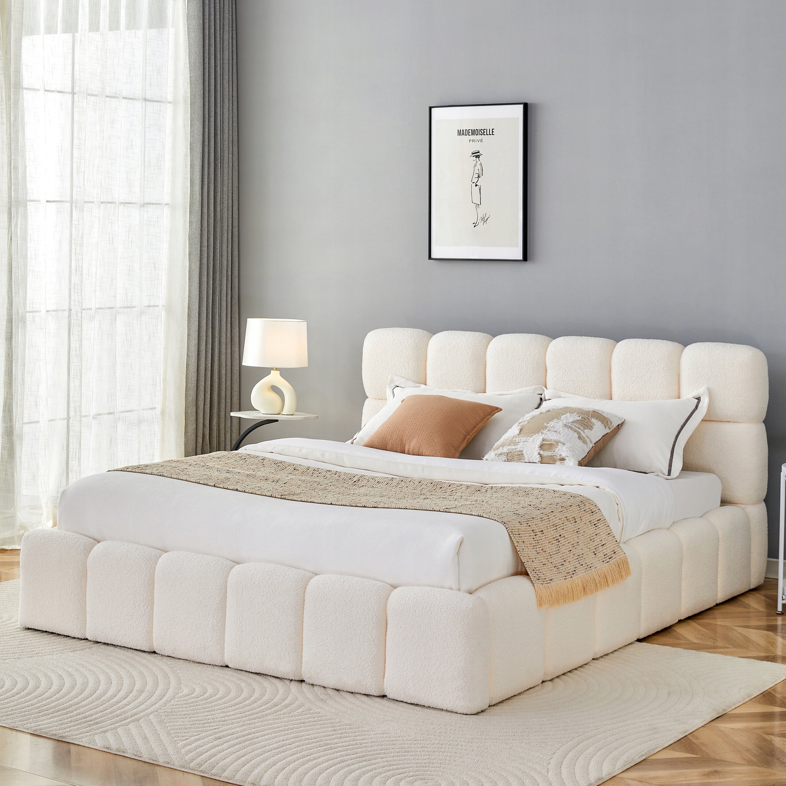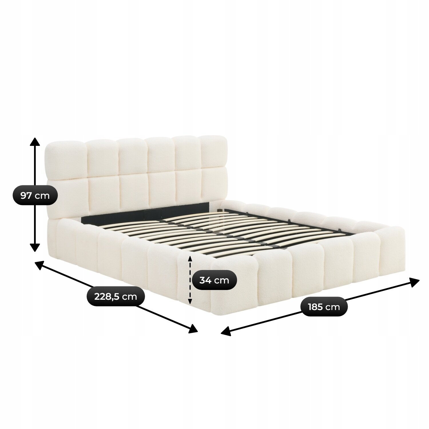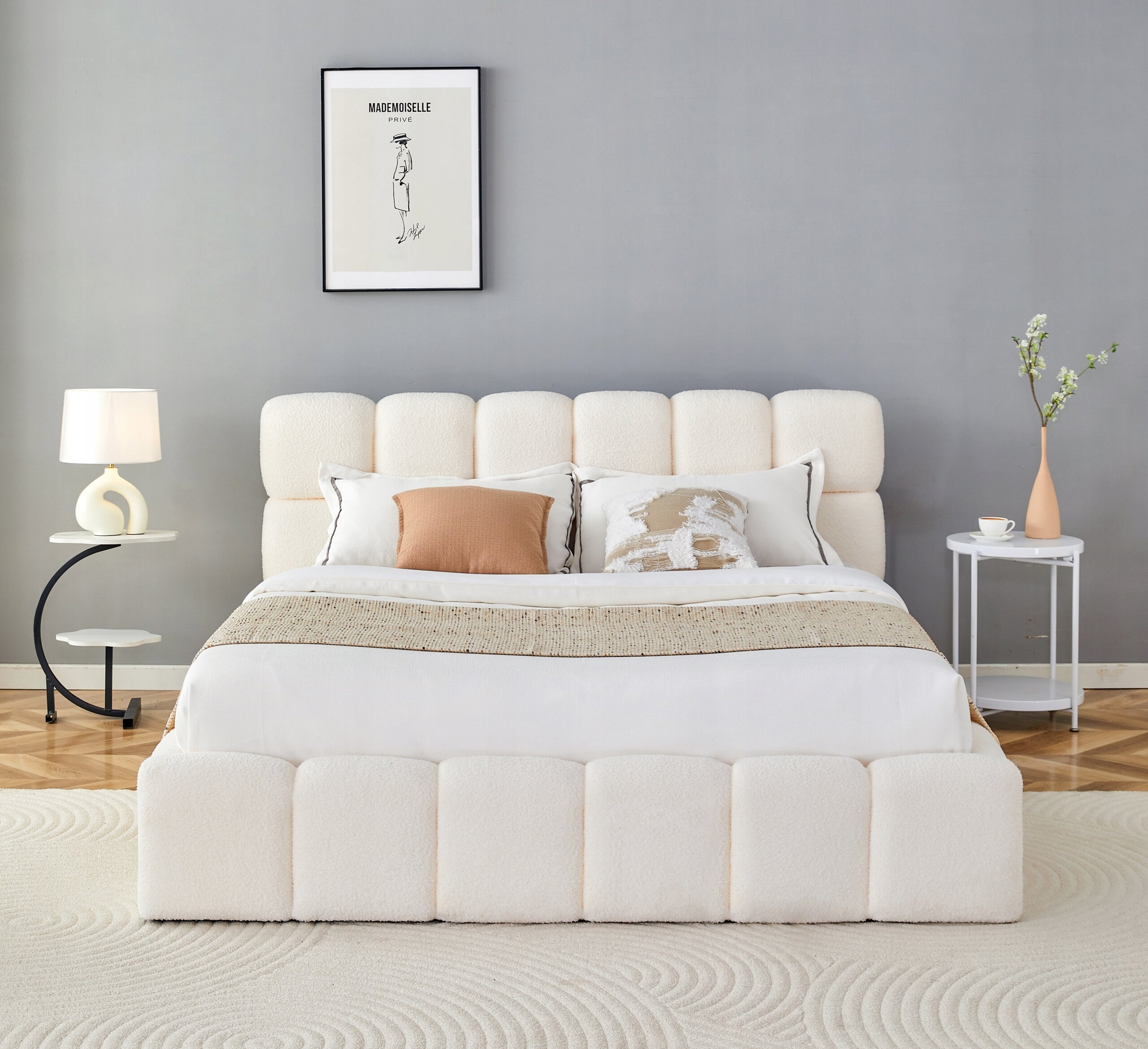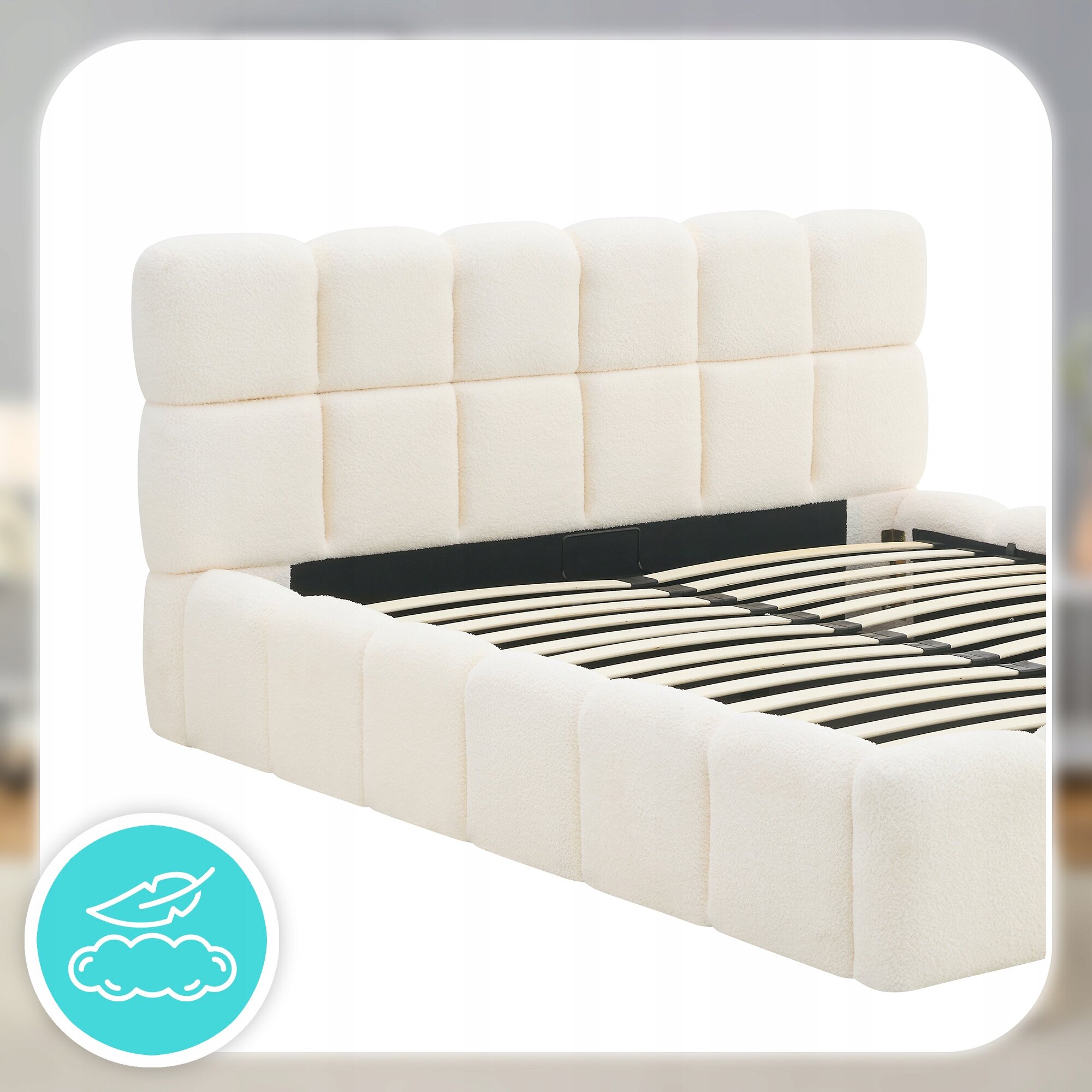 Łóżko zostało obite wyjątkowo przyjemną w dotyku tkaniną teddy, która nie tylko podkreśla elegancki charakter mebla, ale także dodaje mu ciepła i przytulności. Jej barankowa, miękka faktura sprawia, że codzienny odpoczynek staje się jeszcze bardziej komfortowy, a sypialnia zyskuje stylowy i nowoczesny wygląd.