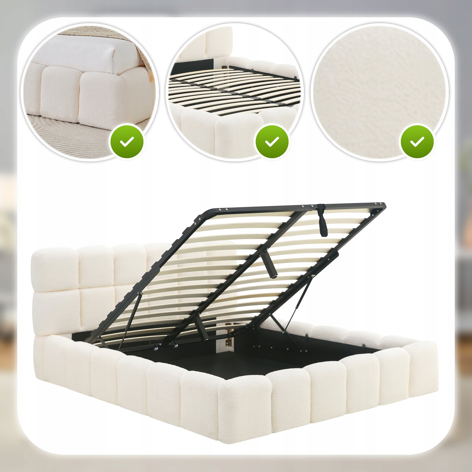 - Solidne podnośniki gazowe – ułatwiają codzienne korzystanie z pojemnika na pościel i zapewniają wygodę użytkowania.