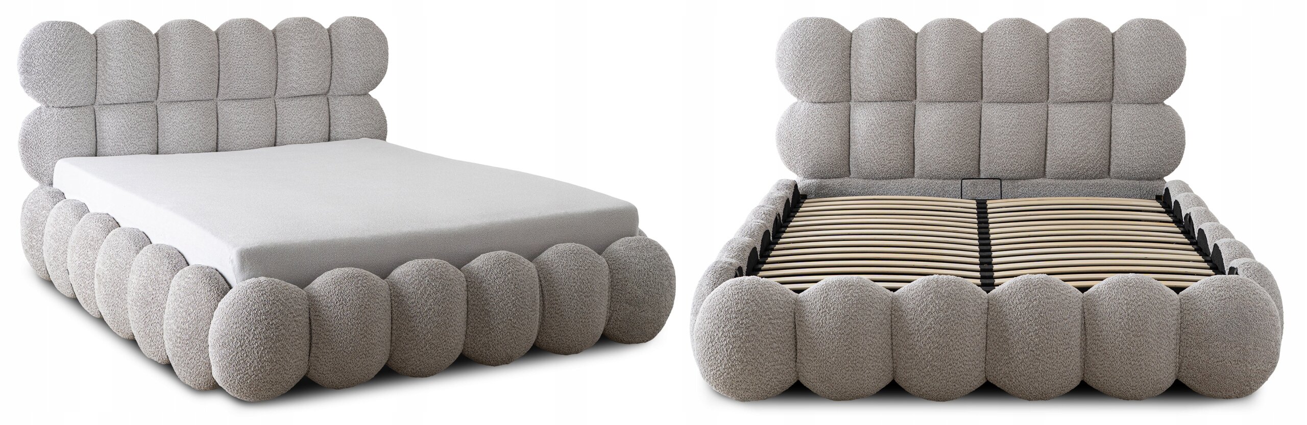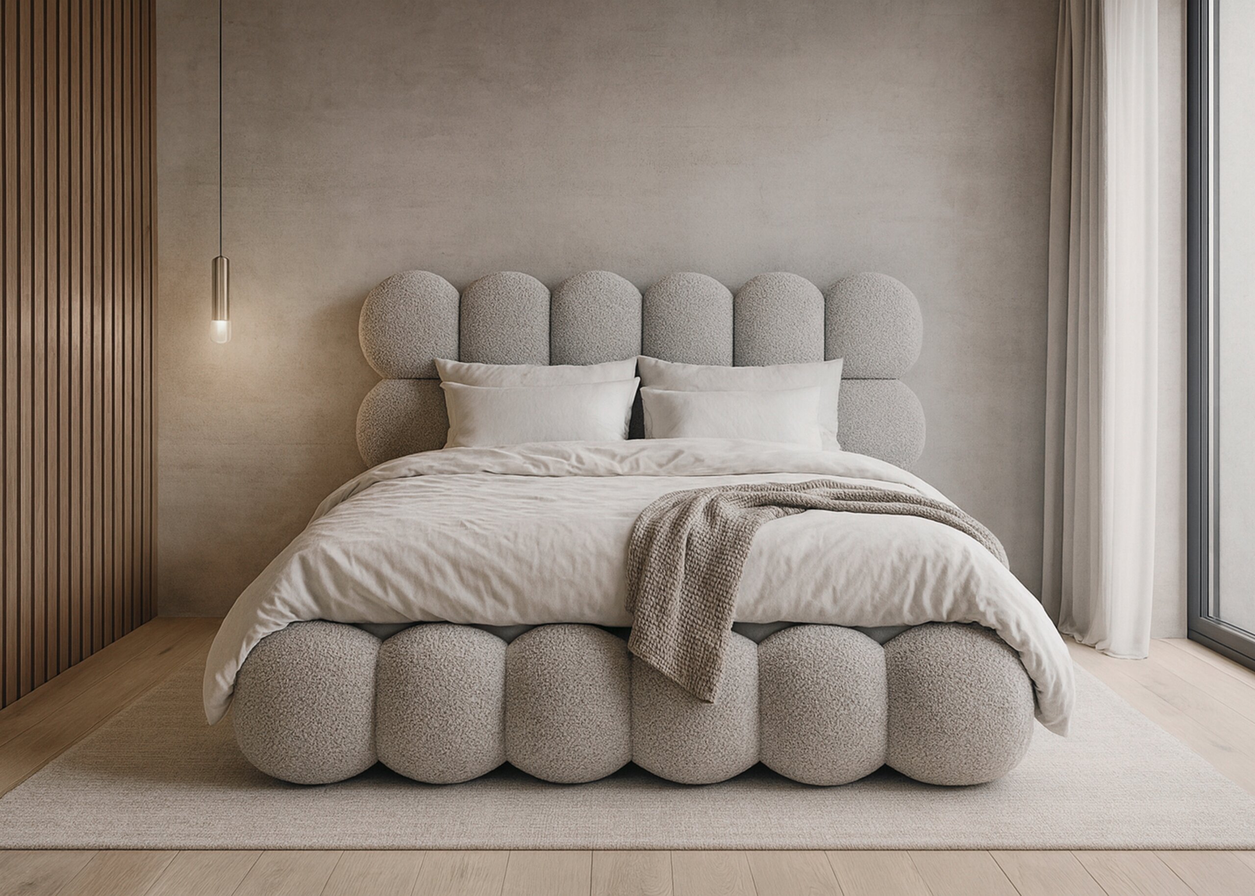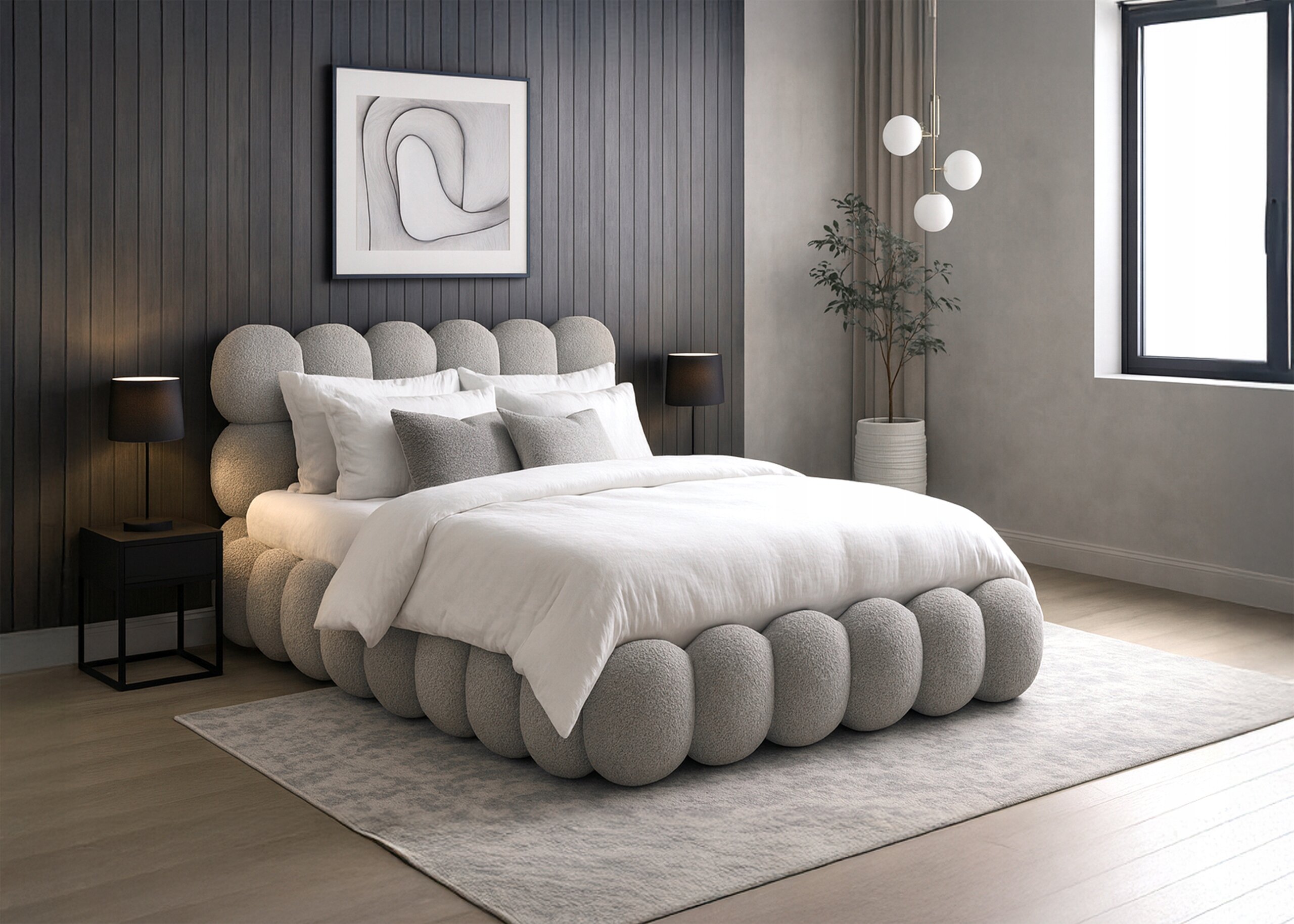 Łóżko zostało obite wyjątkowo przyjemną w dotyku tkaniną teddy, która nie tylko podkreśla elegancki charakter mebla, ale także dodaje mu ciepła i przytulności. Jej miękka faktura sprawia, że codzienny odpoczynek staje się jeszcze bardziej komfortowy, a sypialnia zyskuje stylowy i nowoczesny wygląd.