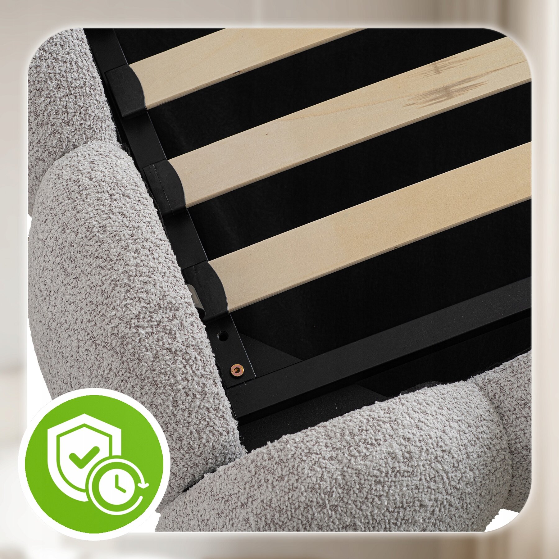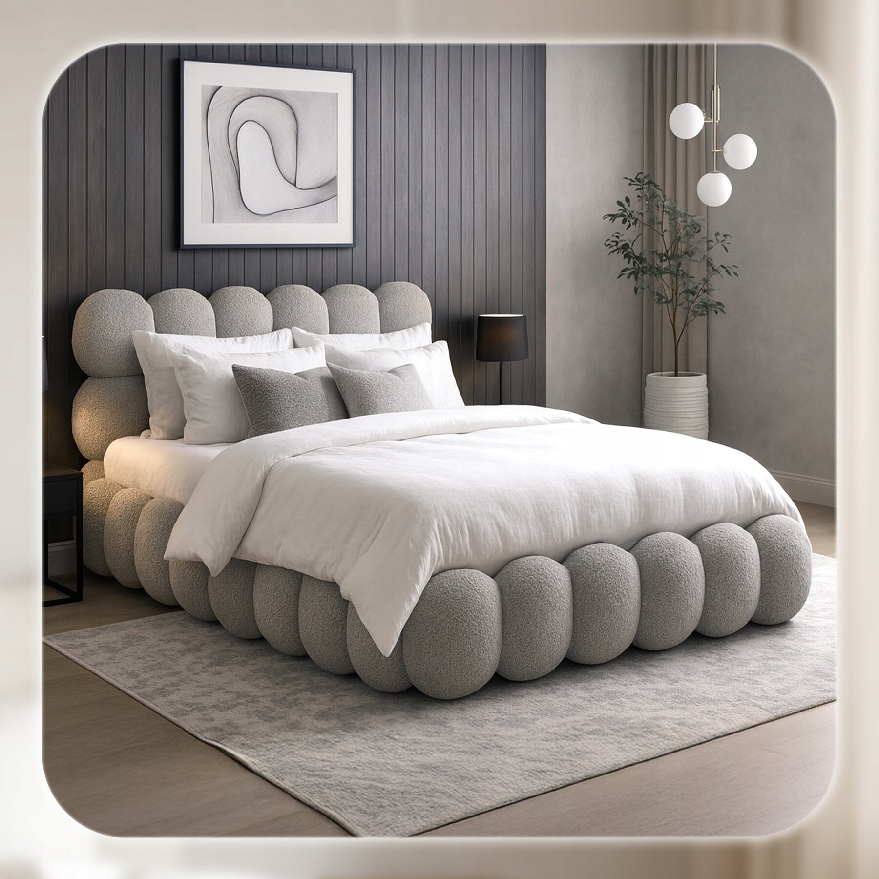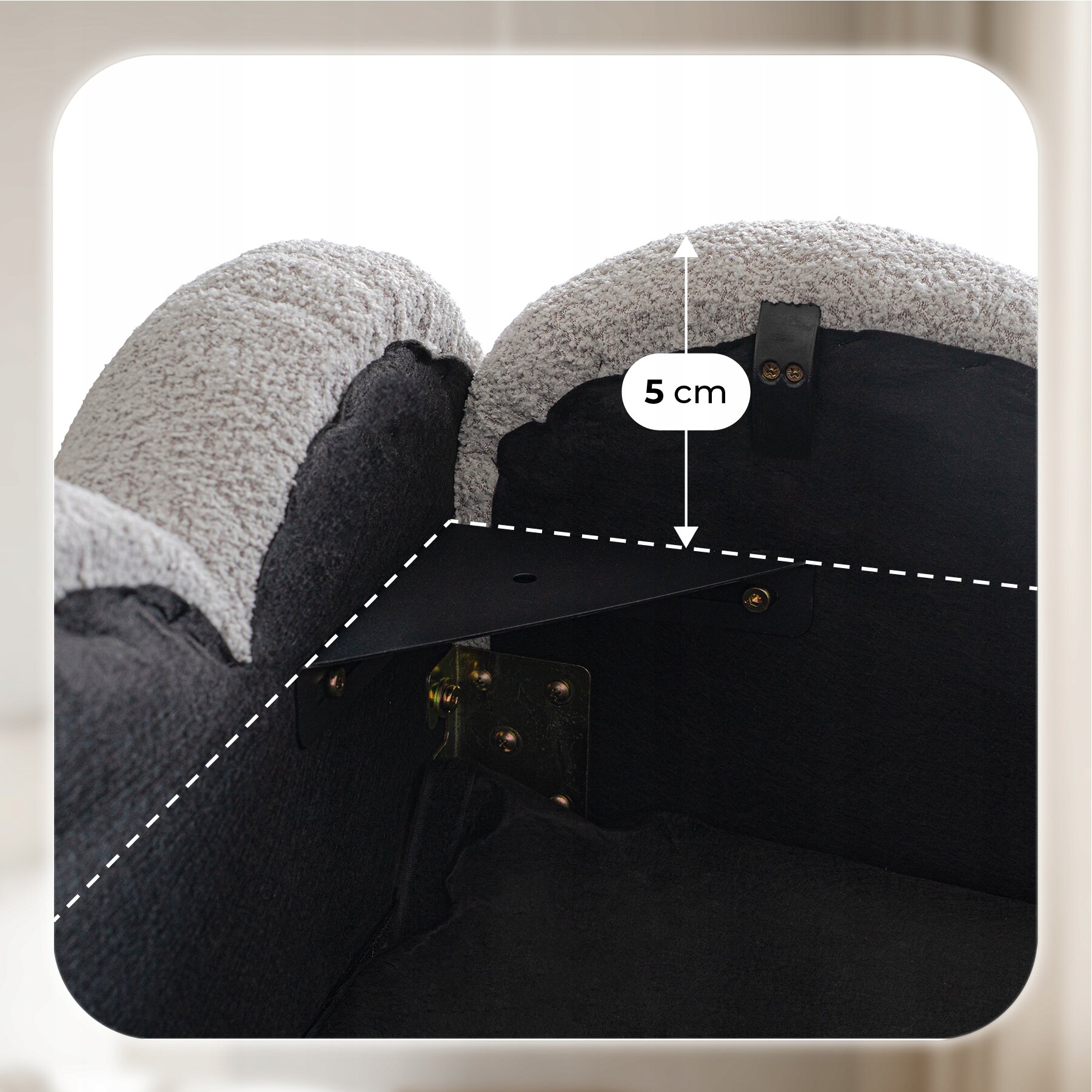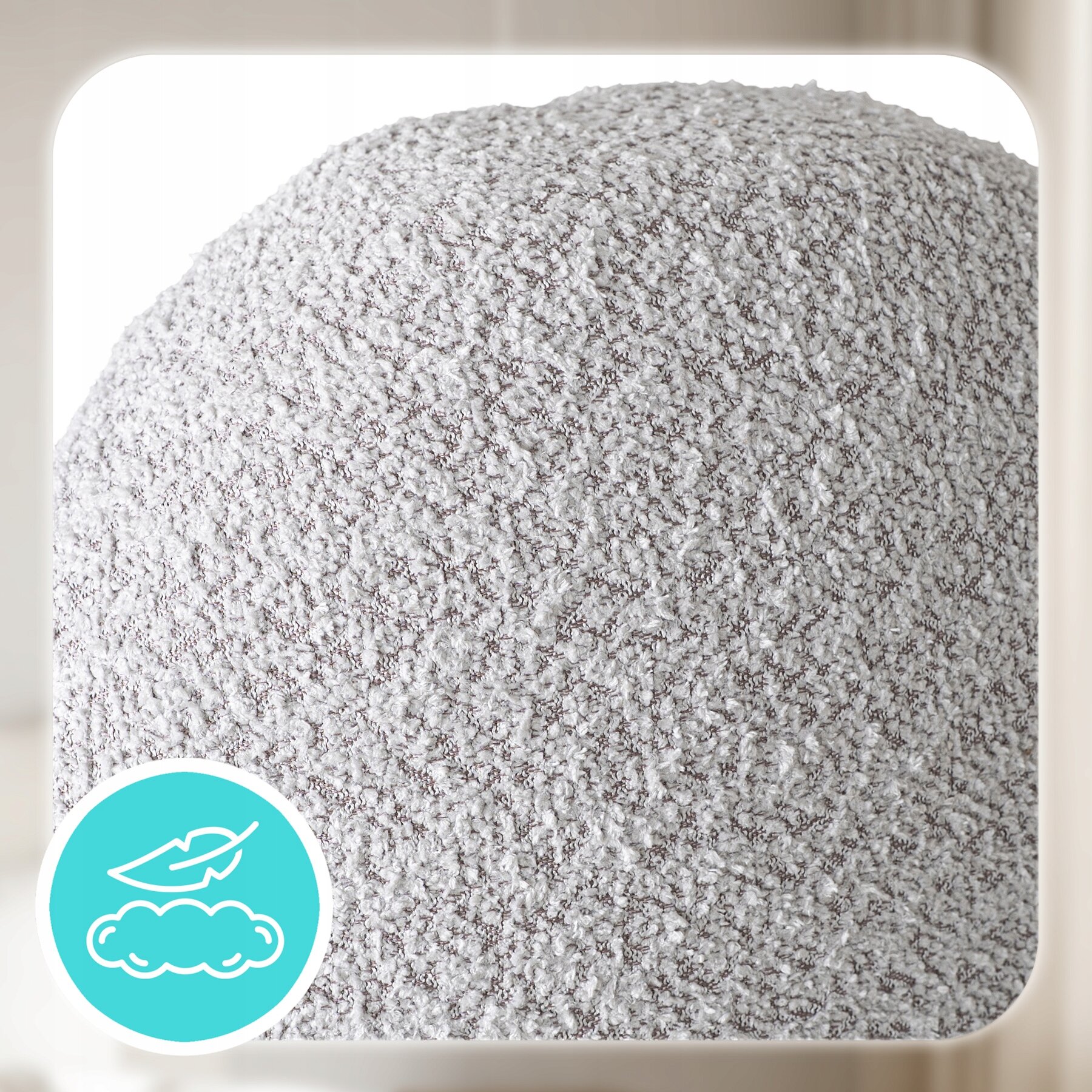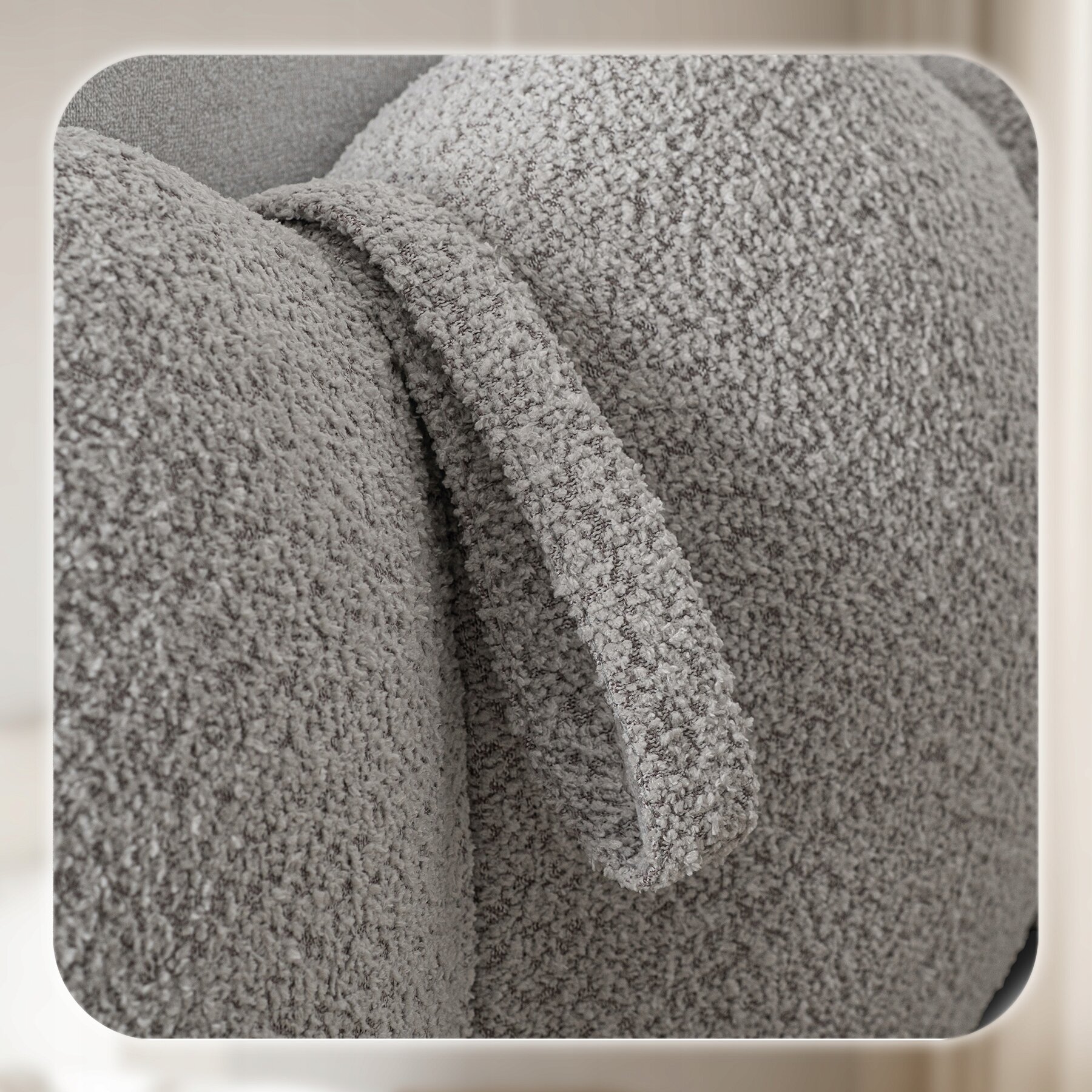 - Miękka tapicerka typu teddy w szarym kolorze – elegancka, przyjemna w dotyku i nadająca wnętrzu wyjątkowej przytulności.