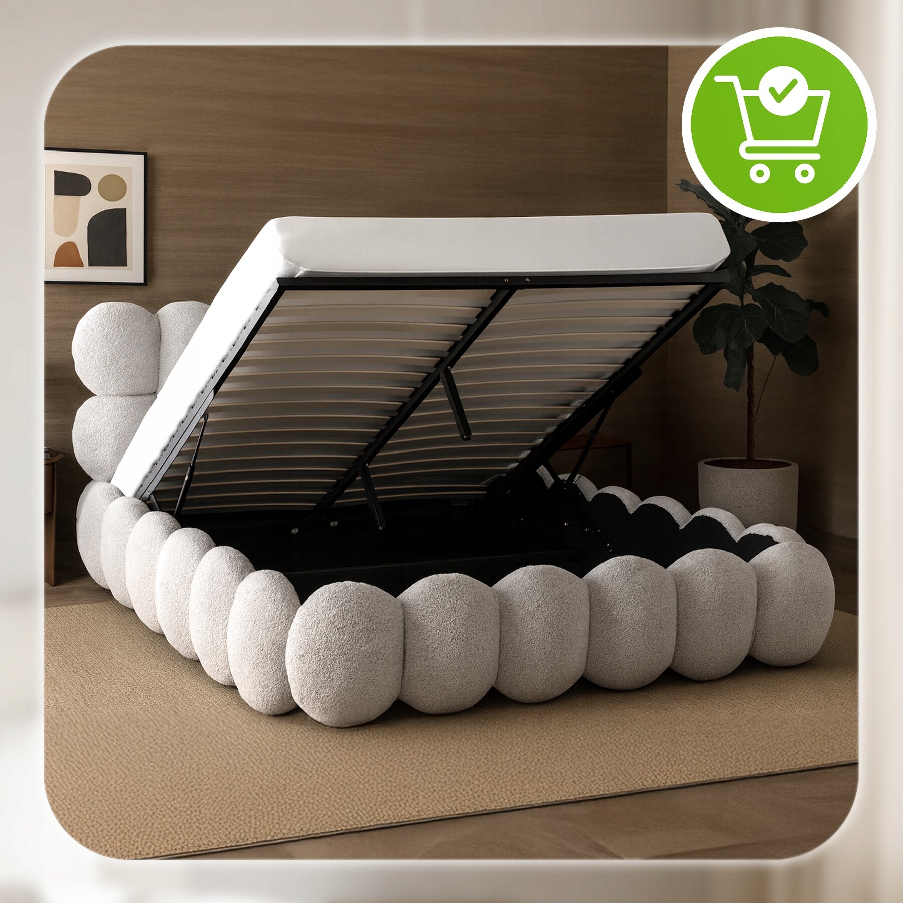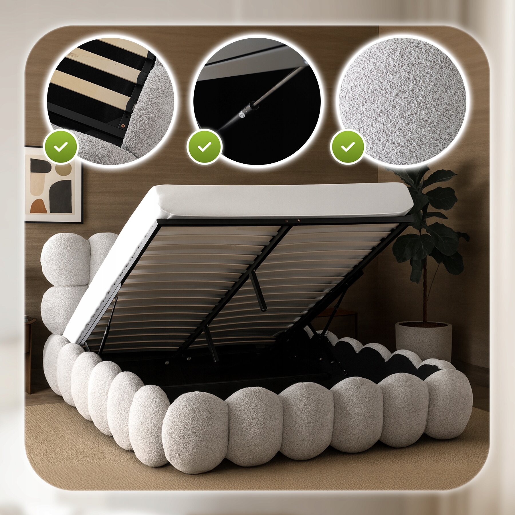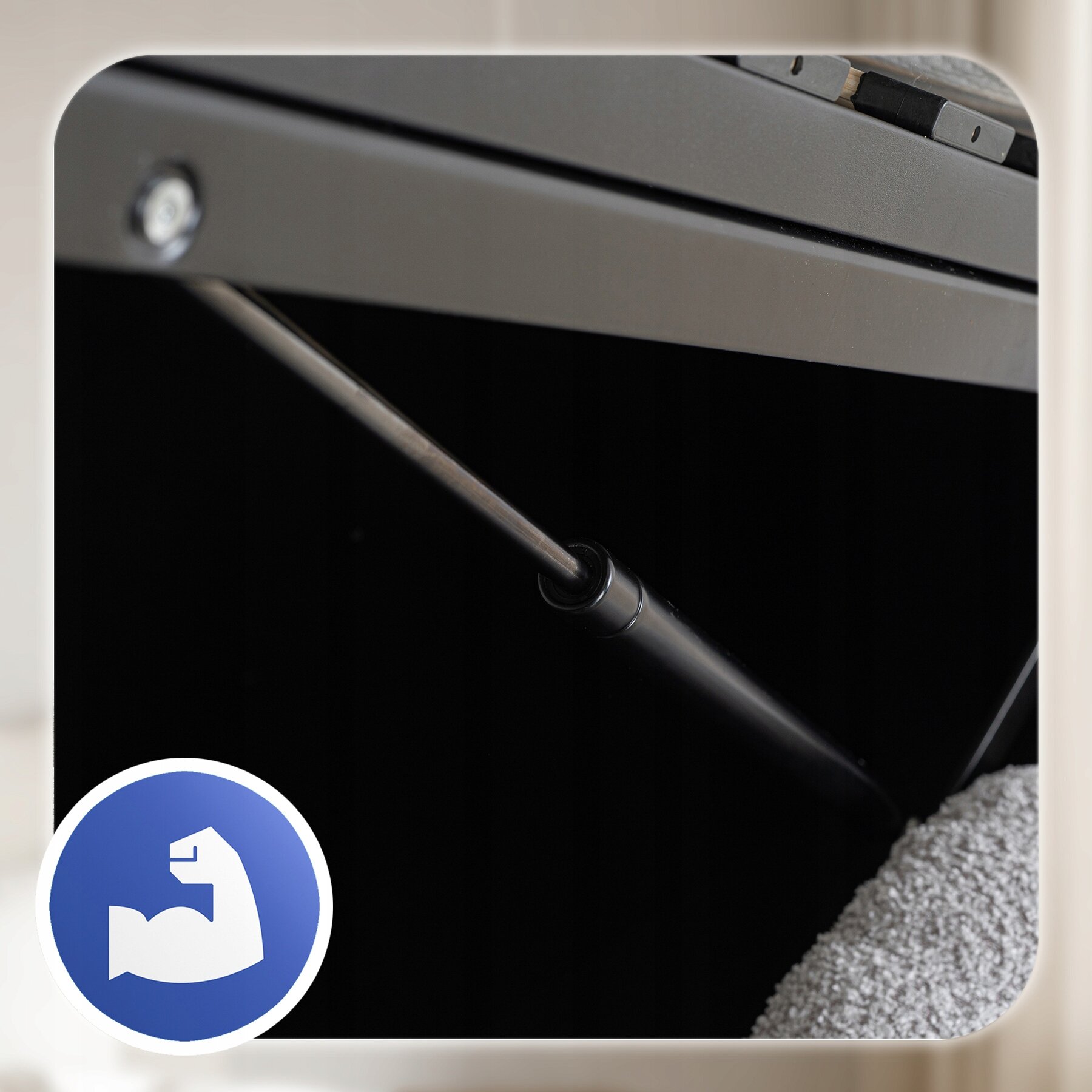 Łóżko wyposażone jest w solidne podnośniki gazowe, które sprawiają, że otwieranie pojemnika staje się bardzo proste – bez wysiłku i w kilka sekund. To rozwiązanie, które łączy funkcjonalność i komfort codziennego użytkowania.