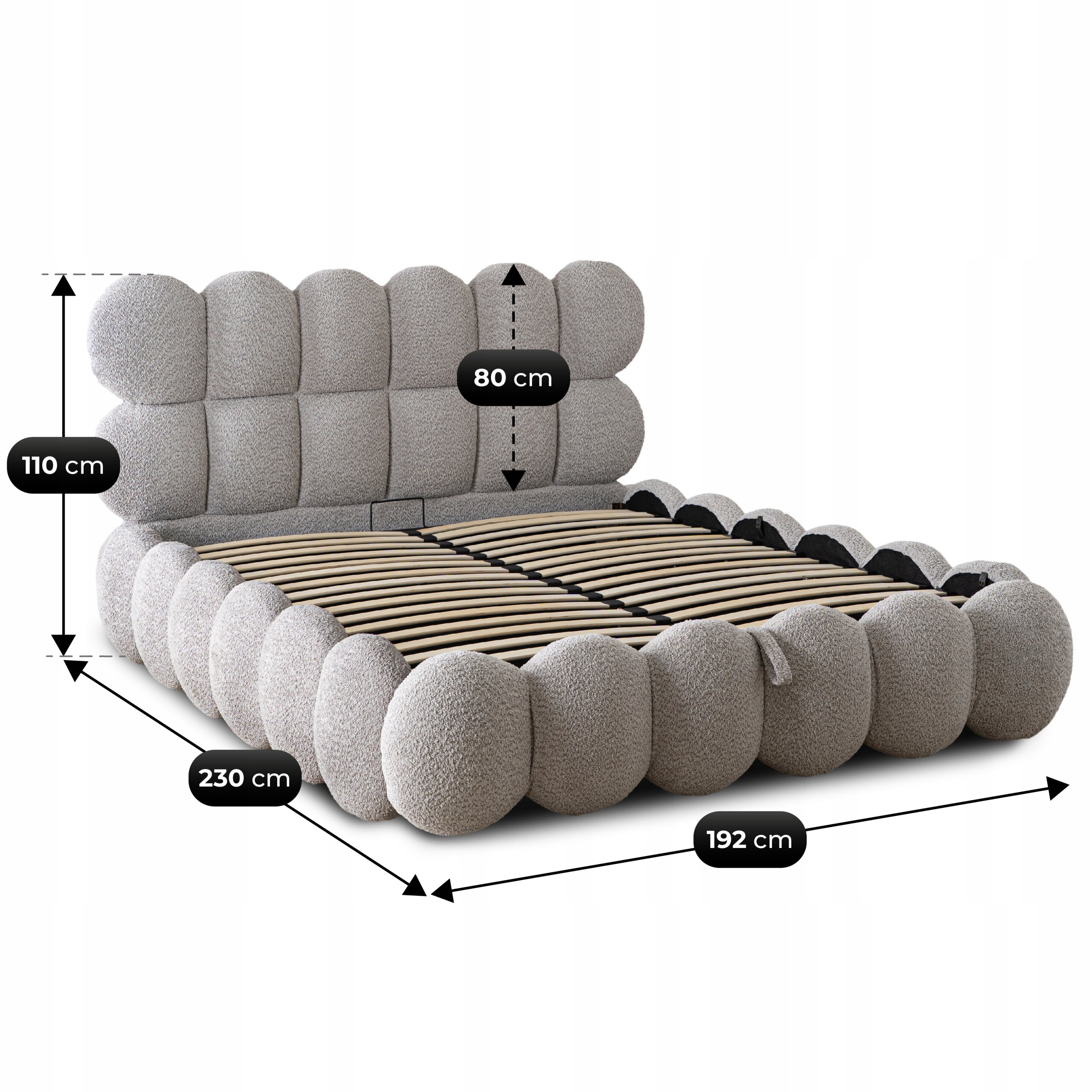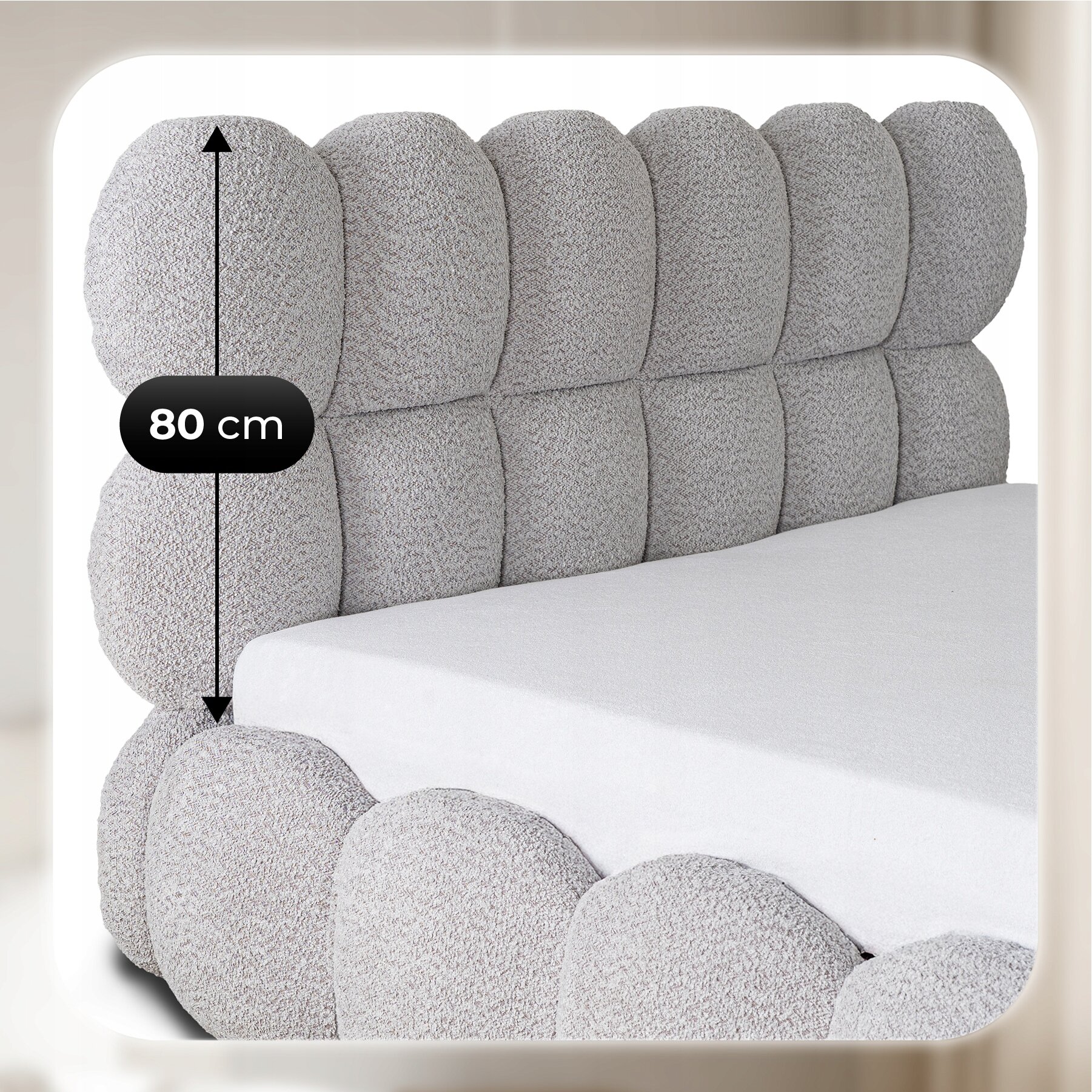 Tapicerowany zagłówek o wysokości 80 cm to gwarancja wygody podczas wieczornego czytania, oglądania telewizji czy relaksu z ulubioną kawą. Jego miękka pikowana konstrukcja i eleganckie wykończenie w szarej barankowej tkaninie dodają wnętrzu nowoczesnego charakteru, a jednocześnie sprawiają, że łóżko prezentuje się niezwykle stylowo i przytulnie.