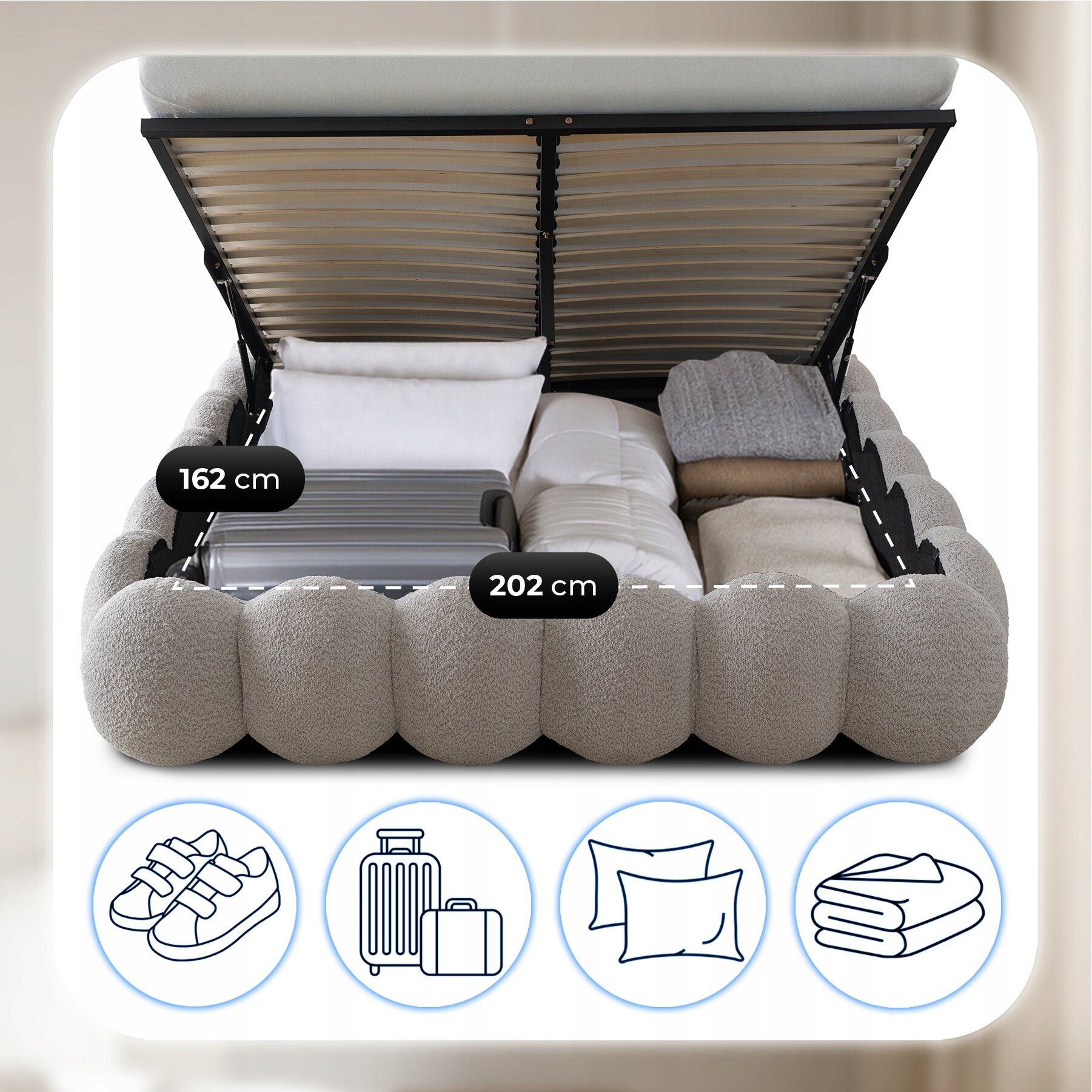 Łóżko kryje w sobie obszerny pojemnik na przechowywanie, który pomieści wszystko, czego potrzebujesz – od kompletów pościeli, przez poduszki i koce, aż po walizki czy sezonowe ubrania. Dzięki wymiarom 202 x 162 cm masz do dyspozycji naprawdę dużą przestrzeń, która pozwoli Ci utrzymać sypialnię w idealnym porządku. To praktyczne rozwiązanie, które sprawdzi się w każdym domu, łącząc funkcjonalność i estetykę.