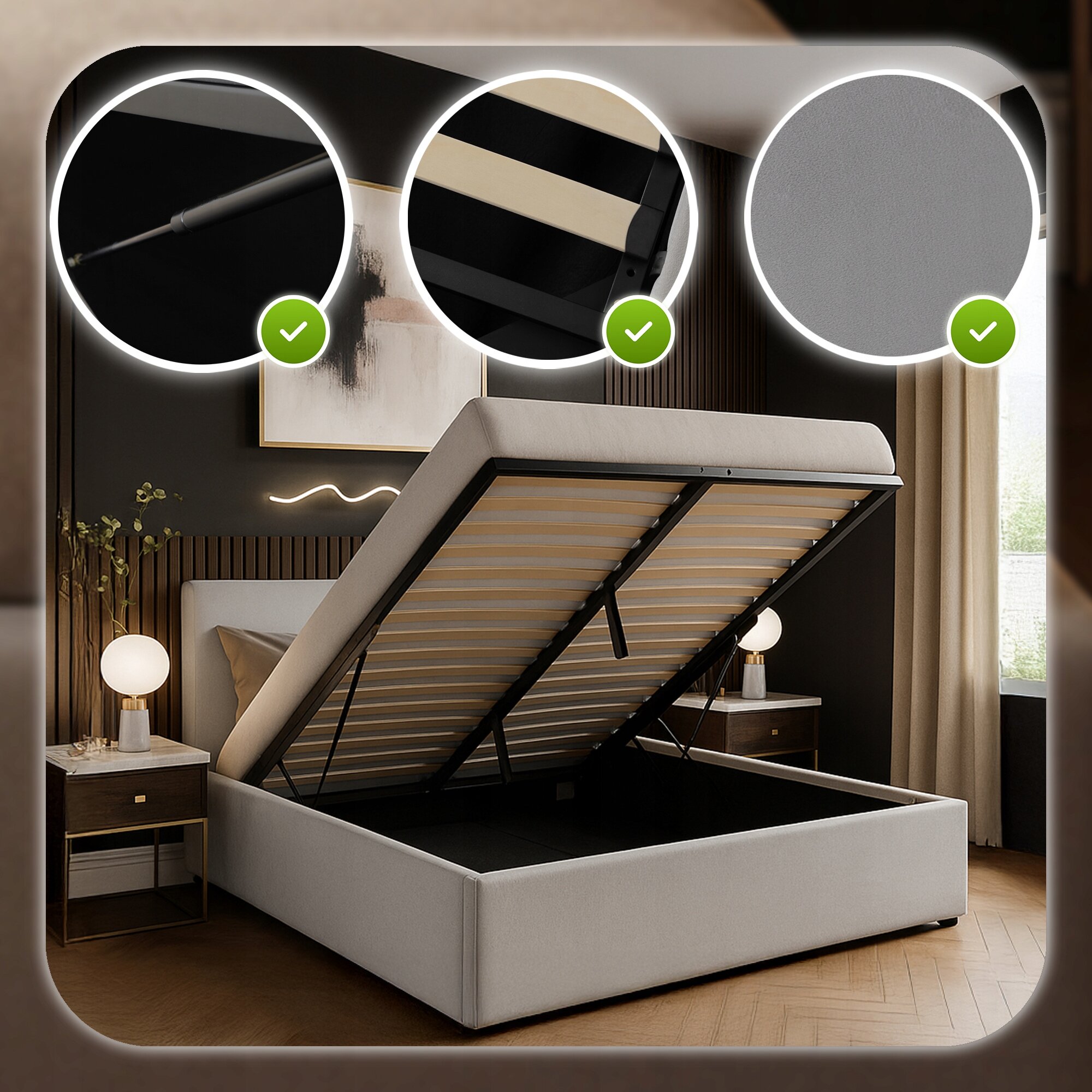 Łóżko wyposażone jest w solidne podnośniki gazowe, które sprawiają, że otwieranie pojemnika staje się bardzo proste – bez wysiłku i w kilka sekund. To rozwiązanie, które łączy funkcjonalność i komfort codziennego użytkowania.
