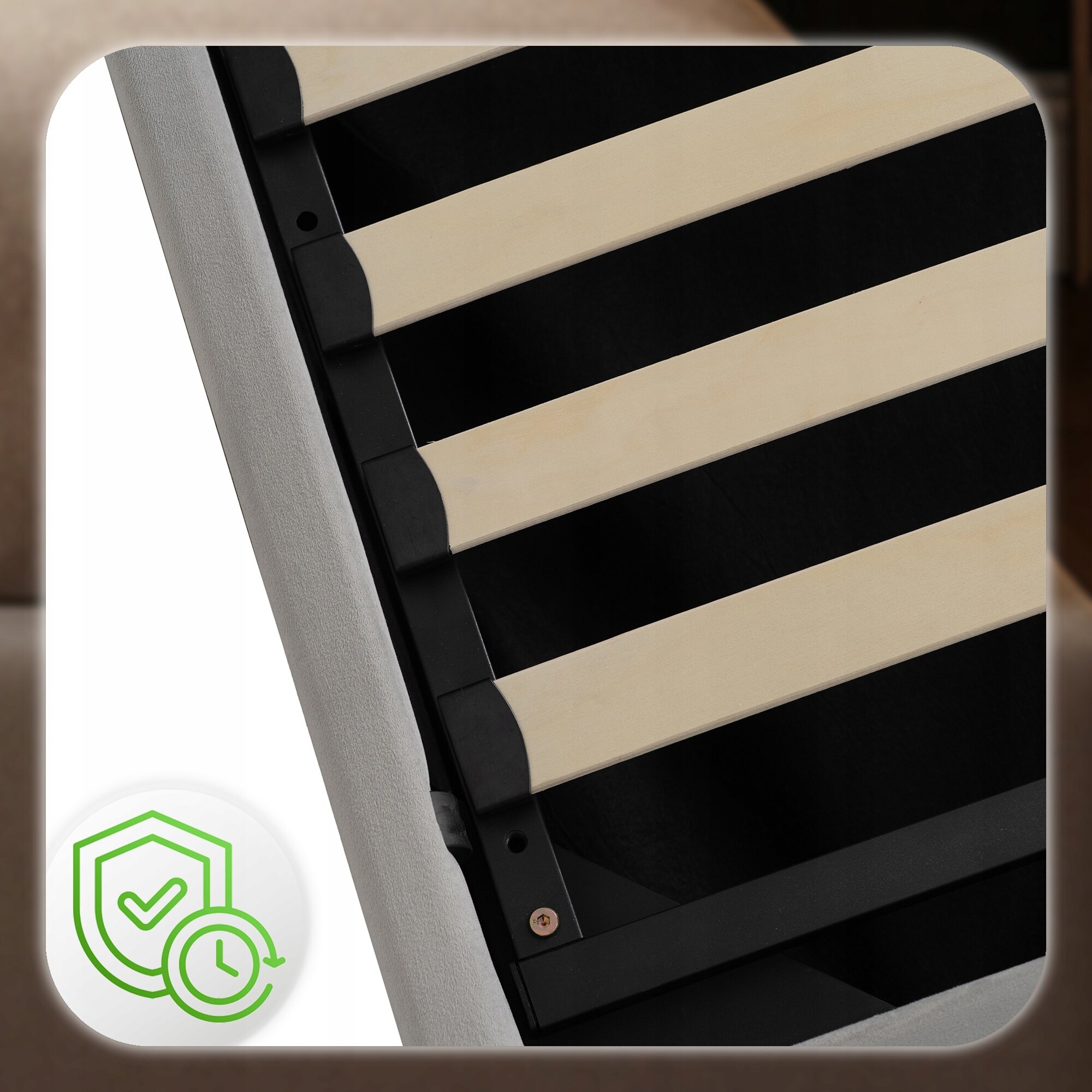 Łóżko zostało wyposażone w solidny stelaż z elastycznych listew, które gwarantują nie tylko stabilność, ale także odpowiednie podparcie dla materaca. Dzięki swojej wytrzymałości szczebelki zapewniają komfortowy i zdrowy sen przez długie lata, sprawiając, że łóżko posłuży Ci niezawodnie każdego dnia.