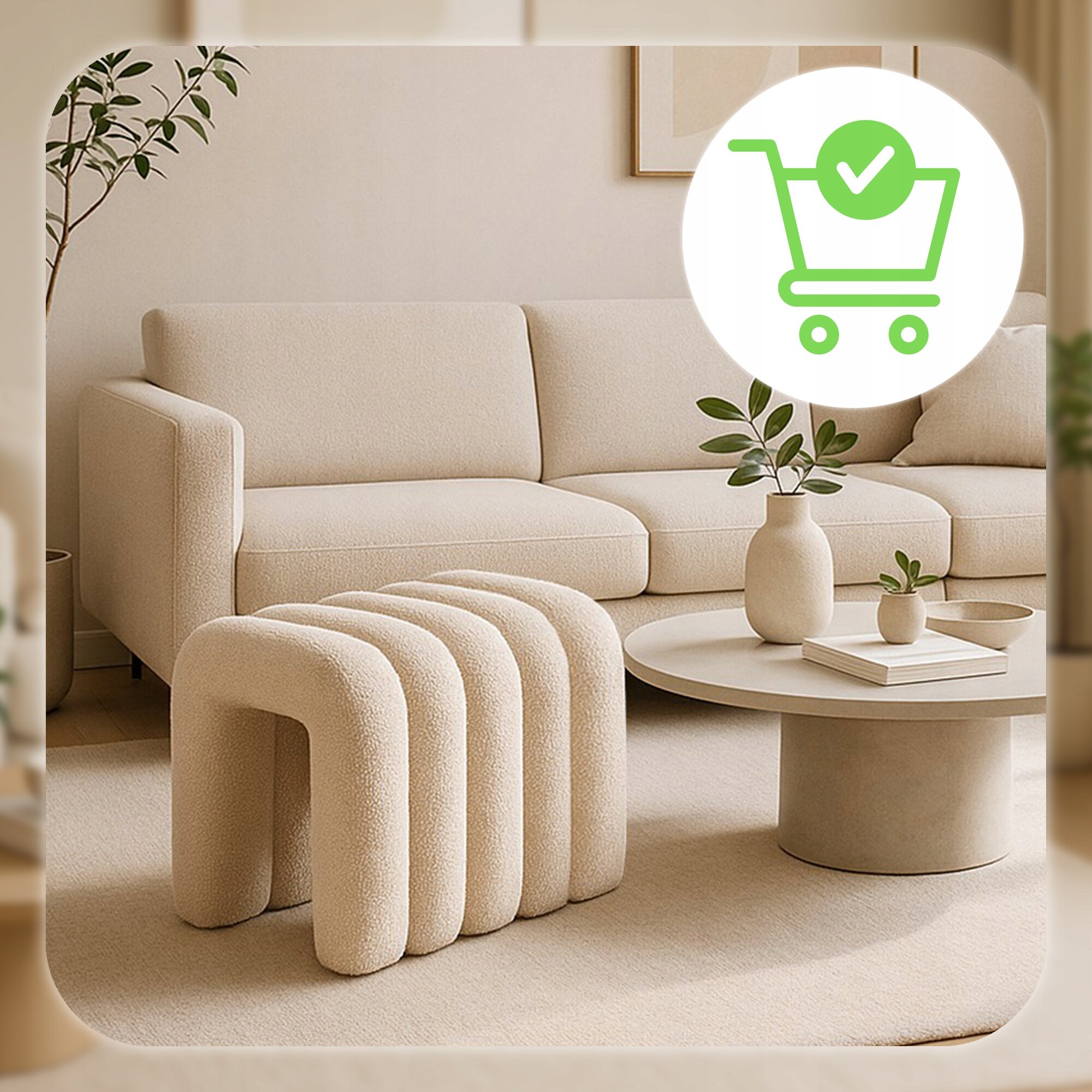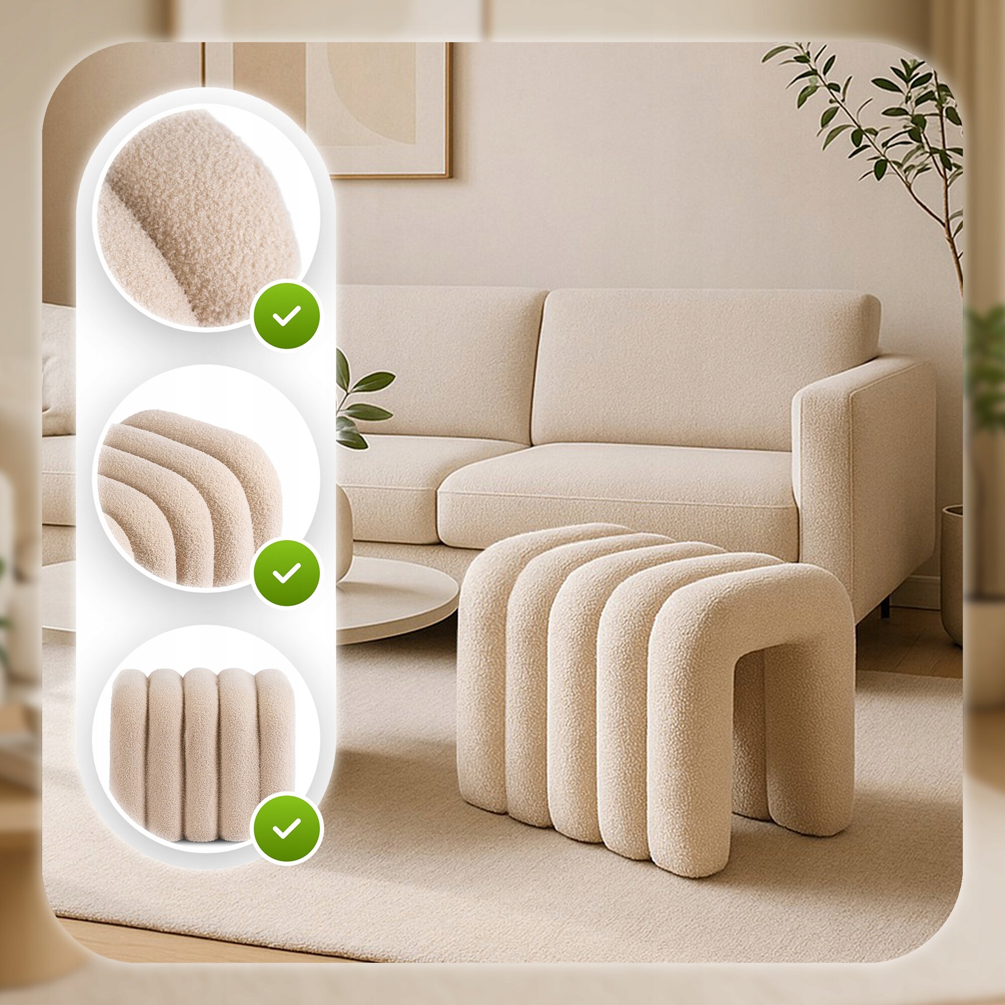- Miękka tkanina boucle – wyjątkowo przyjemna w dotyku i elegancka, dodaje wnętrzu klasy i nowoczesnego charakteru.