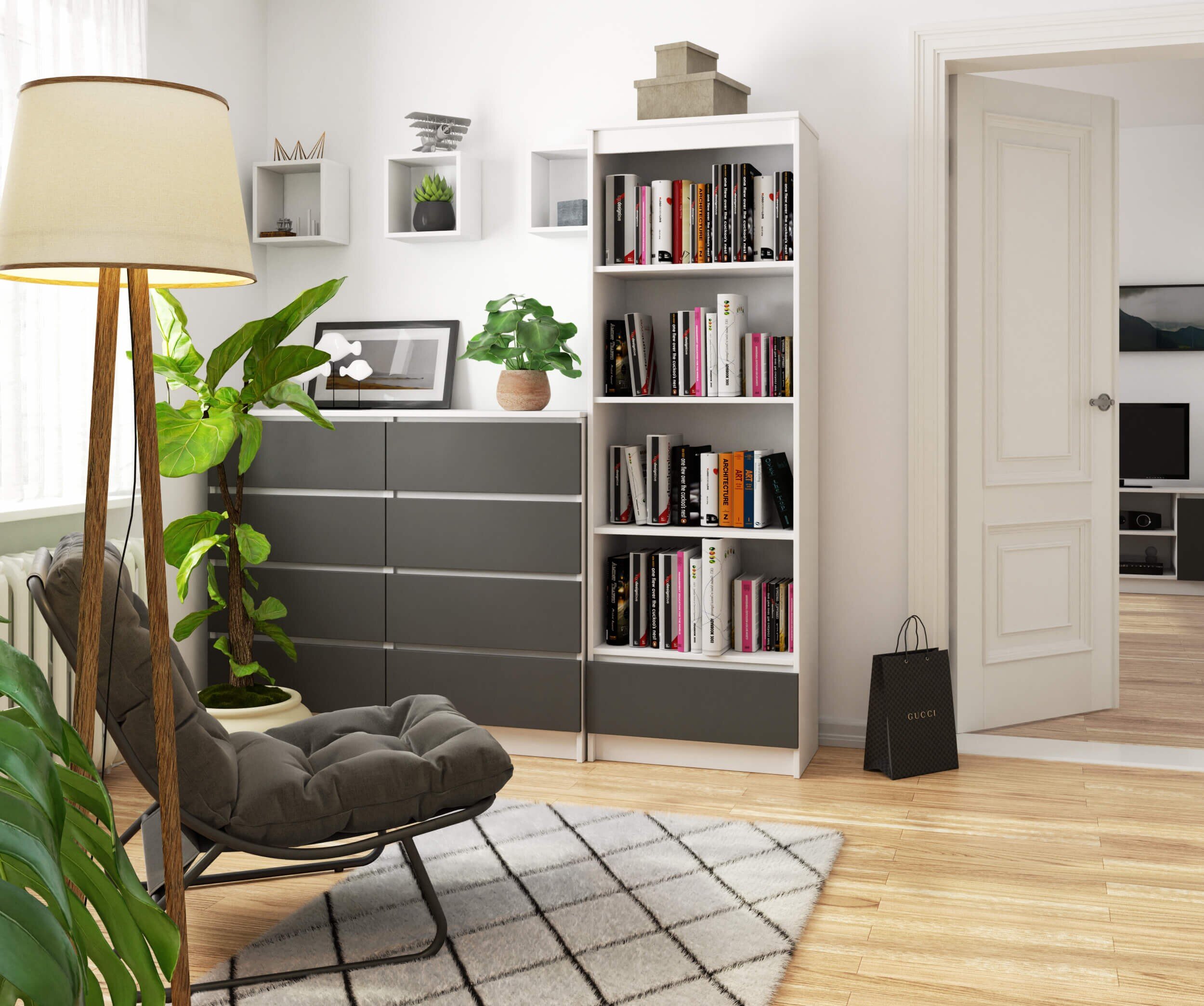 Regał AKORD R60 Biały 60 cm 1 szuflada kolor Grafit Szary mat 4 półki 60x35x180 cm