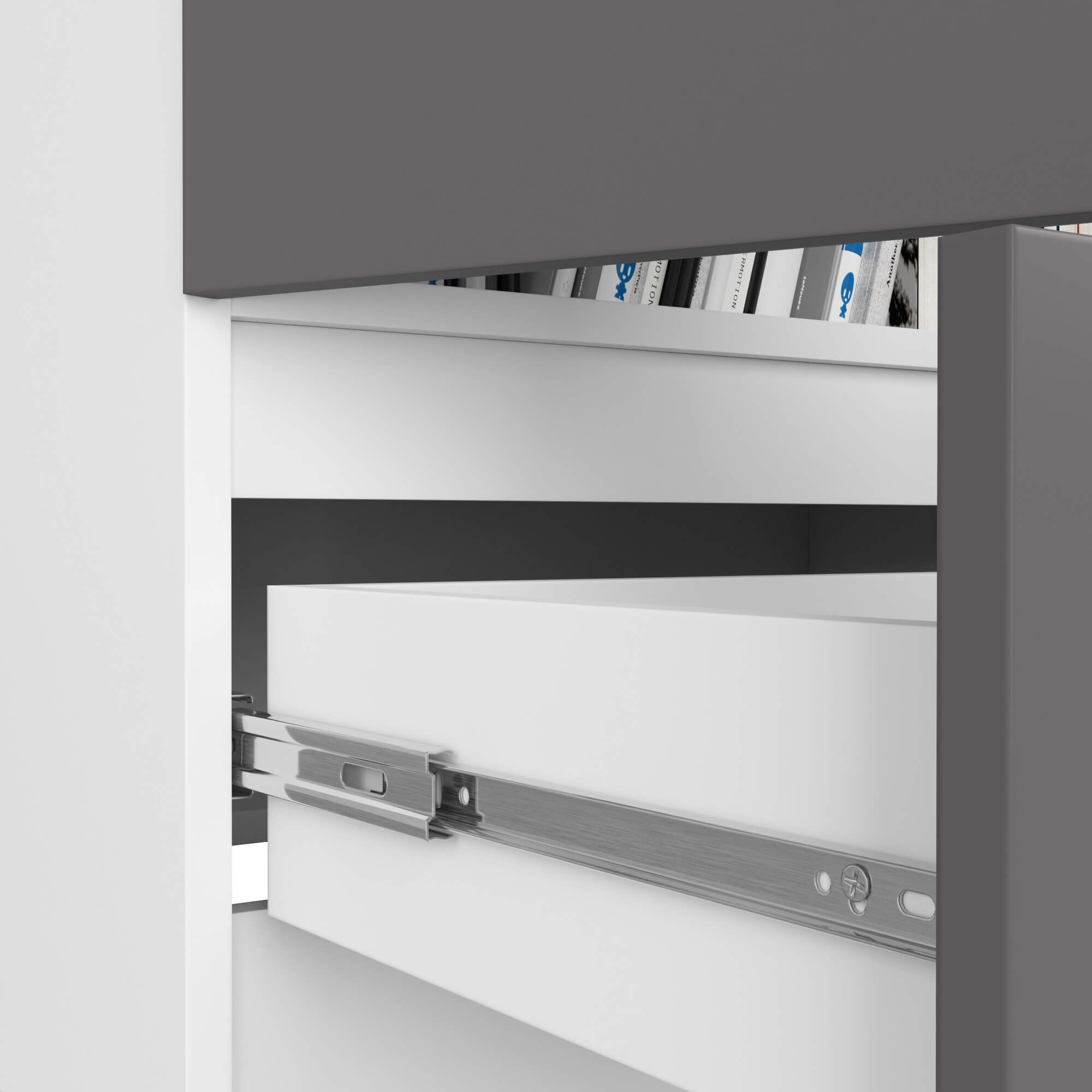 - KOMFORT: Szuflady wyposażone są w prowadnice rolkowe z blokadą, która zapobiega przypadkowemu wyjęciu całej szuflady. Mebel jest zaprojektowany z myślą o łatwym montażu.