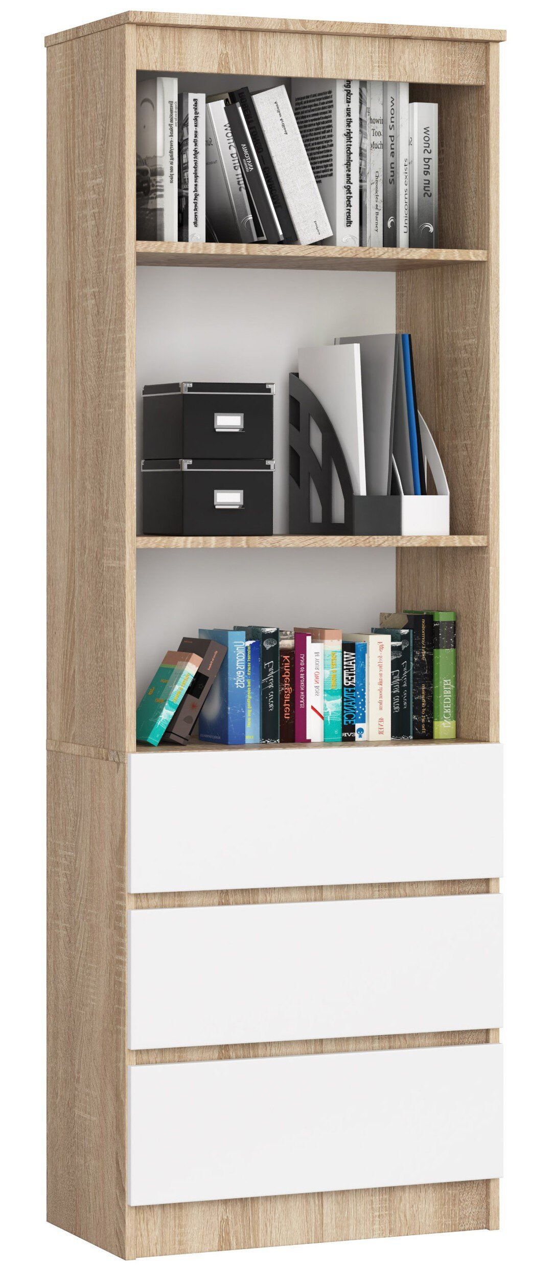 Regał AKORD R60 Dąb Sonoma 60 cm 3 szuflady kolor Biały mat 3 półki 60x35x180 cm