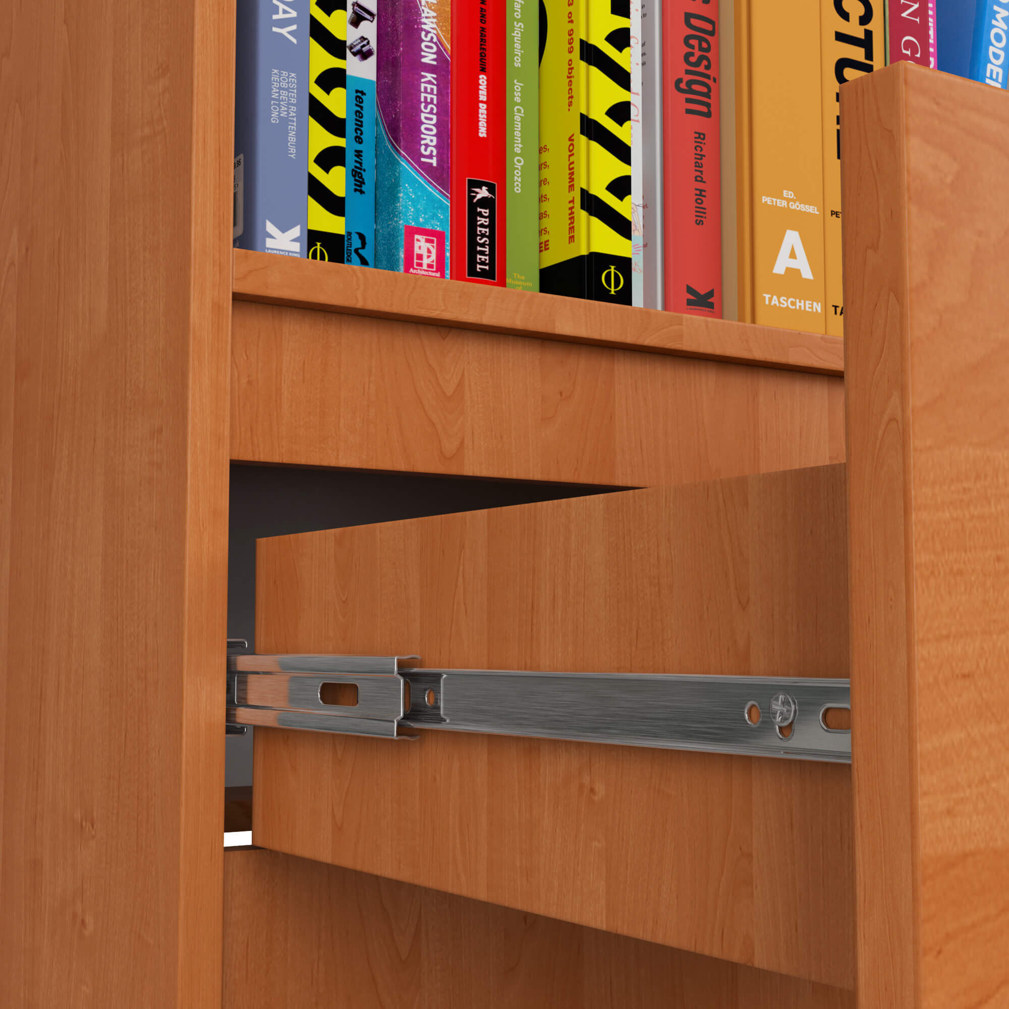 - KOMFORT: Szuflady wyposażone są w prowadnice rolkowe z blokadą, która zapobiega przypadkowemu wyjęciu całej szuflady. Mebel jest zaprojektowany z myślą o łatwym montażu.