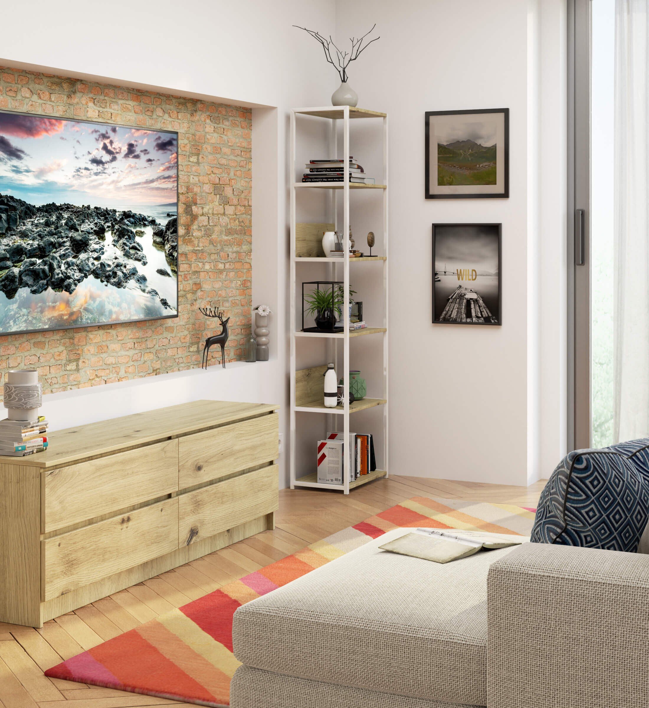 Regał loftowy AKORD biały o szerokości 50 cm, z półkami w kolorze Dąb Artisan mat, to propozycja stworzona z myślą o wnętrzach o charakterze industrialnym. Doskonale pasuje do salonu, sypialni czy domowej biblioteki, będąc jednocześnie lekkim w bryle i funkcjonalnym dzięki swojej budowie szkieletowej. Regał loftowy, mimo braku ozdób, frontów i zbędnych dodatków, cieszy oko swoim nowoczesnym wyglądem. Uniwersalny projekt sprawia, że świetnie wkomponuje się w styl loftowy, industrialne przestrzenie, a także wnętrza urządzone w stylu skandynawskim, nowoczesnym czy minimalistycznym. To doskonały regał dla każdego, kto poszukuje mebla łączącego funkcjonalność z estetyką. Gdzie konkretnie można wstawić regał loftowy? Z pewnością pasować będzie w salonie, pokoju dziennym czy telewizyjnym, doskonale spełni swą rolę jako regał biblioteczny w domowej bibliotece lub gabinecie. Regał znajdzie również zastosowanie w pomieszczeniach biurowych, dodając industrialnego charakteru. Niezastąpiony może być także w przedpokoju, garażu, spiżarni czy innych pomieszczeniach gospodarczych. Zmyślnym pomysłem będzie wykorzystanie regału industrialnego jako przepierzenia pomiędzy dwoma pomieszczeniami, np. kuchnią a salonem lub przedpokojem a pokojem dziennym, co doda wnętrzu zarówno funkcjonalności, jak i stylu.