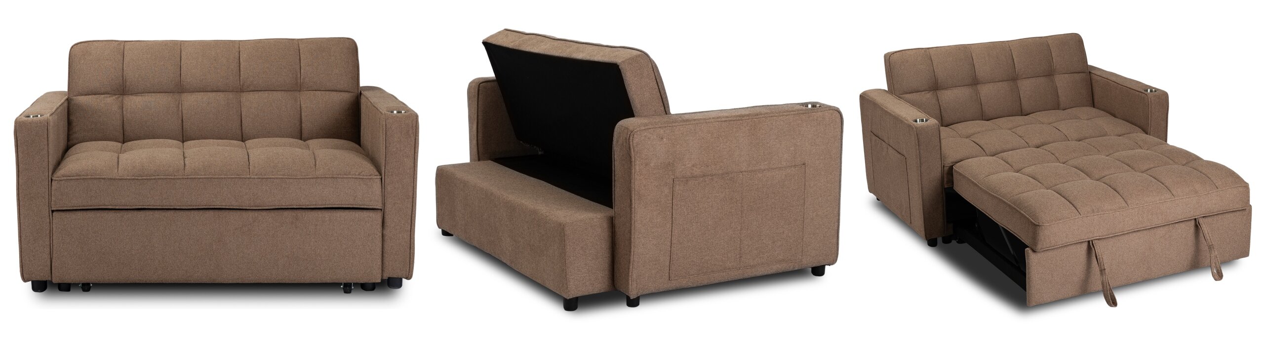 Obicie z wytrzymałej tkaniny jest łatwe w pielęgnacji, a miękkie wypełnienie gwarantuje komfort siedzenia i spania. Całość uzupełniają praktyczne dodatki – boczne kieszenie oraz uchwyt na napoje w podłokietniku.