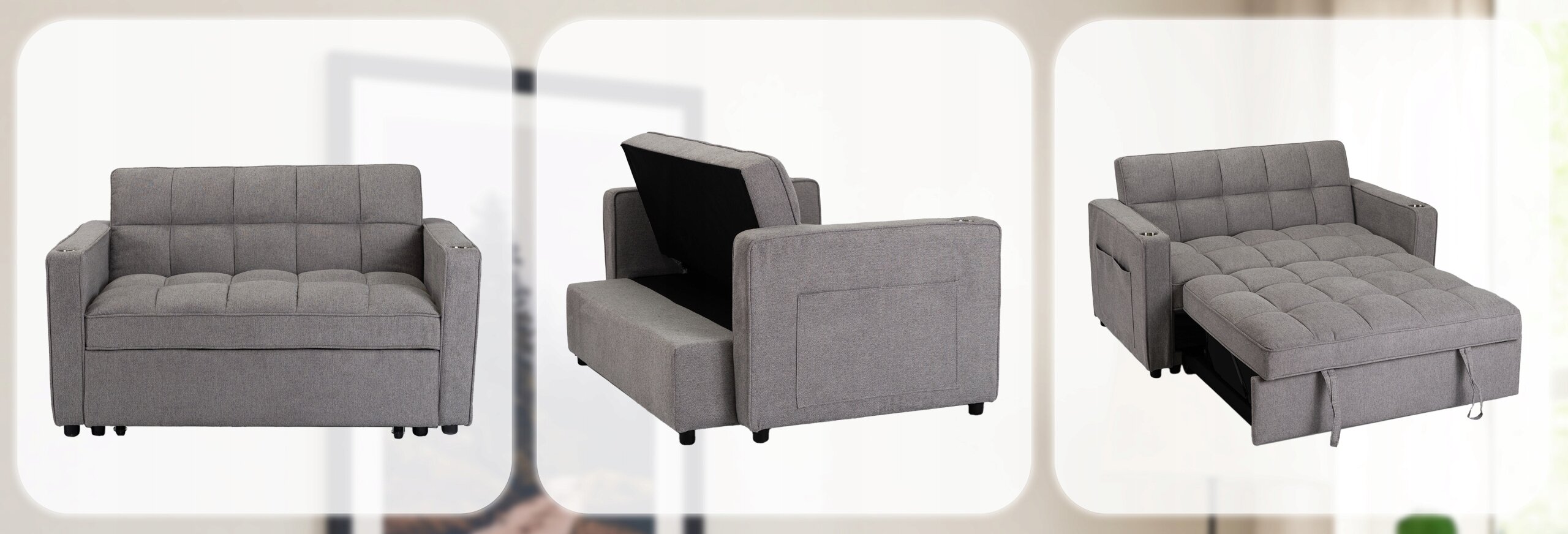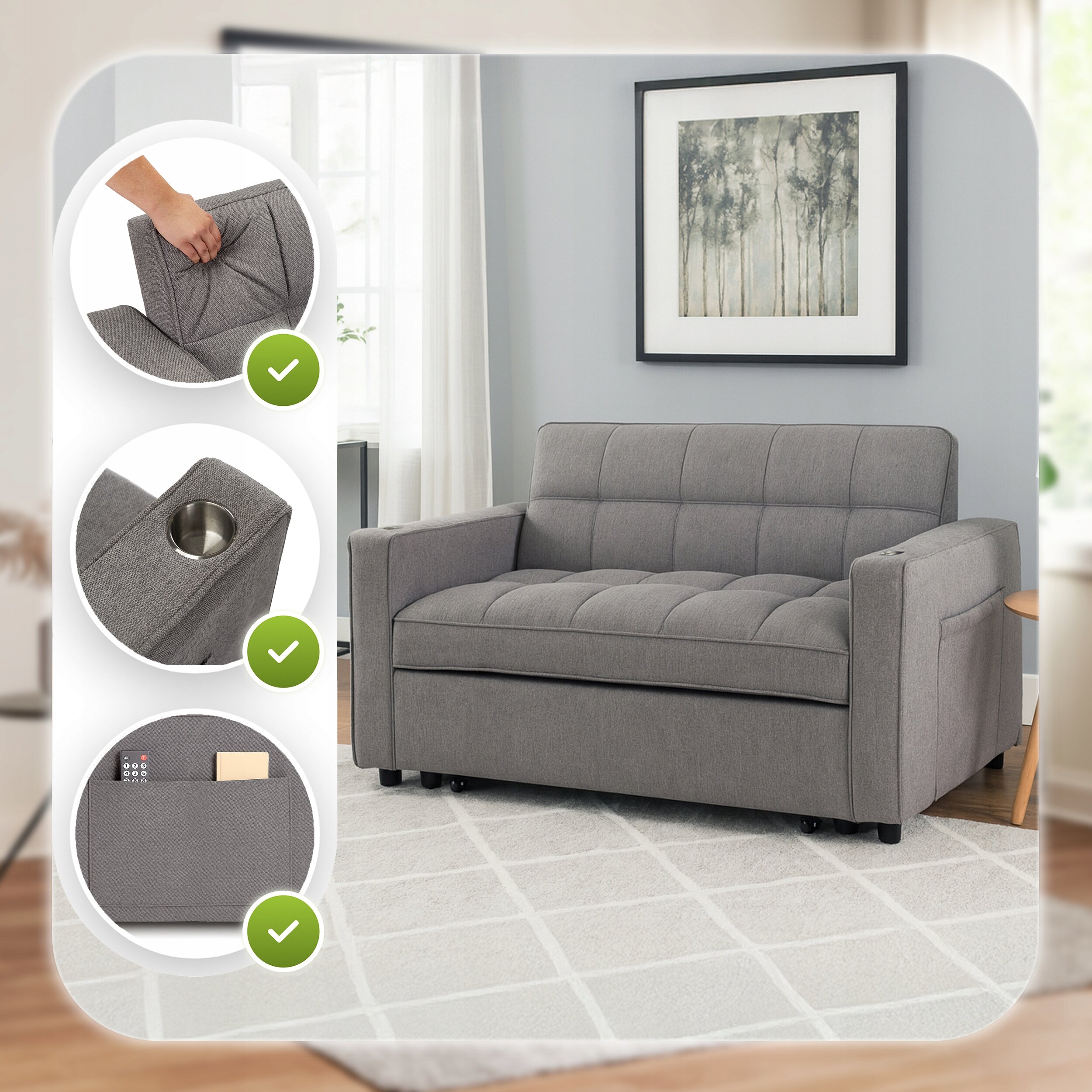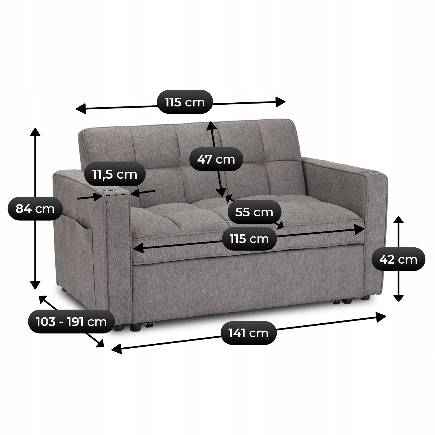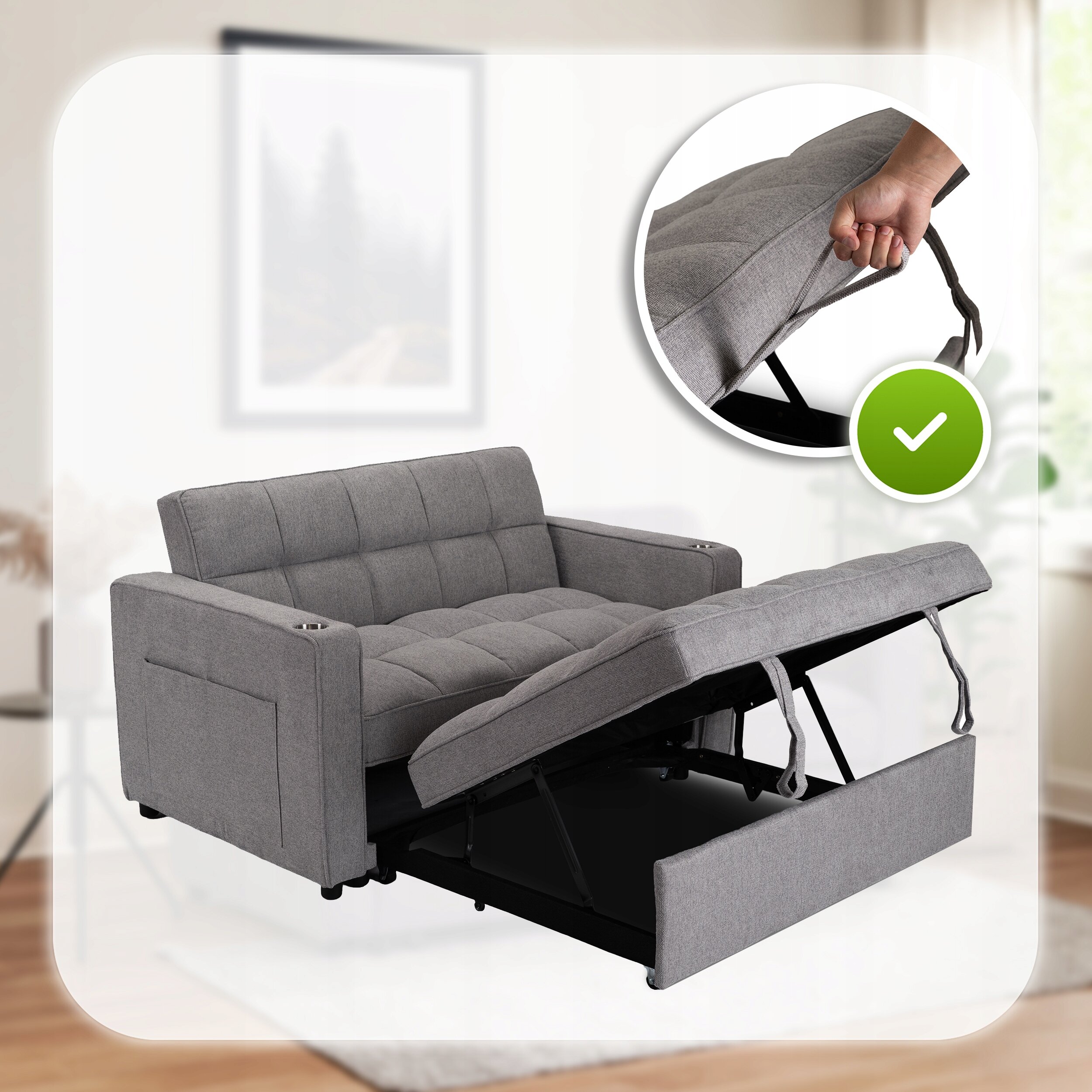 Obicie z wytrzymałej tkaniny jest łatwe w pielęgnacji, a miękkie wypełnienie gwarantuje komfort siedzenia i spania. Całość uzupełniają praktyczne dodatki – boczne kieszenie oraz uchwyt na napoje w podłokietniku.