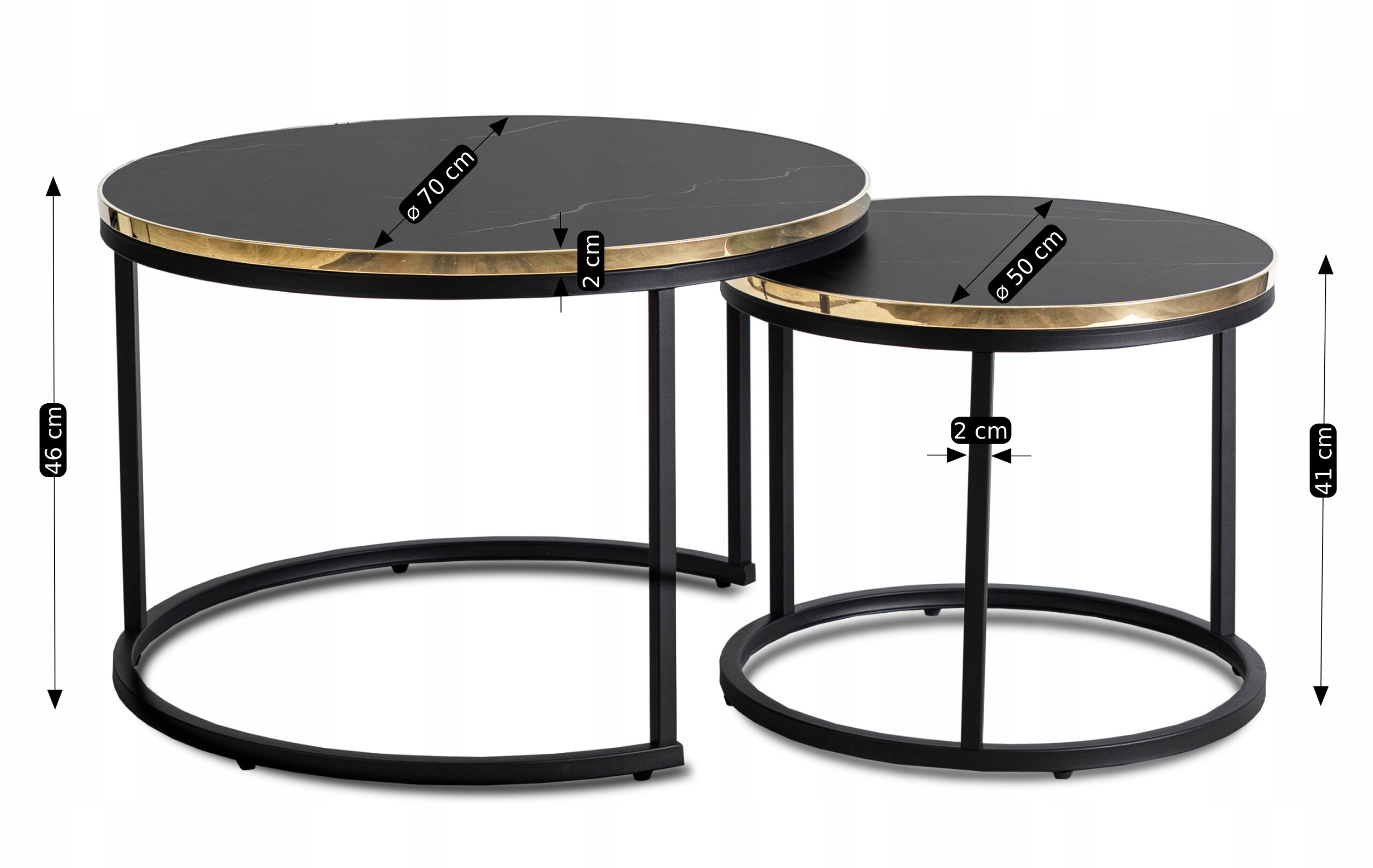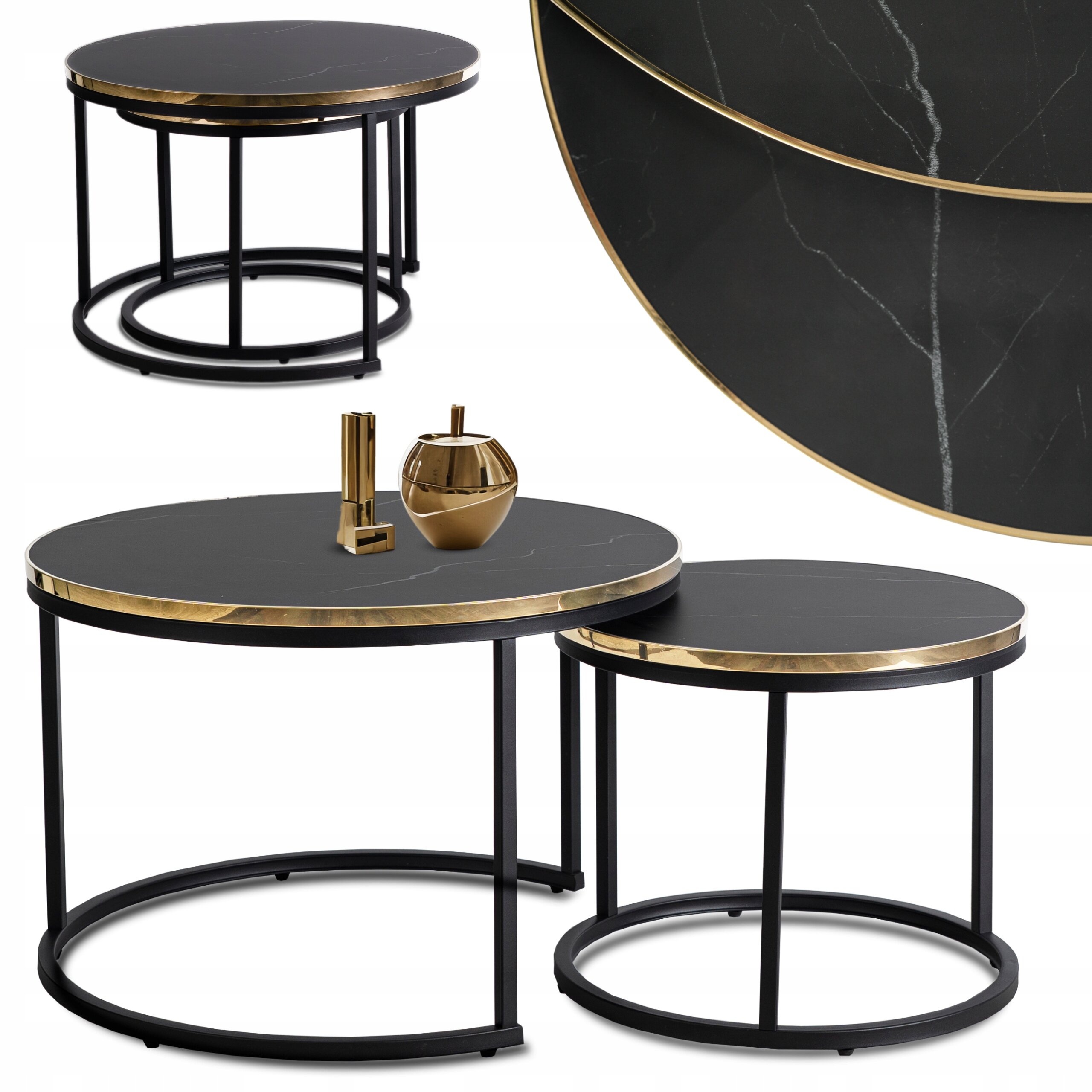 Stolik Kawowy Okrągły Marmur Czarny Zestaw 2w1 Ława Glamour Złoty ARON ⭐⭐⭐⭐⭐