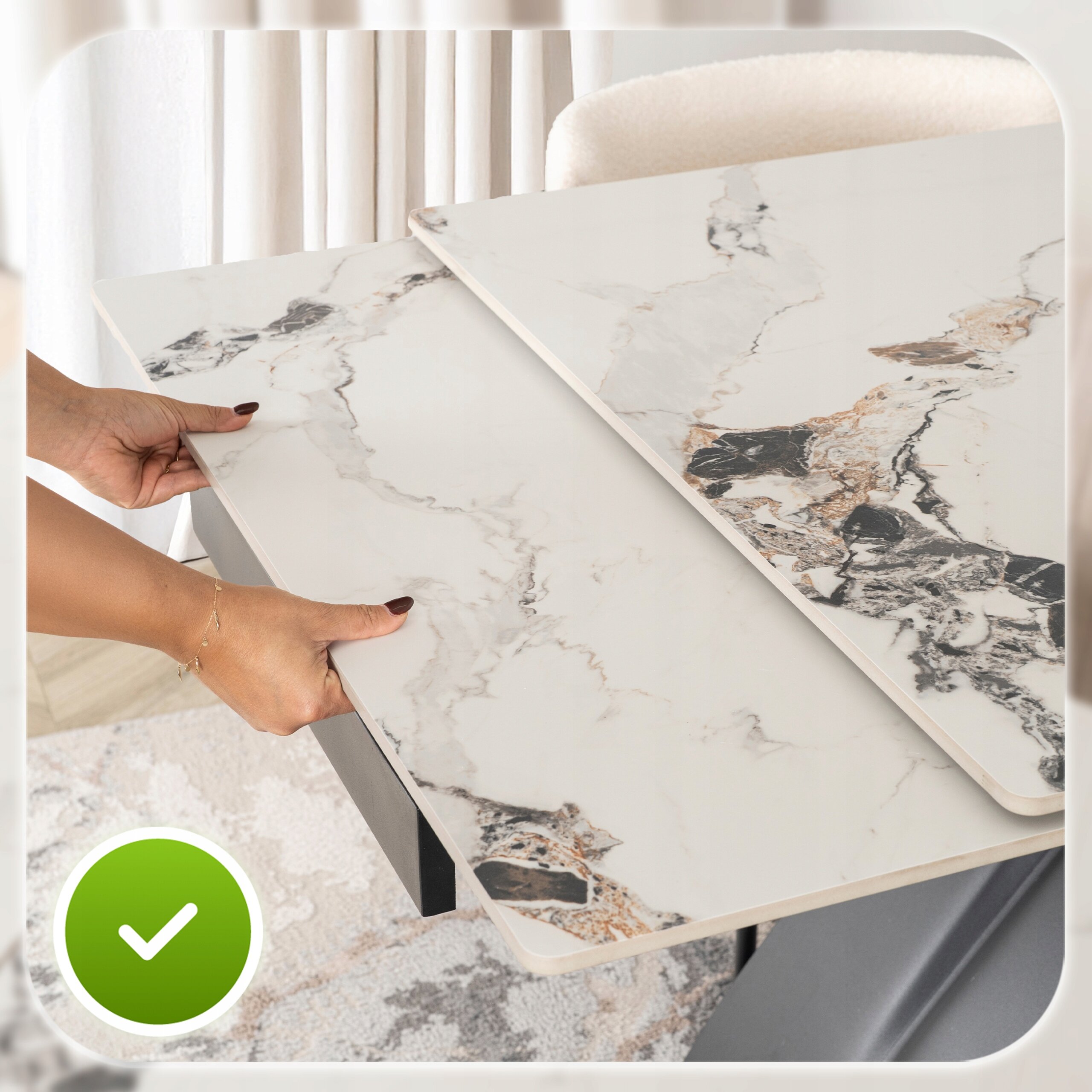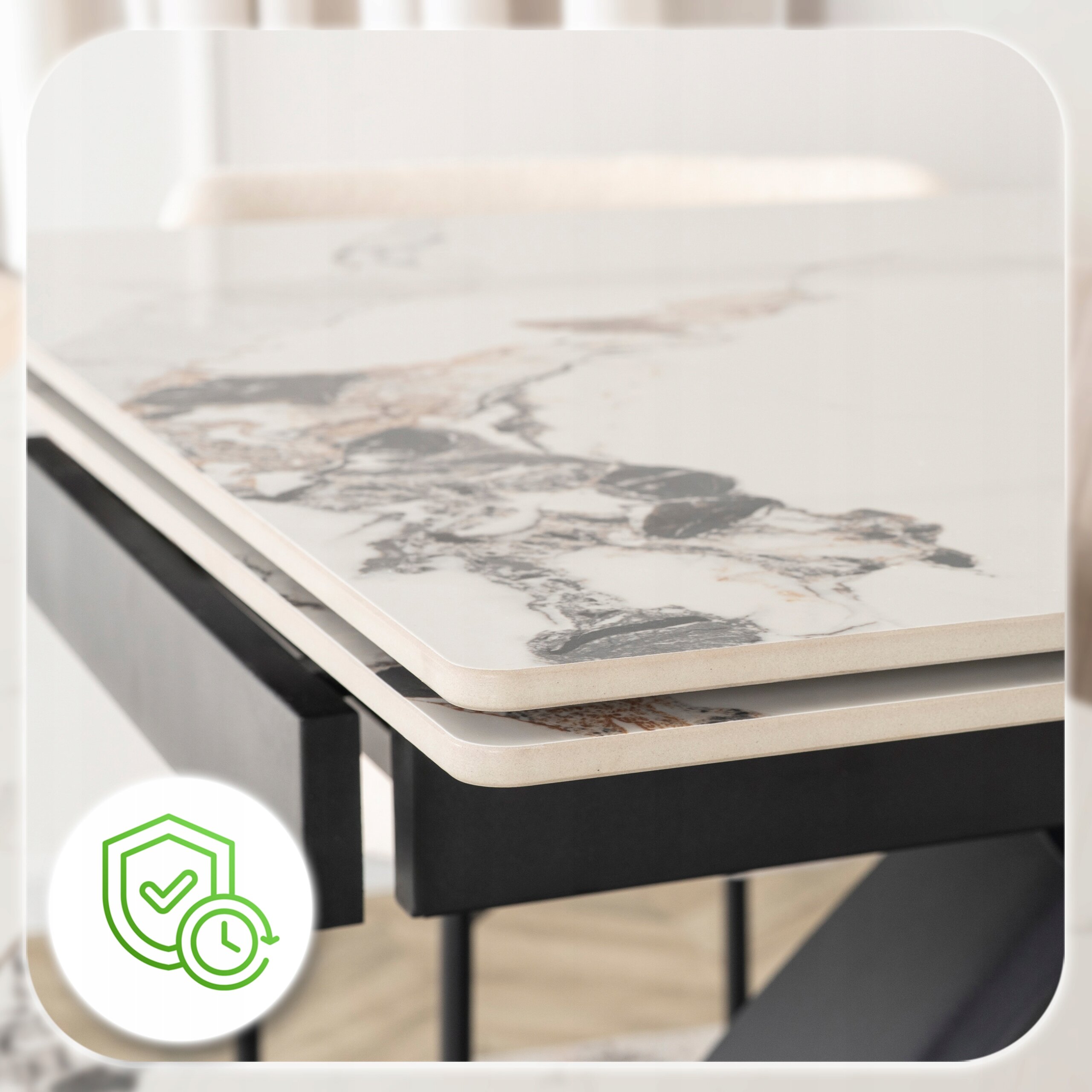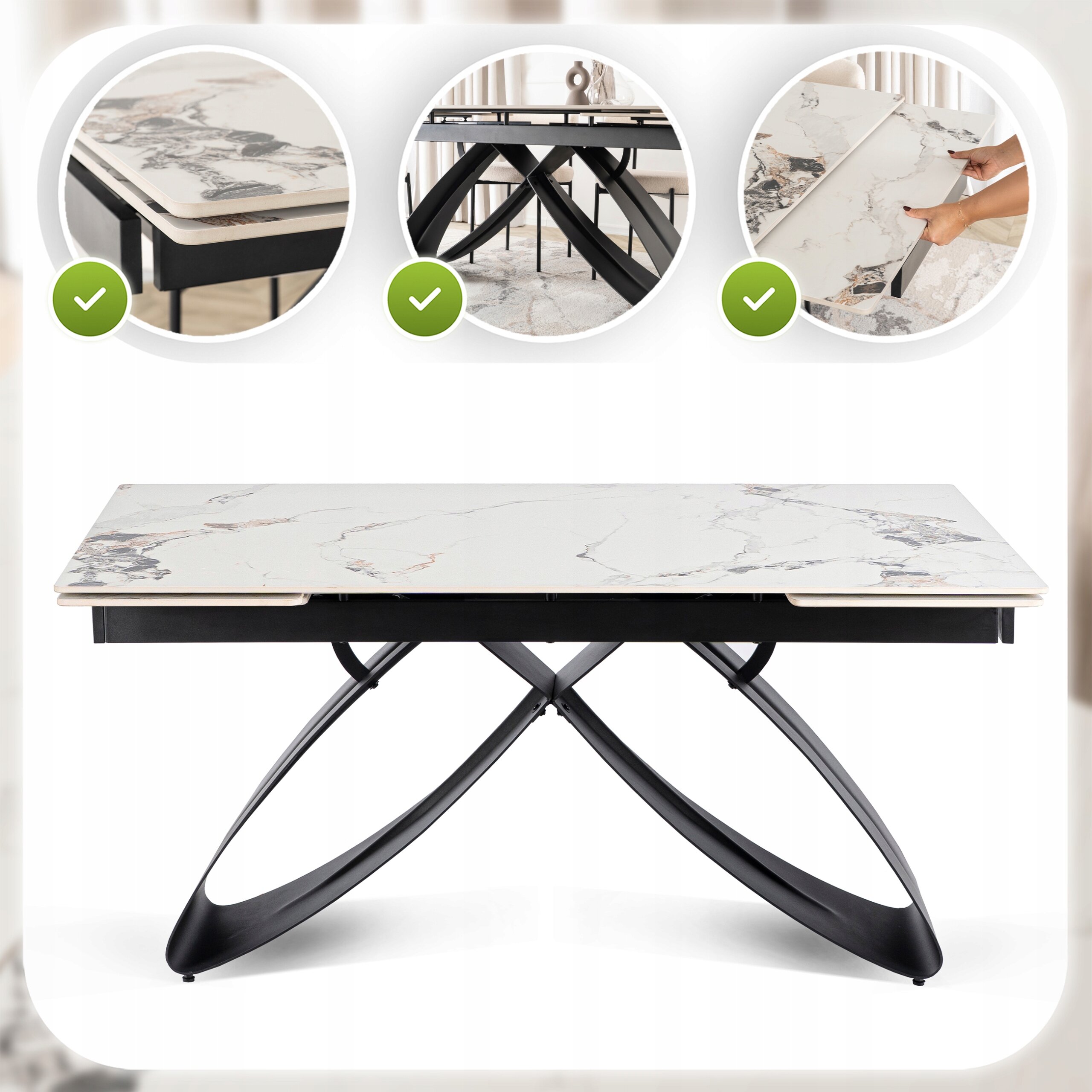 - Ceramika klasy premium – blat stołu jest niezwykle trwały, odporny na zarysowania i wysokie temperatury.