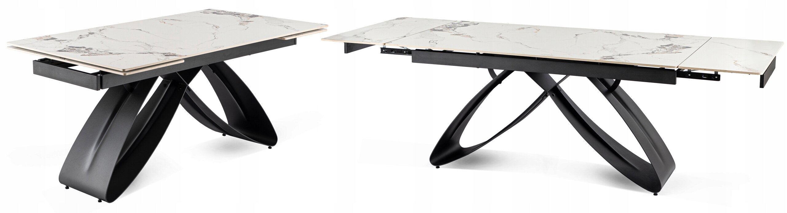 - Mechanizm rozkładania do 240 cm – stół wyposażono w dwie dyskretnie ukryte wkładki, które płynnie wysuwają się na prowadnicach po obu stronach blatu.