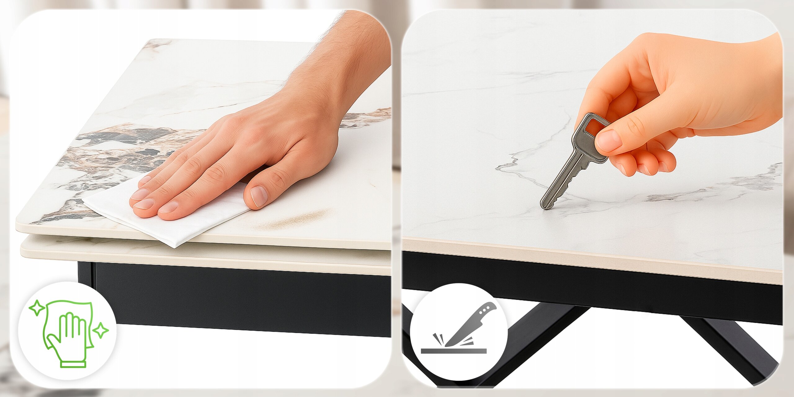 - Odporność na zarysowania - Nasz ceramiczny blat nie boi się codziennych wyzwań – klucze, naczynia, akcesoria kuchenne.