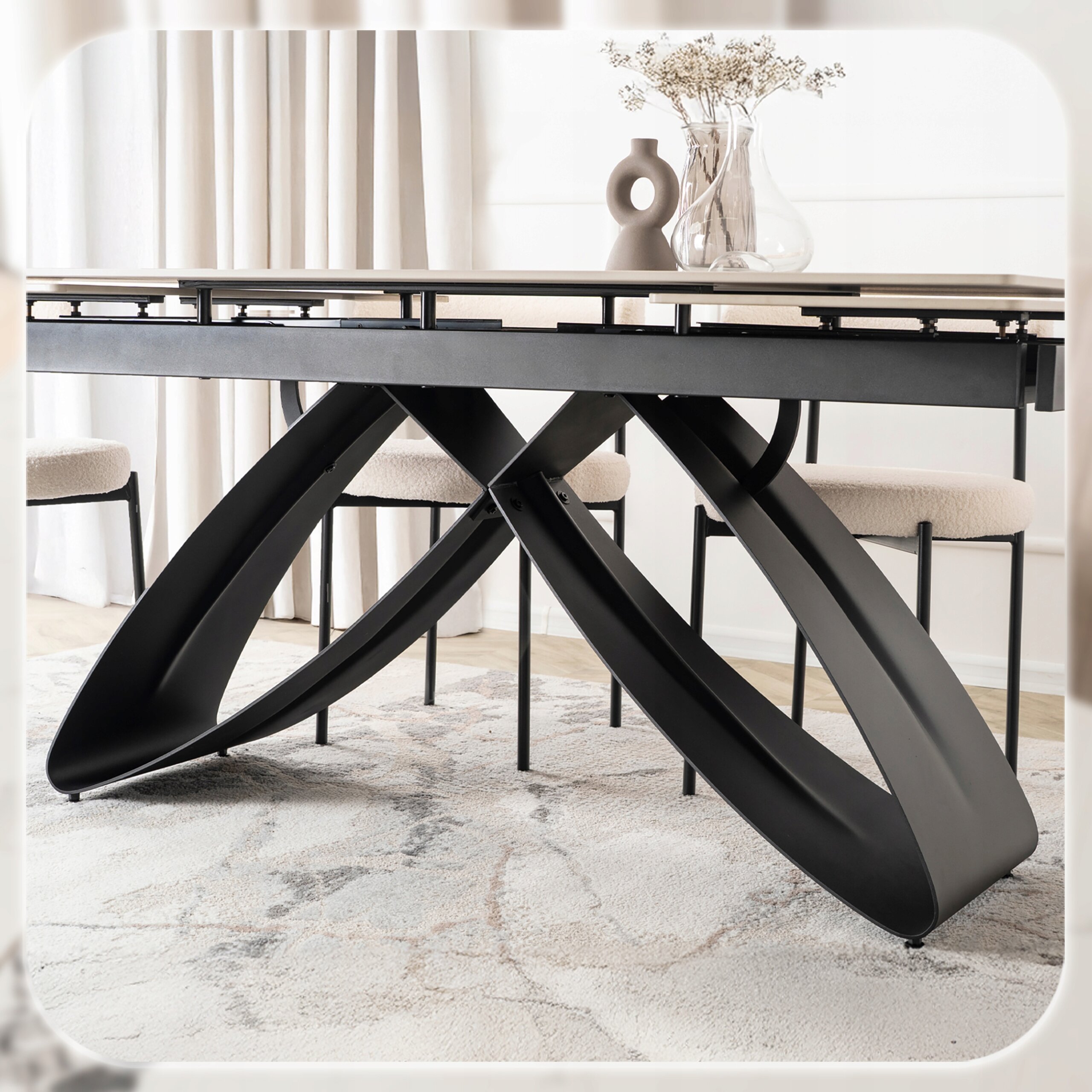 Stylowa podstawa stołu wykonana z wysokiej jakości metalu w kolorze czarnym. Jej nowoczesny, geometryczny design nie tylko zachwyca wyglądem, ale również zapewnia stabilność i trwałość całej konstrukcji.