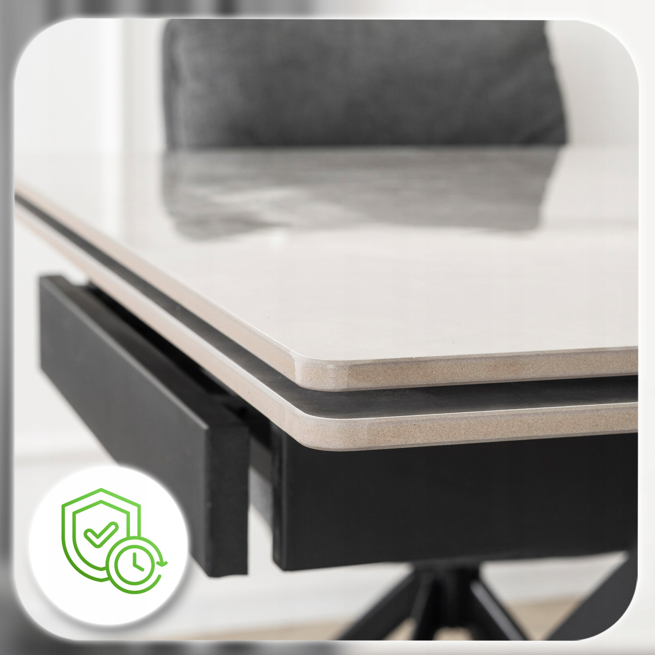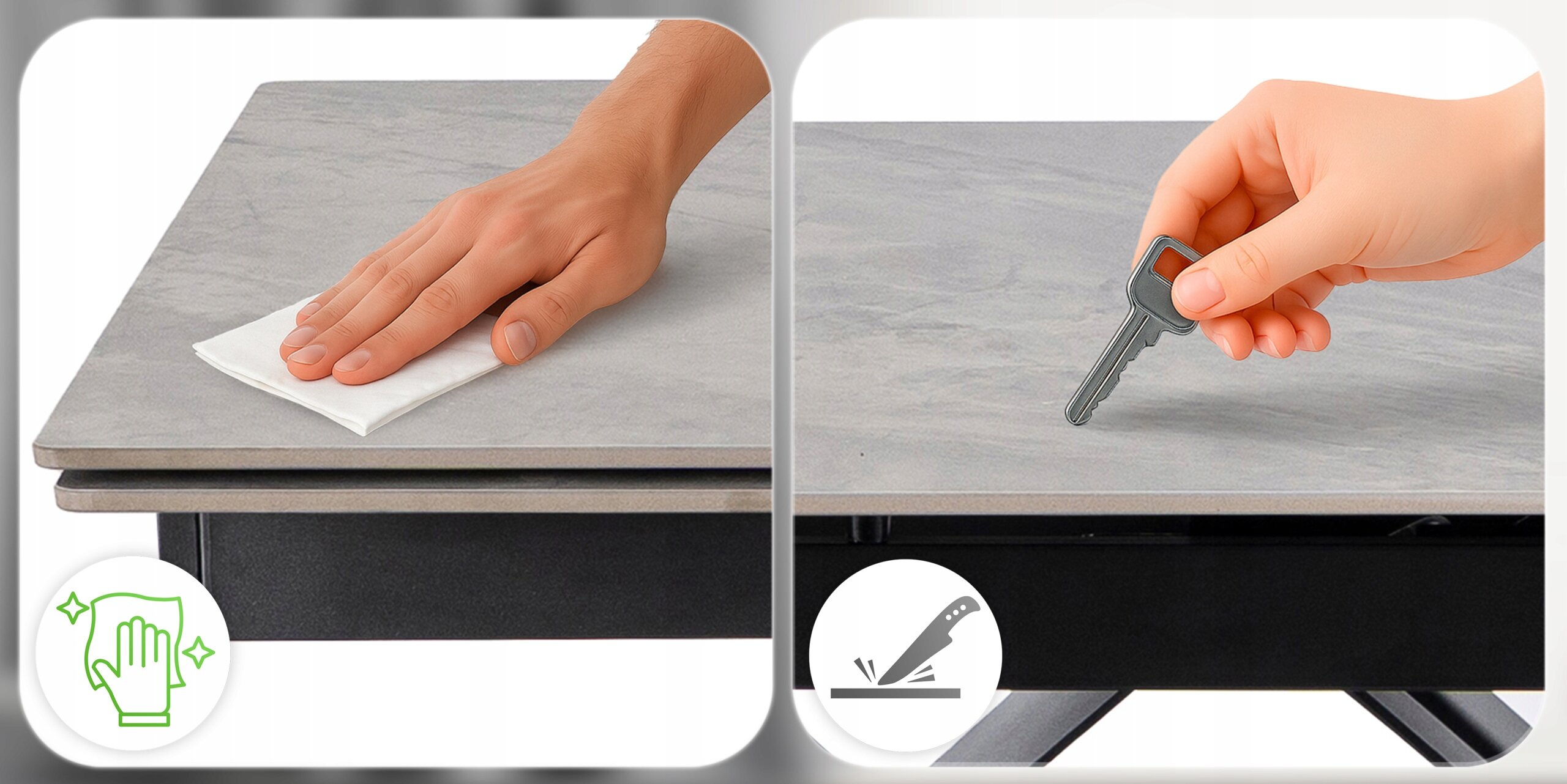 - Ceramika klasy premium – blat stołu jest niezwykle trwały, odporny na zarysowania i wysokie temperatury.