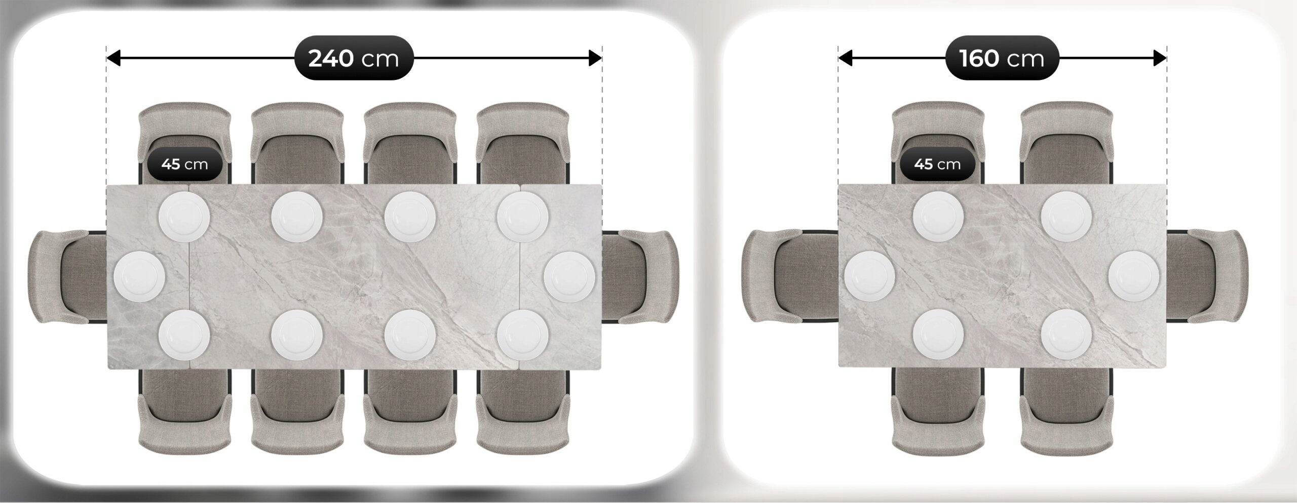 Po rozłożeniu do 240 cm stół pomieści nawet 10 osób, zapewniając każdemu wygodną przestrzeń. To idealne rozwiązanie na święta, przyjęcia i większe spotkania rodzinne.