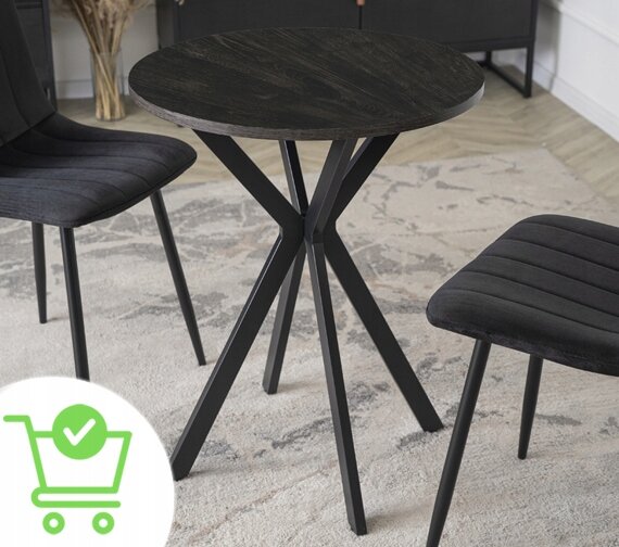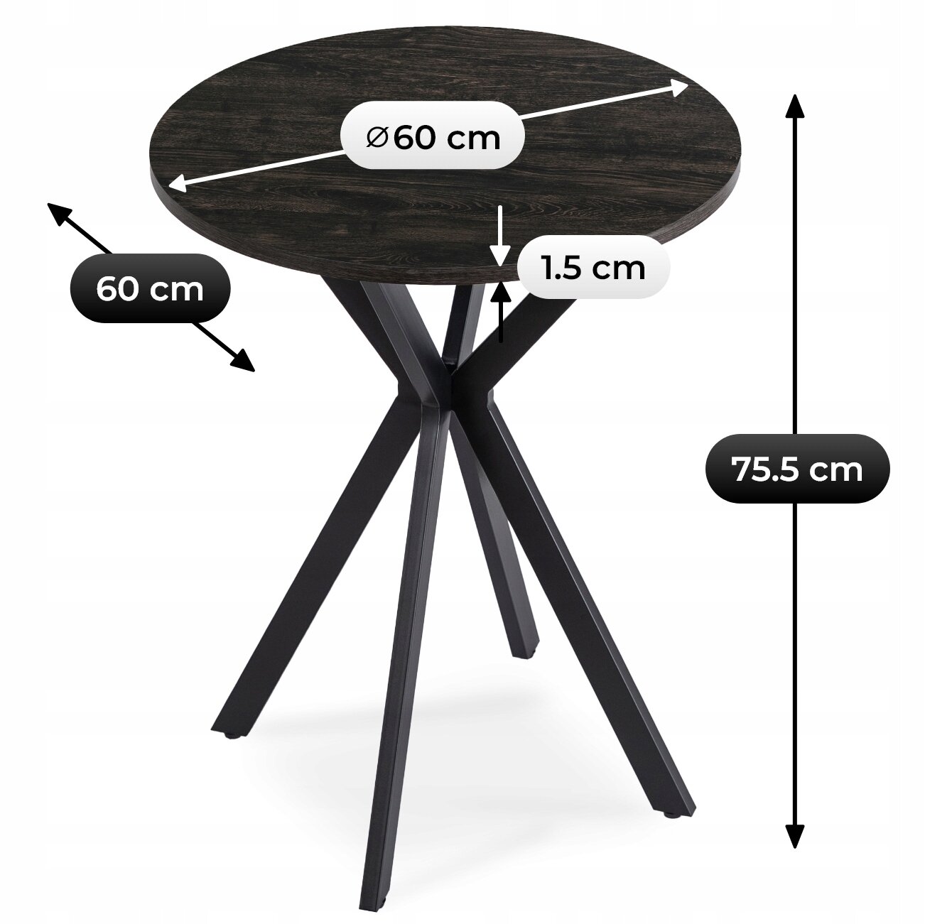 Stół o wymiarach 60 x 60 x 75,5 cm to idealny wybór do jadalni, kuchni lub salonu. Jego okrągły blat w odcieniu czarnym prezentuje się wyjątkowo stylowo nawiązując do estetyki industrialnej i loftowej. Stabilna podstawa w formie czarnych metalowych nóg krzyżowych dodaje mu charakteru.