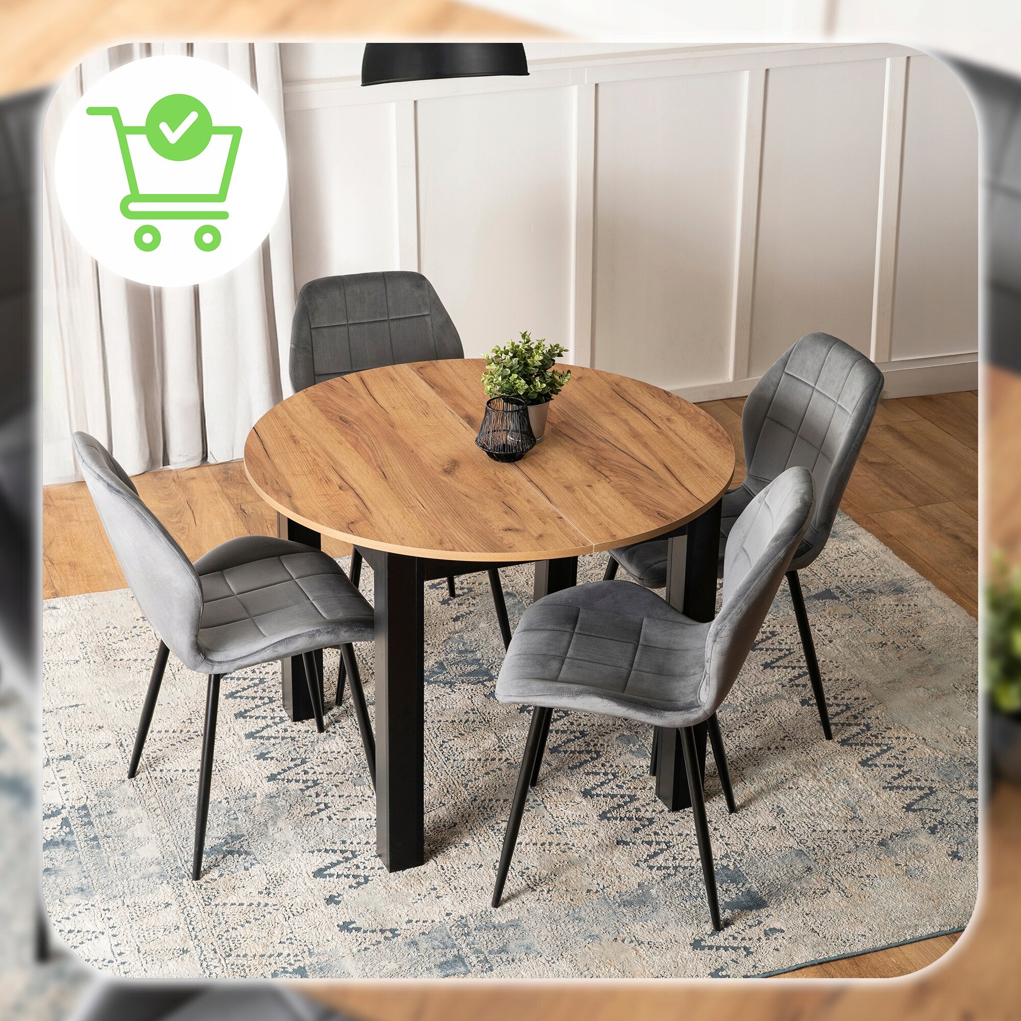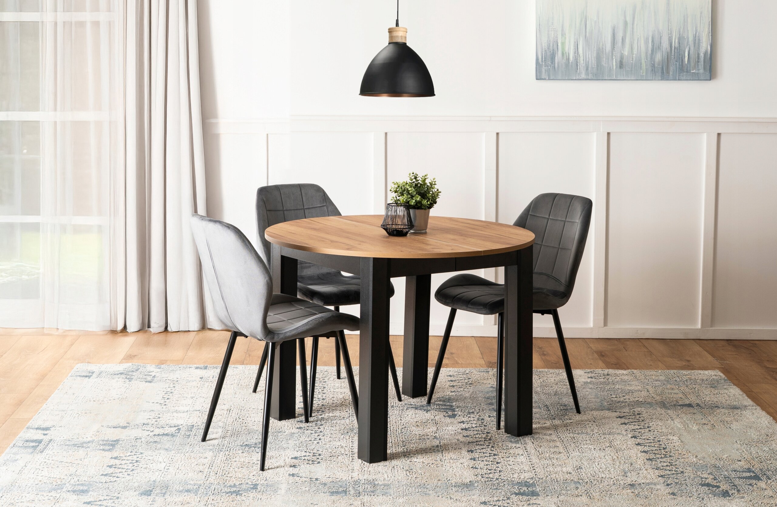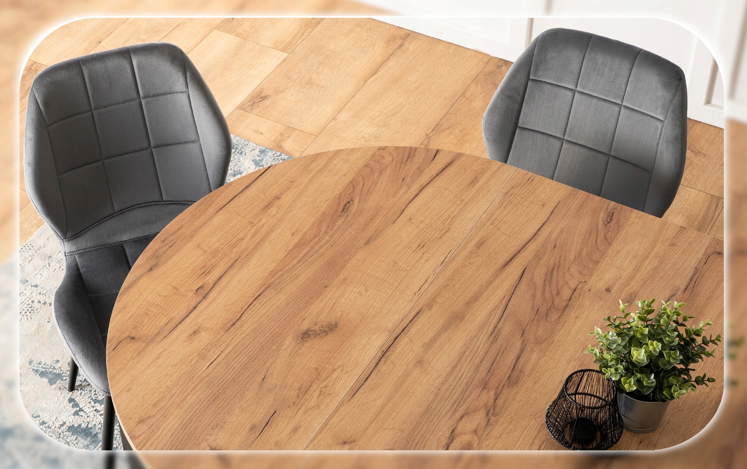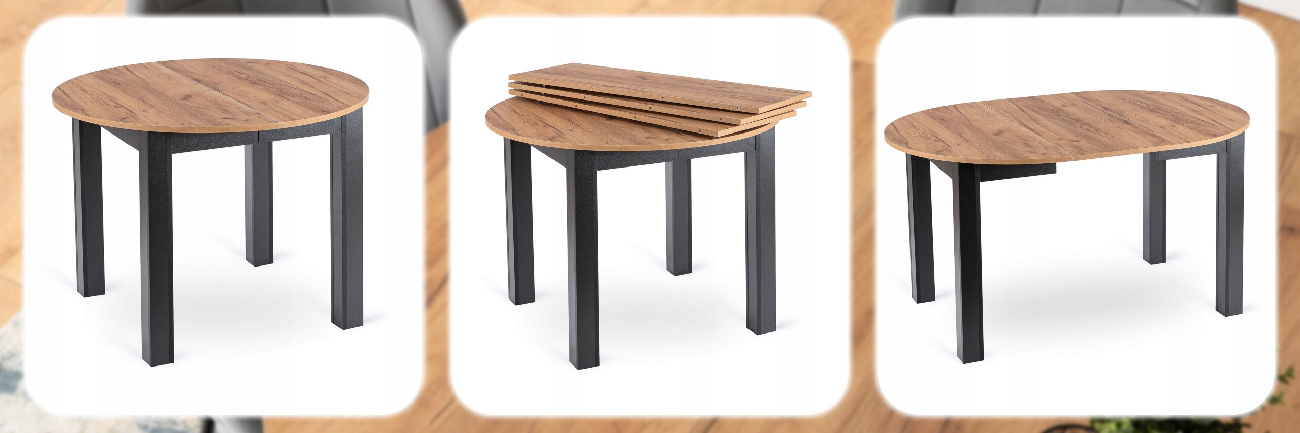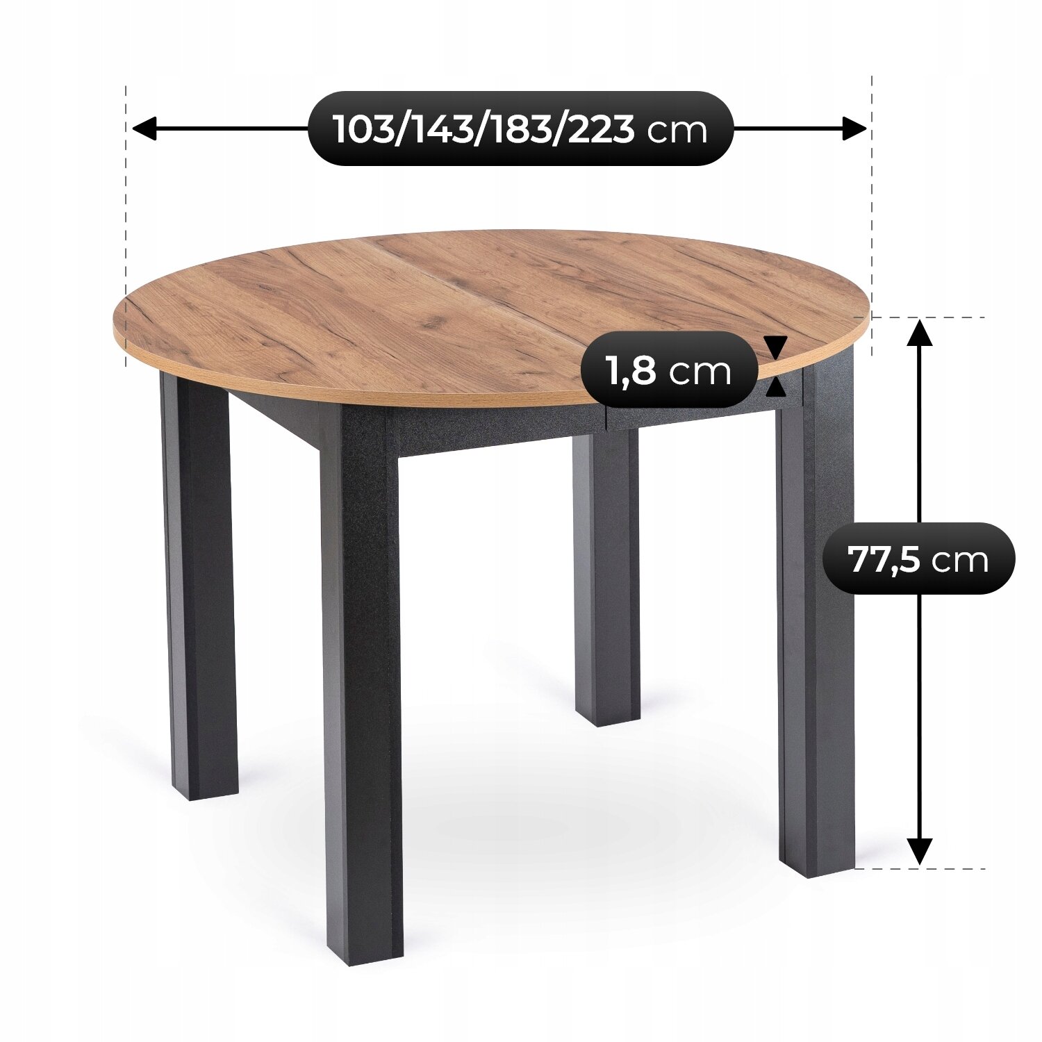 Na co dzień stół ma 103 cm średnicy, co czyni go kompaktowym i wygodnym do mniejszych przestrzeni. Dzięki praktycznemu mechanizmowi rozkładania i trzem wkładkom po 40 cm, z łatwością powiększysz jego powierzchnię aż do 223 cm.