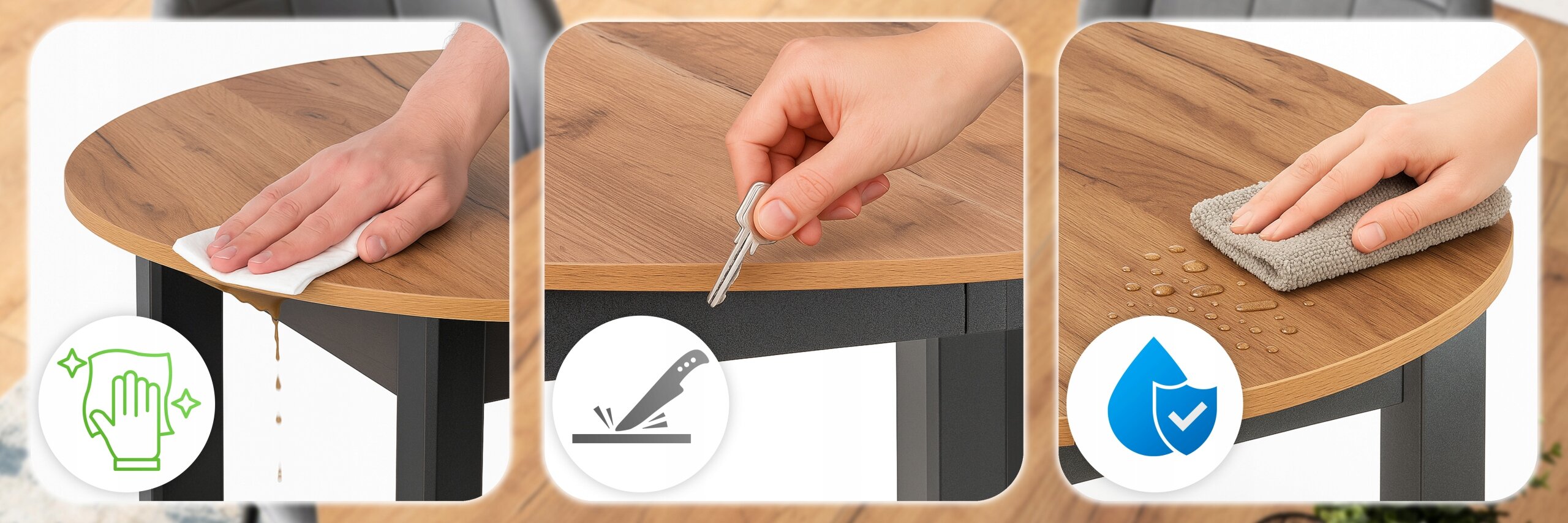 - Odporność na zarysowania – powierzchnia stołu radzi sobie z codziennymi wyzwaniami, takimi jak kontakt z naczyniami czy drobnymi akcesoriami.
