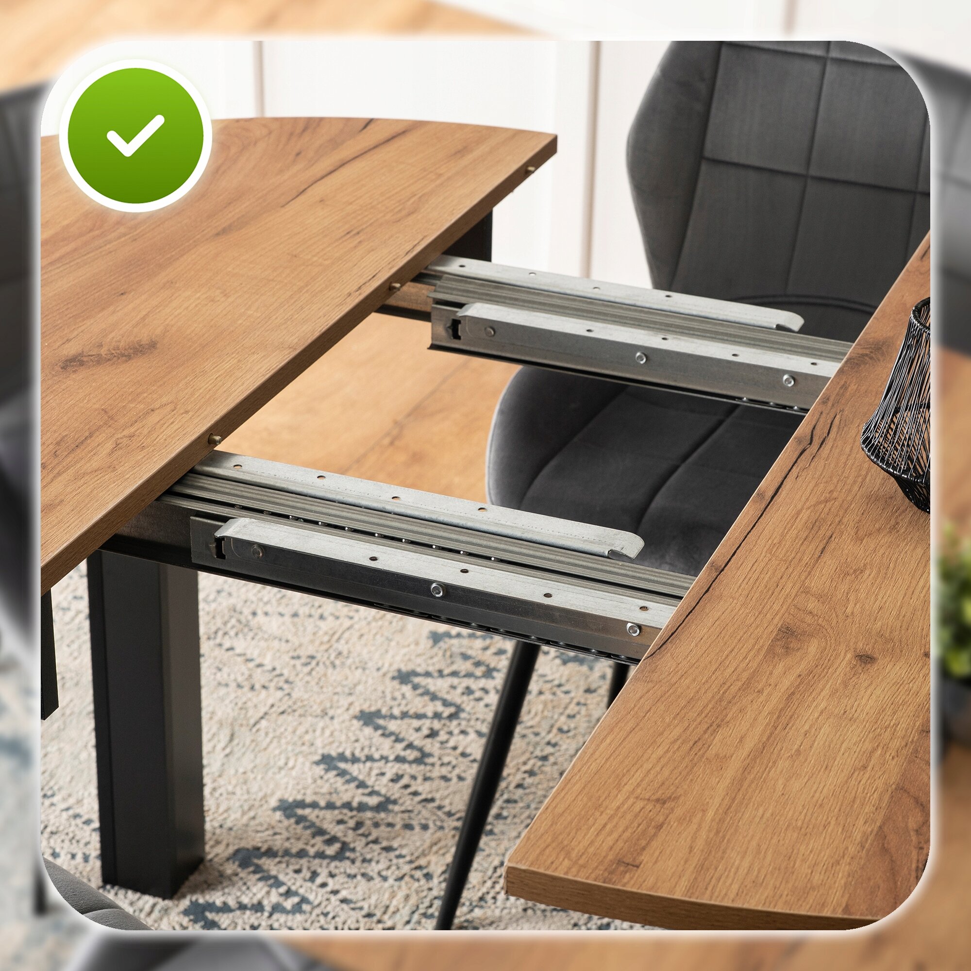 Stół JAMES został wyposażony w praktyczny i wygodny mechanizm rozkładania, który pozwala zwiększyć jego długość z 103 cm do imponujących 223 cm. Wszystko to dzięki trzem wkładkom po 40 cm, które płynnie wsuwają się na solidnych prowadnicach.