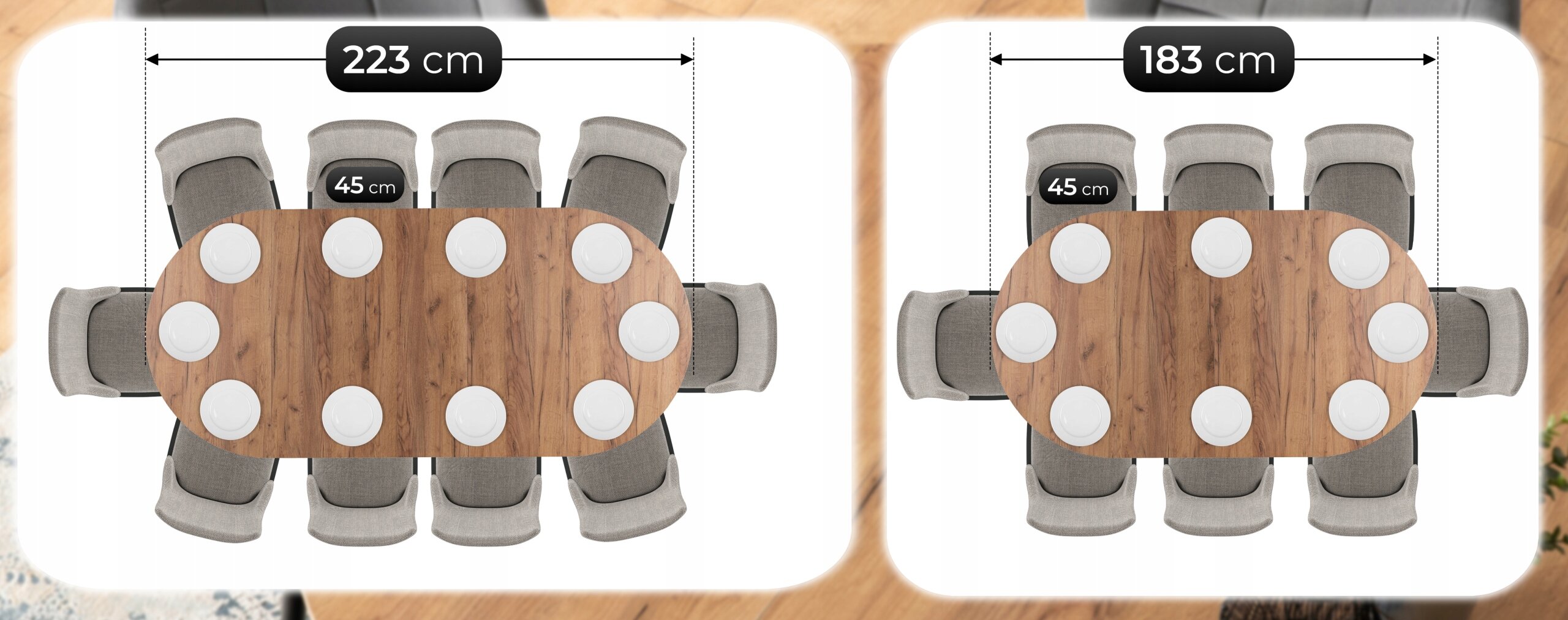 Po pełnym rozłożeniu do 223 cm stół pomieści nawet 10–12 osób, zapewniając każdemu wygodną przestrzeń. To idealne rozwiązanie na święta, przyjęcia i większe spotkania rodzinne.