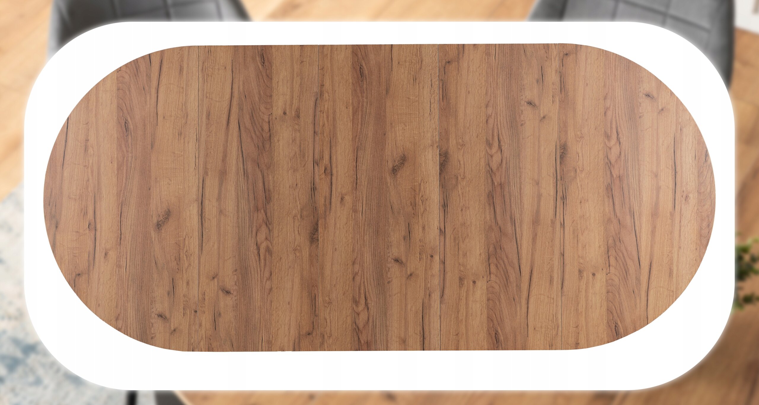 Blat ma matowe wykończenie imitujące naturalne drewno, które minimalizuje widoczność śladów. Ewentualne zabrudzenia można łatwo usunąć wilgotną ściereczką – nie potrzeba specjalnych preparatów.