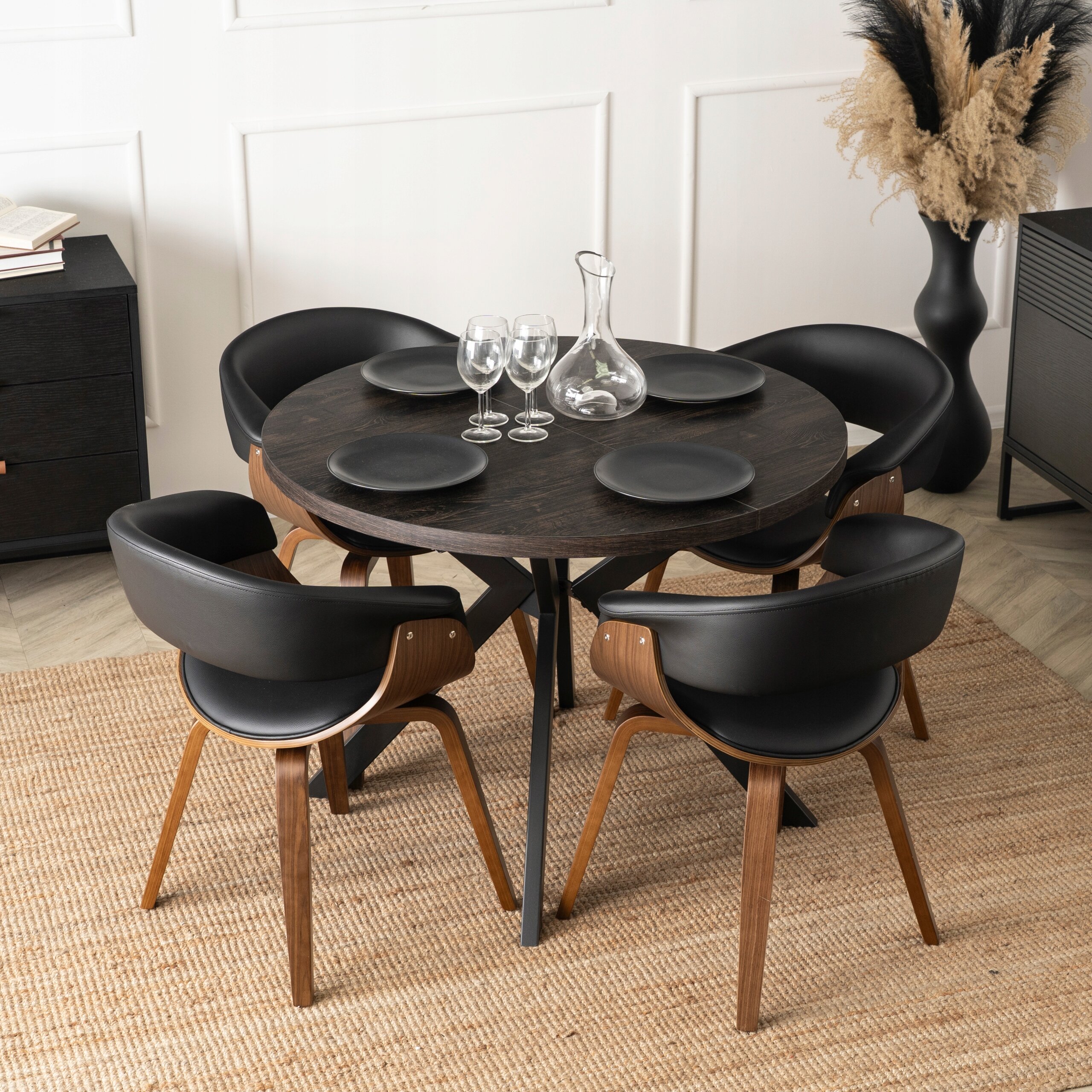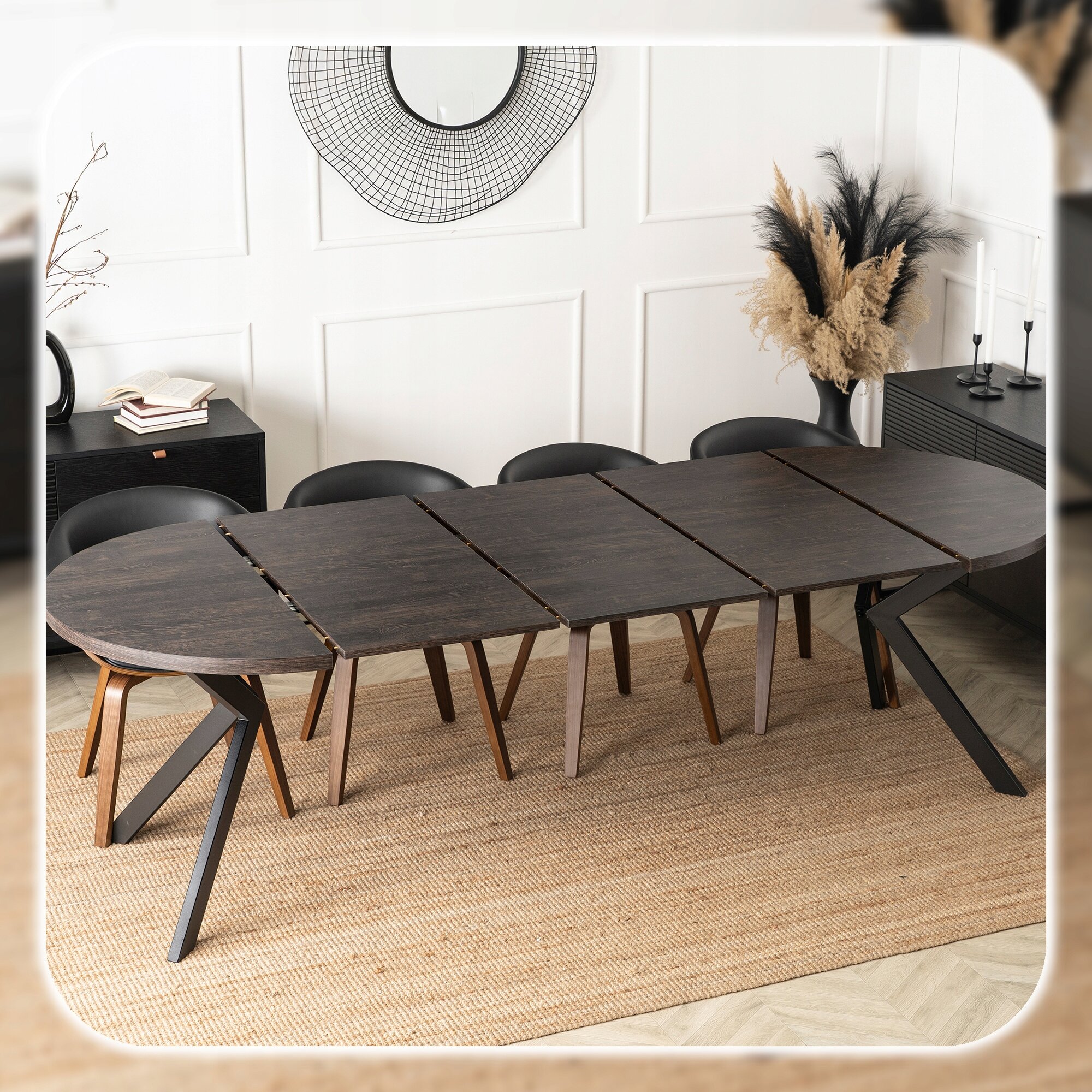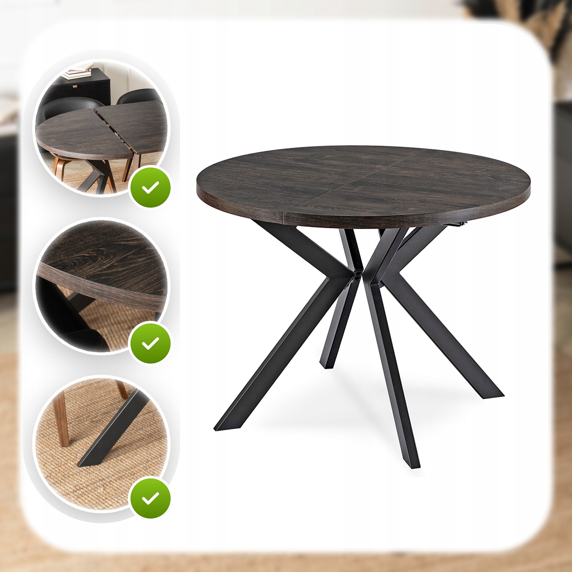Jego rozsuwany, okrągły blat w kolorze czarnego dębu zachwyca naturalnym nowoczesnym designem, doskonale komponując się z różnymi aranżacjami wnętrz.