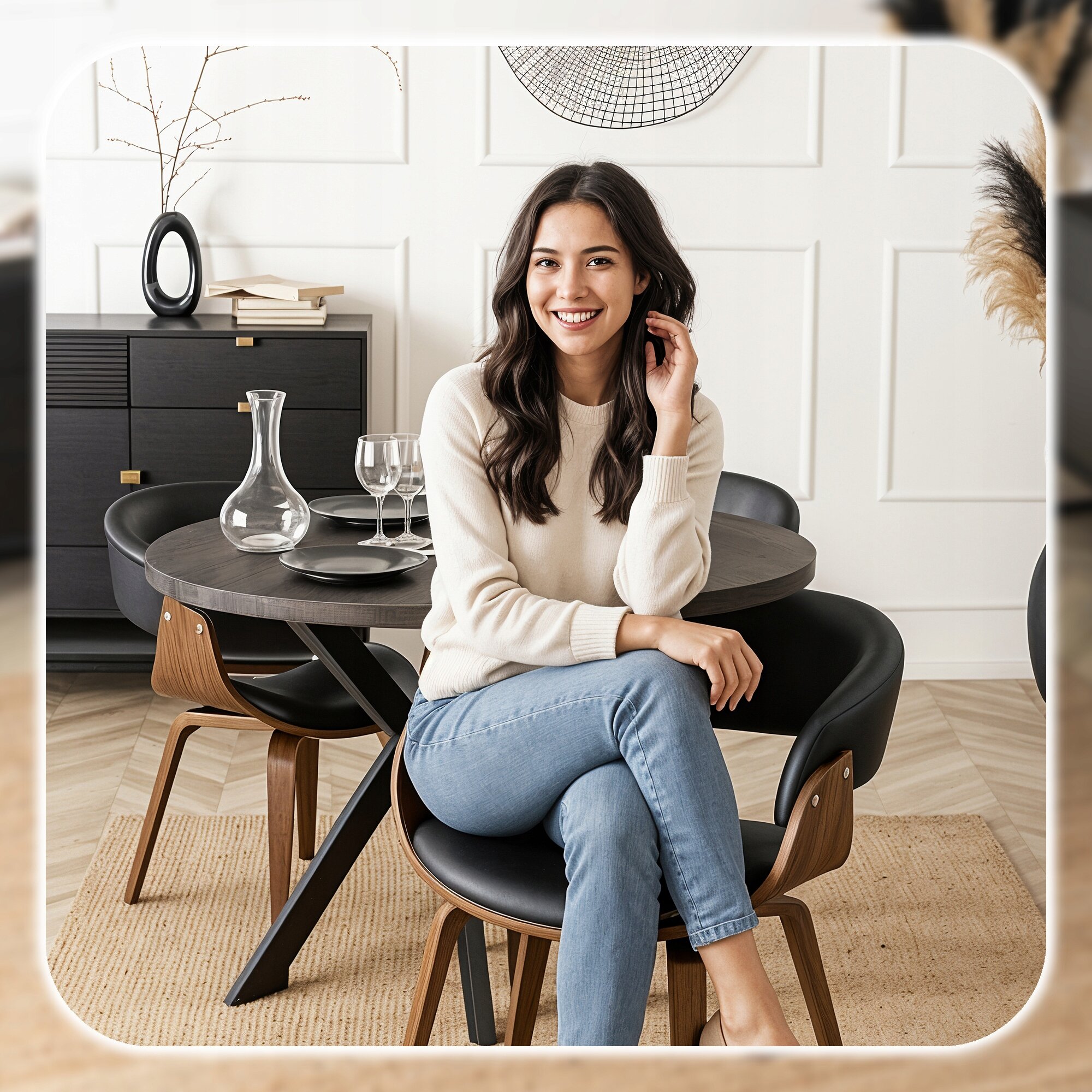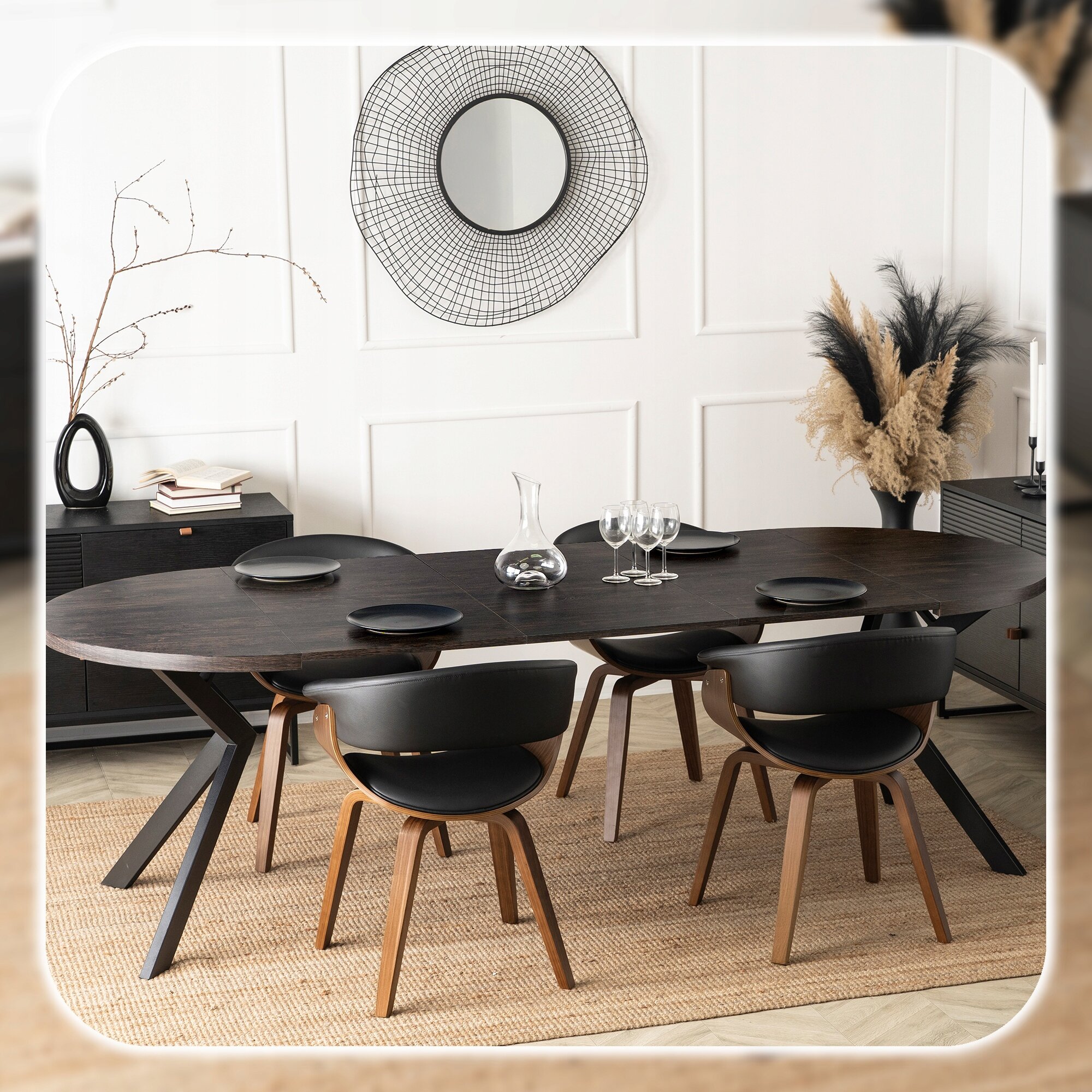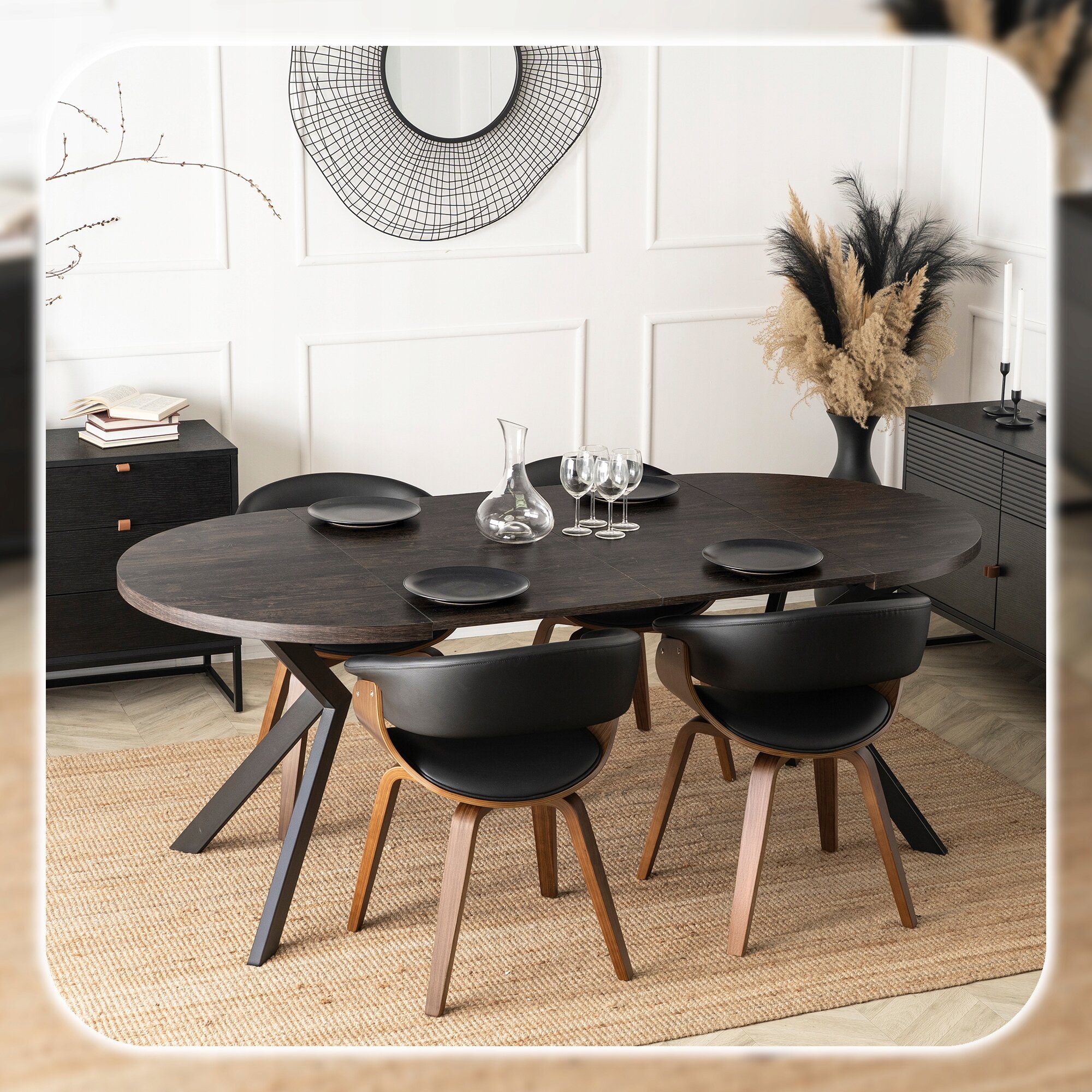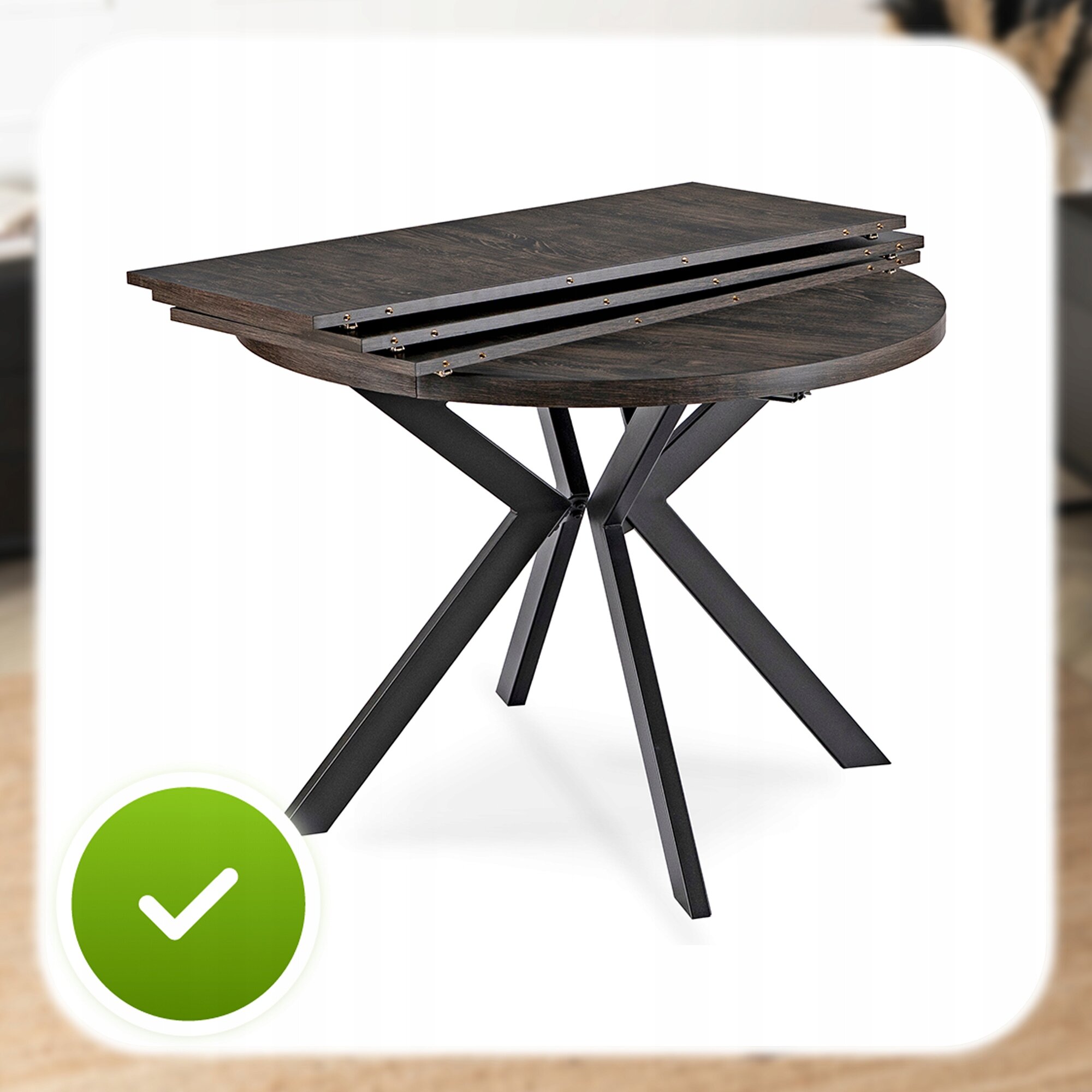 Jego rozsuwany, okrągły blat w kolorze czarnego dębu zachwyca naturalnym nowoczesnym designem, doskonale komponując się z różnymi aranżacjami wnętrz.