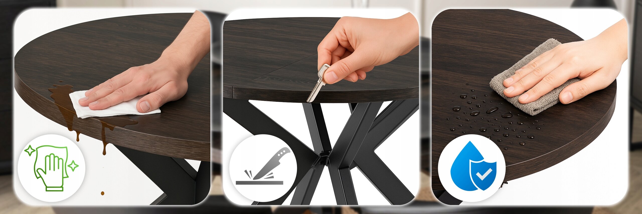 - Odporność na codzienne użytkowanie – solidna płyta MDF gwarantuje stabilność i długą żywotność stołu, nawet przy częstym rozkładaniu.