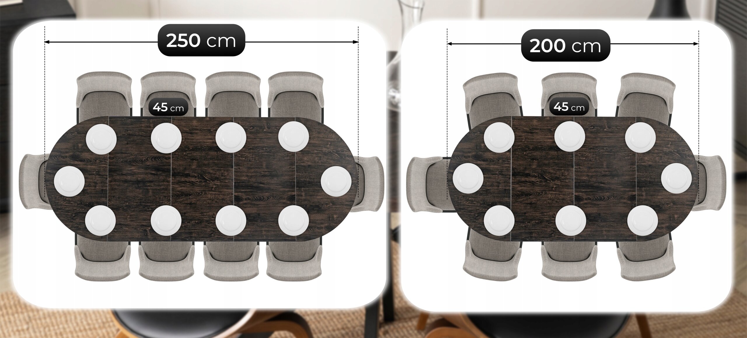 - Dla rodzin i osób lubiących spotkania w większym gronie – dzięki funkcji rozkładania (100/150/200/250 cm) stół sprawdzi się zarówno podczas codziennych posiłków, jak i większych uroczystości.