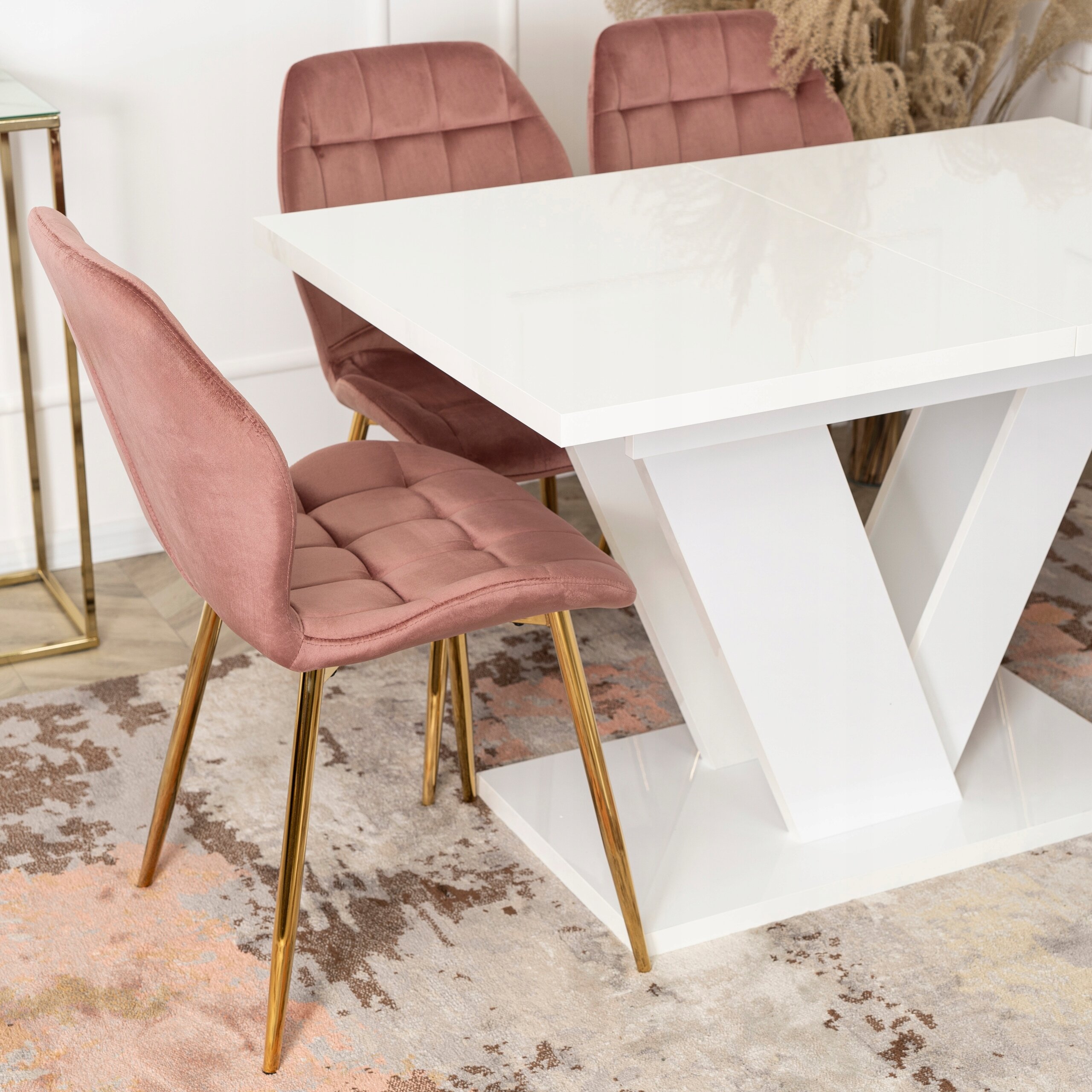Równie fantastycznie prezentują się profilowane nogi w kształcie litery V, osadzone na prostokątnej podstawie. Tak samo jak blat zostały wykonane płyty wiórowej w kolorze biały połysk.