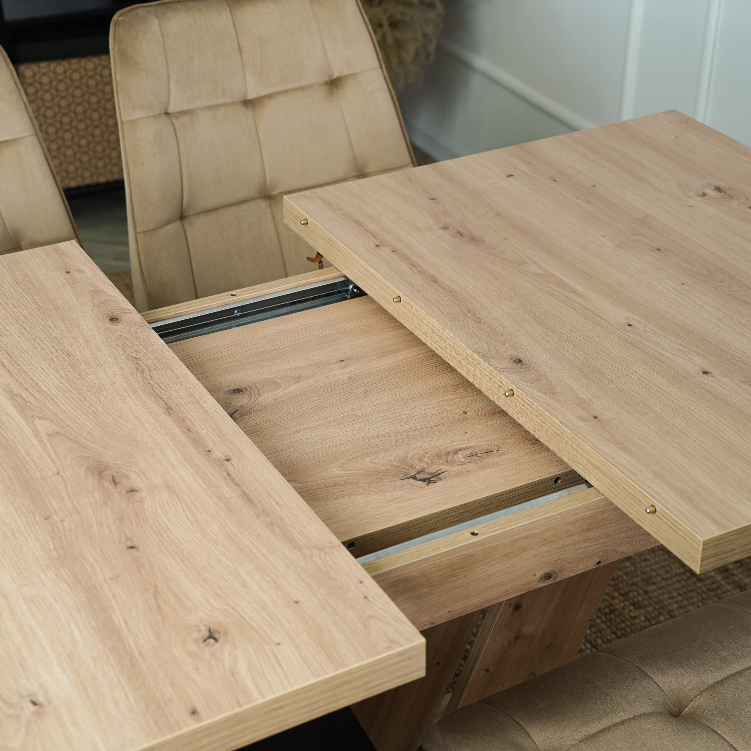 Elegancki i trwały. Prostokątny blat z możliwością rozkładania wykonany jest z wysokiej jakości płyty wiórowej w kolorze dębu artisan z naturalnym wzorem drewna.