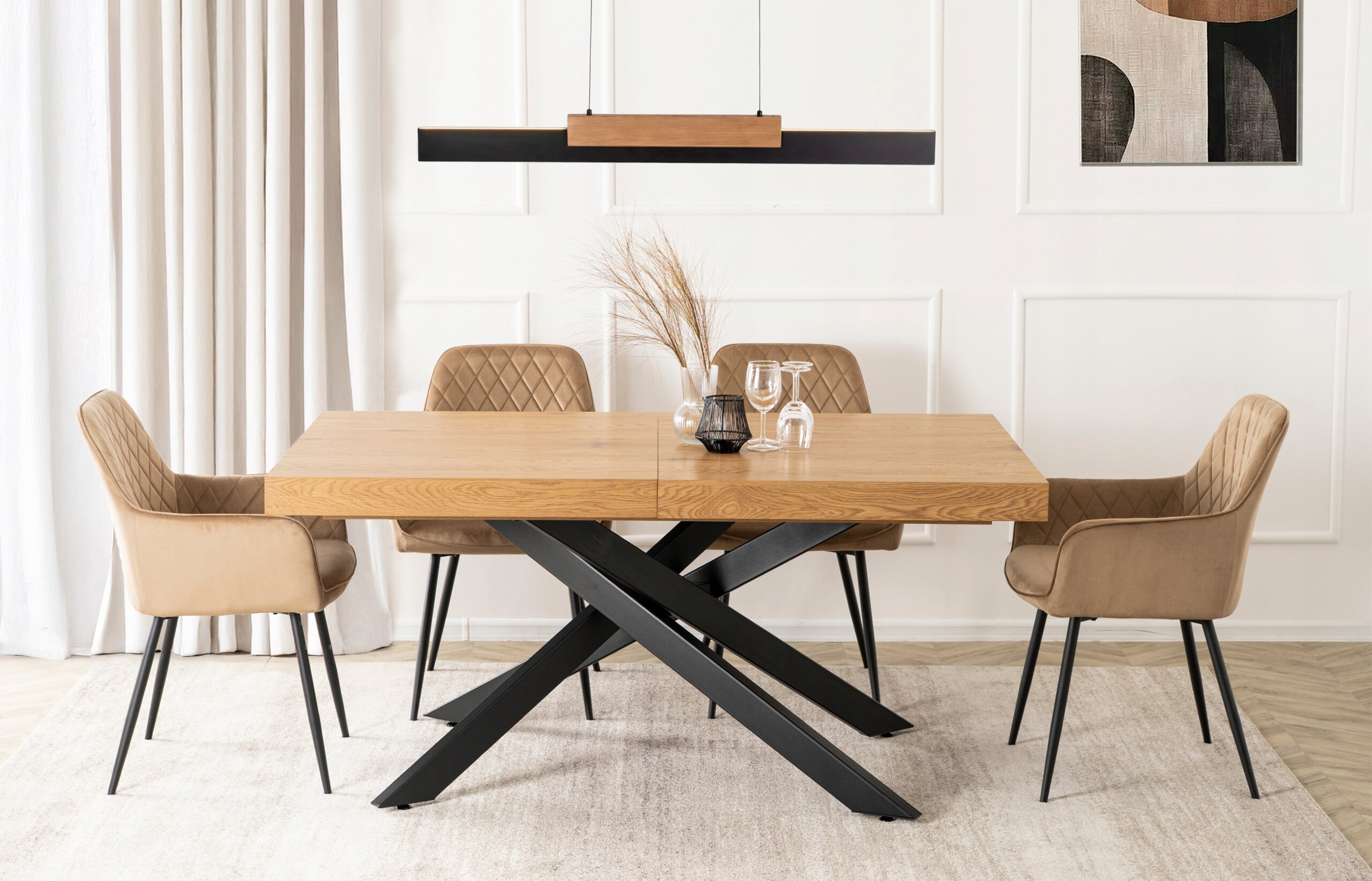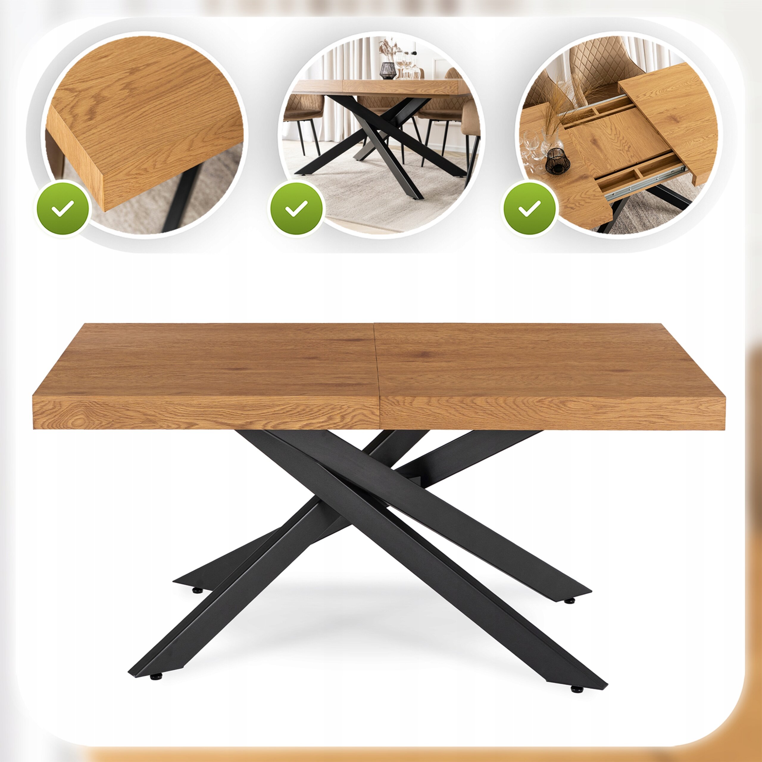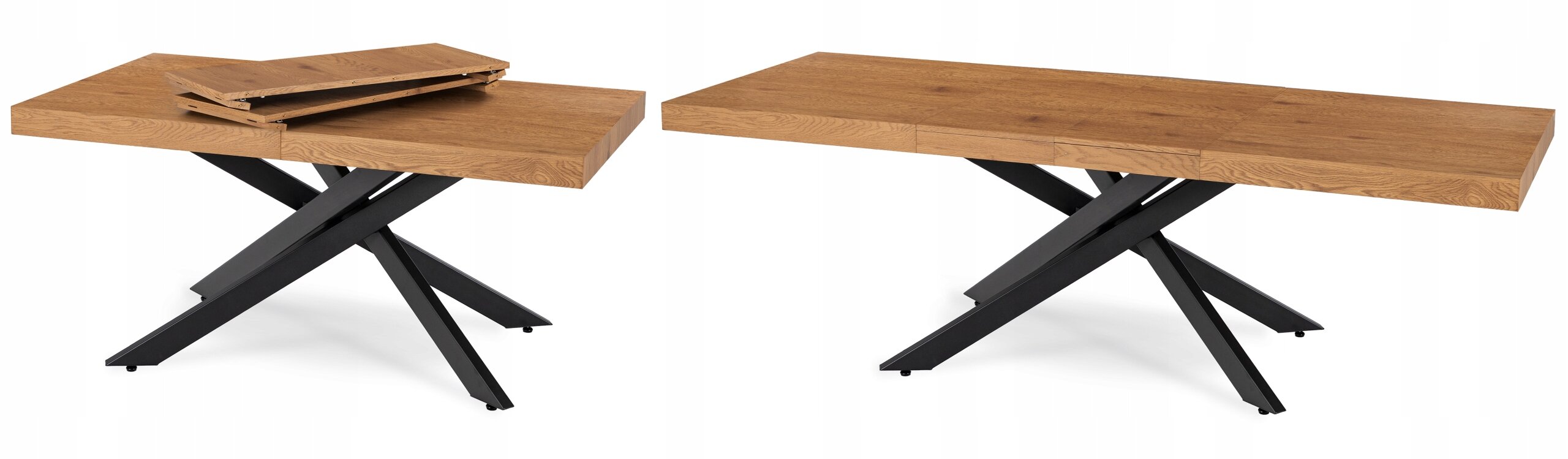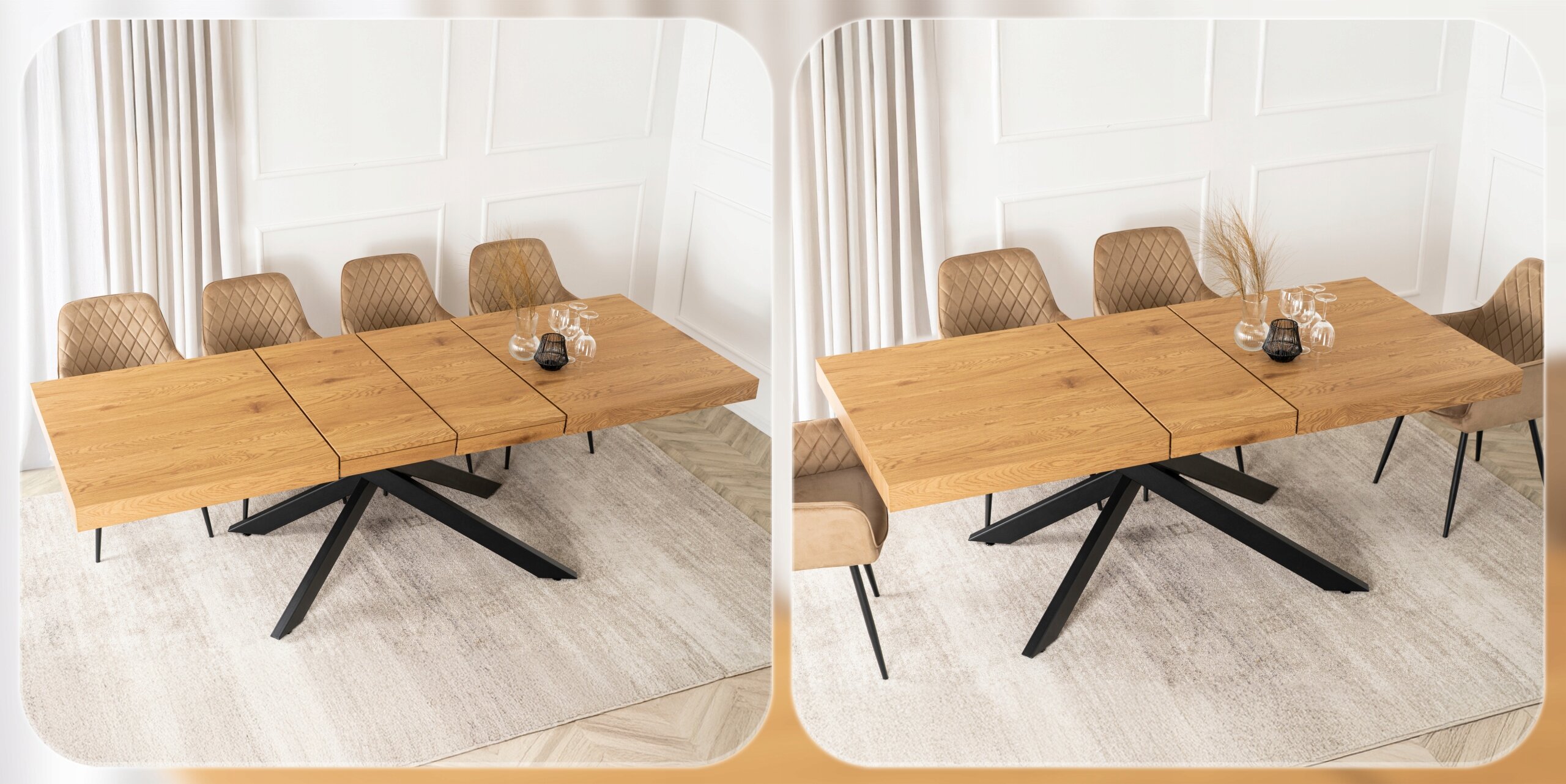 Stół HAMPTON to funkcjonalny i elegancki wybór do jadalni, salonu lub kuchni. Jego rozkładany blat w kolorze dębu zachwyca naturalnym nowoczesnym designem, doskonale komponując się z różnymi aranżacjami wnętrz. Stabilna podstawa w formie czarnych metalowych nóg nadaje mu wyjątkowego charakteru, a jednocześnie zapewnia trwałość i stabilność nawet przy maksymalnym rozłożeniu.