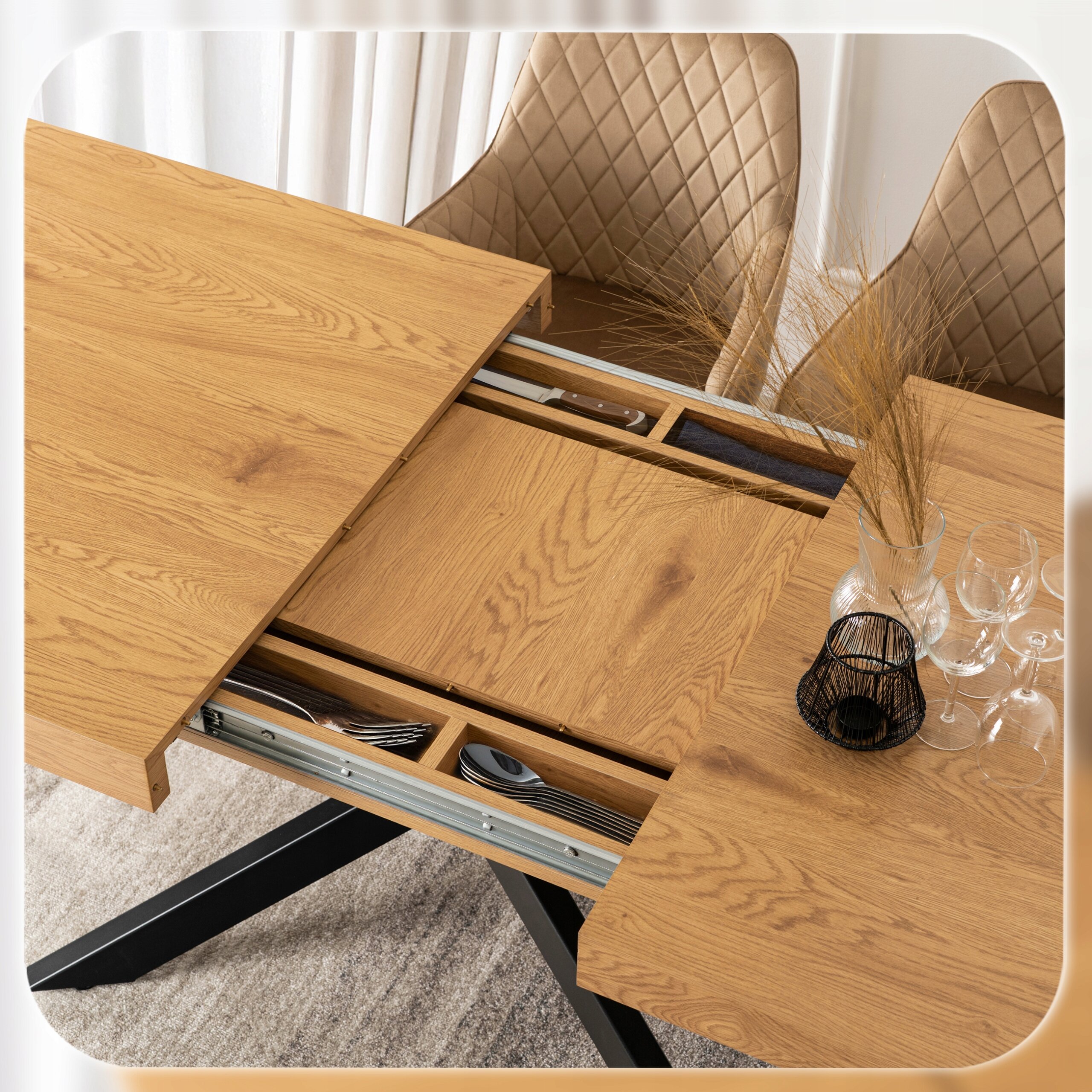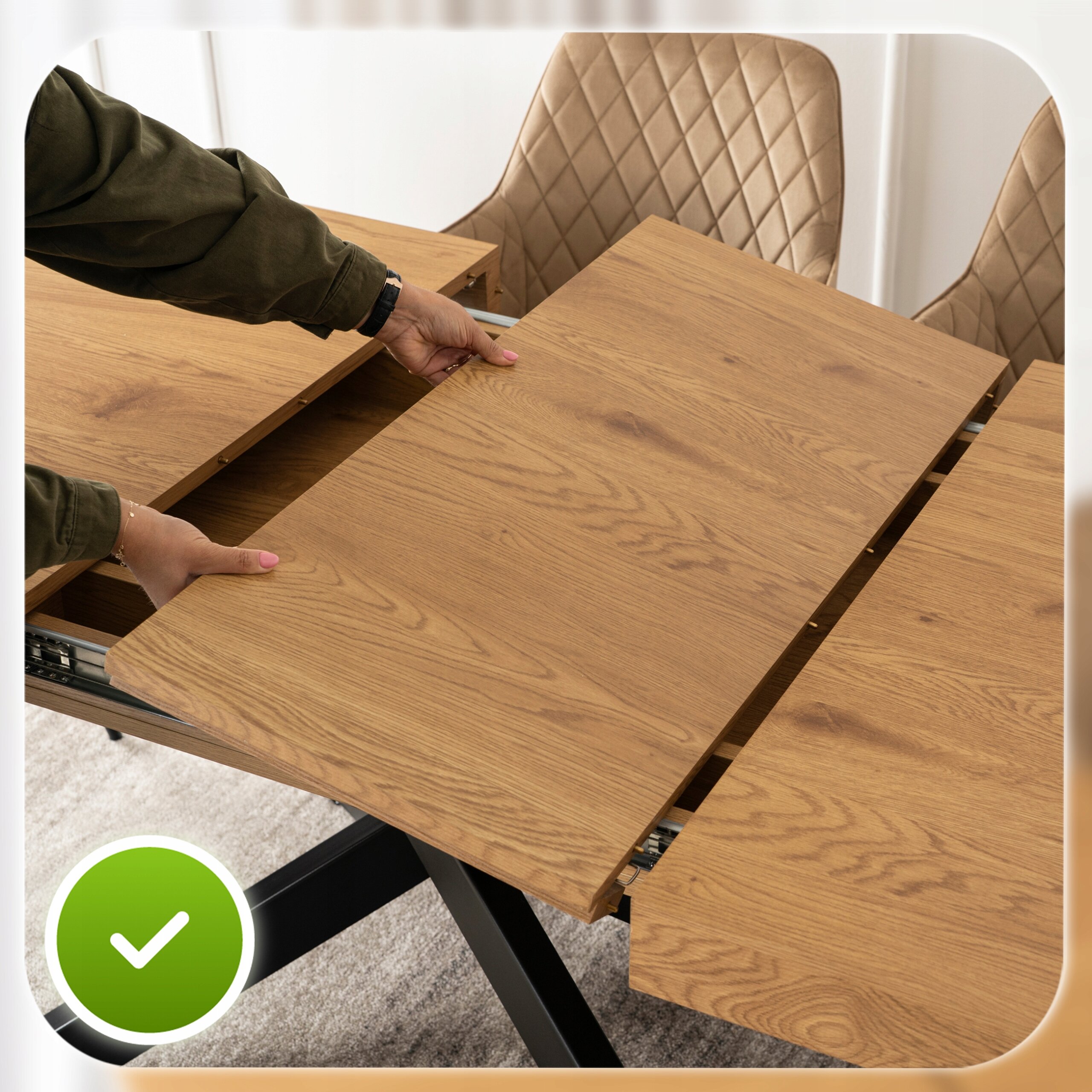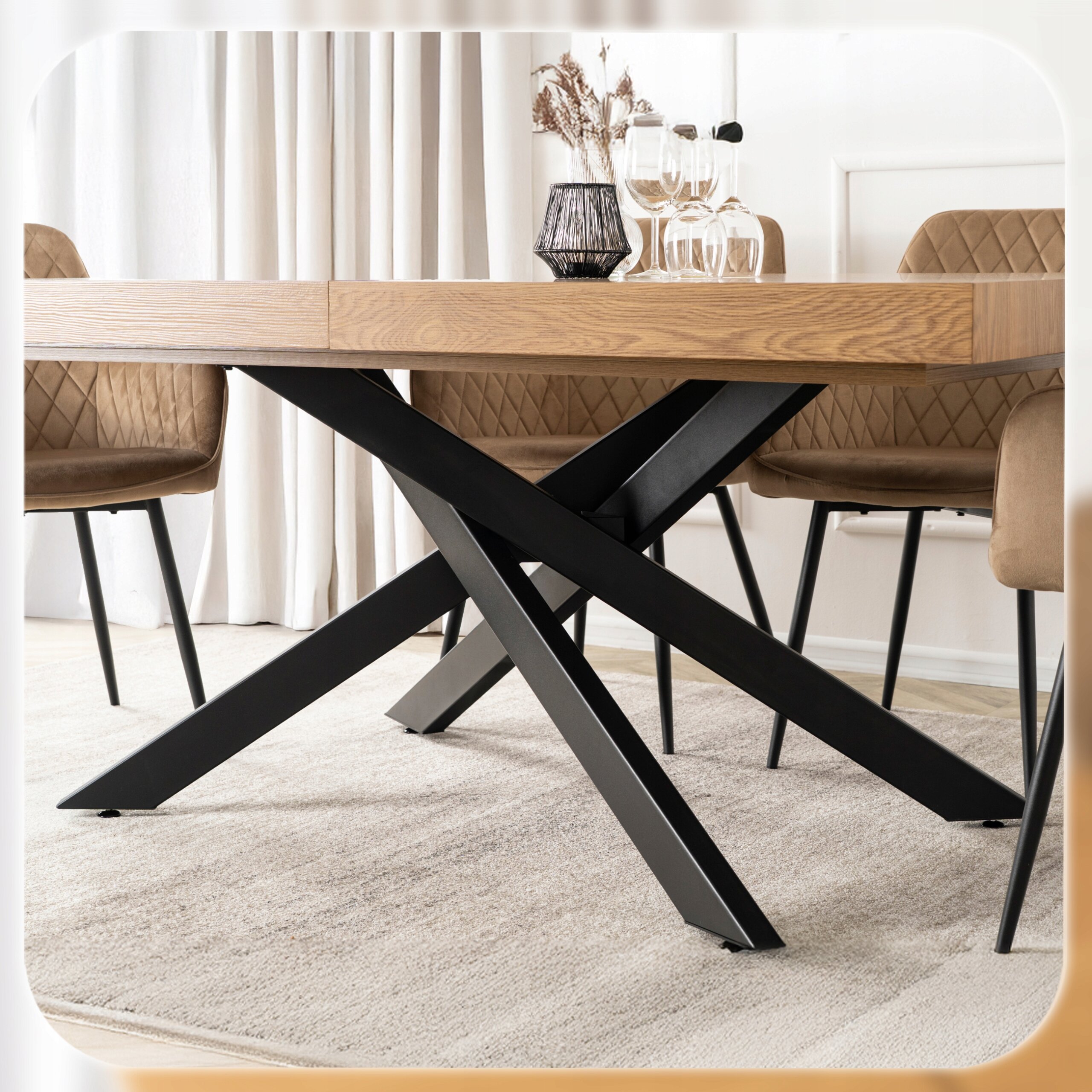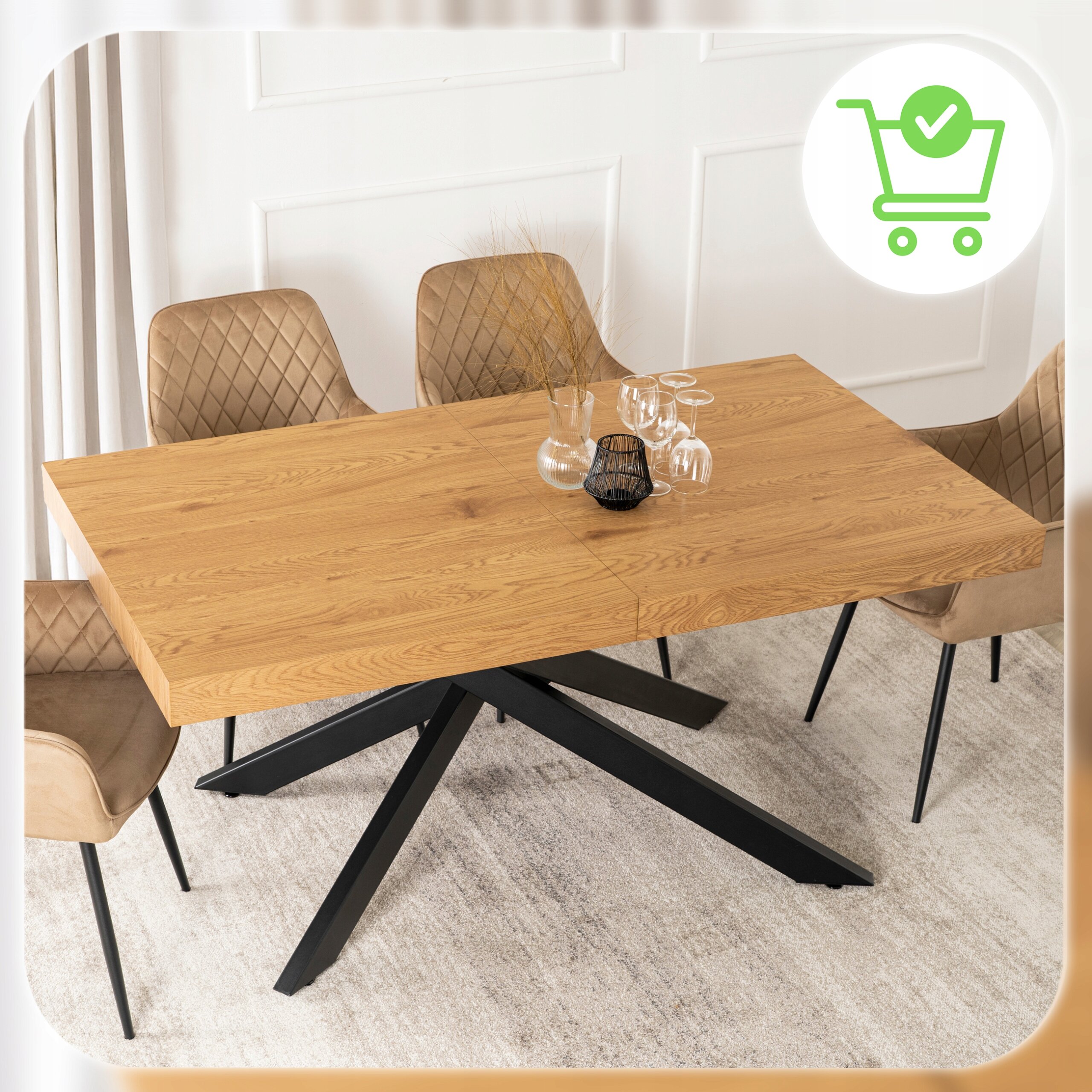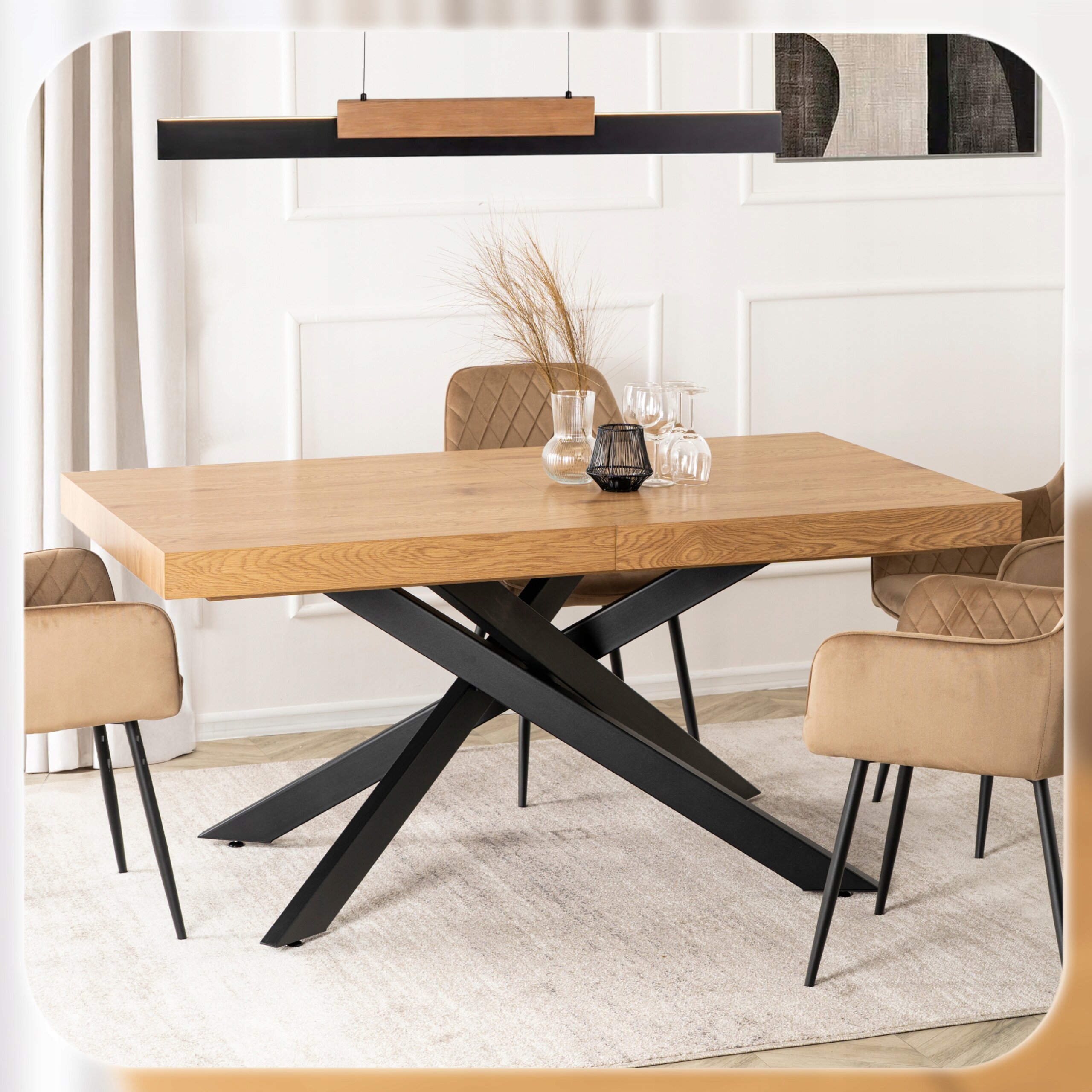 Stół HAMPTON to funkcjonalny i elegancki wybór do jadalni, salonu lub kuchni. Jego rozkładany blat w kolorze dębu zachwyca naturalnym nowoczesnym designem, doskonale komponując się z różnymi aranżacjami wnętrz. Stabilna podstawa w formie czarnych metalowych nóg nadaje mu wyjątkowego charakteru, a jednocześnie zapewnia trwałość i stabilność nawet przy maksymalnym rozłożeniu.