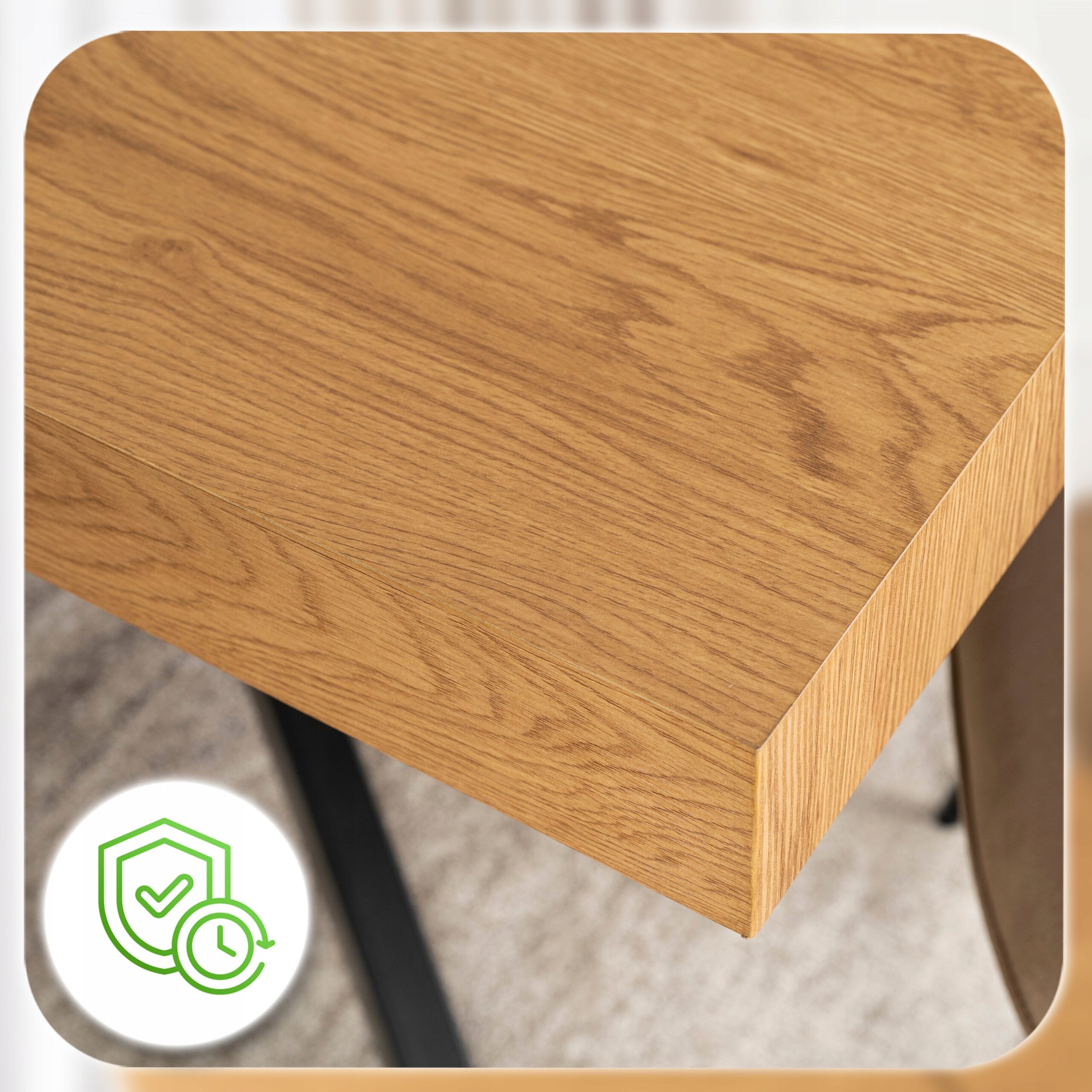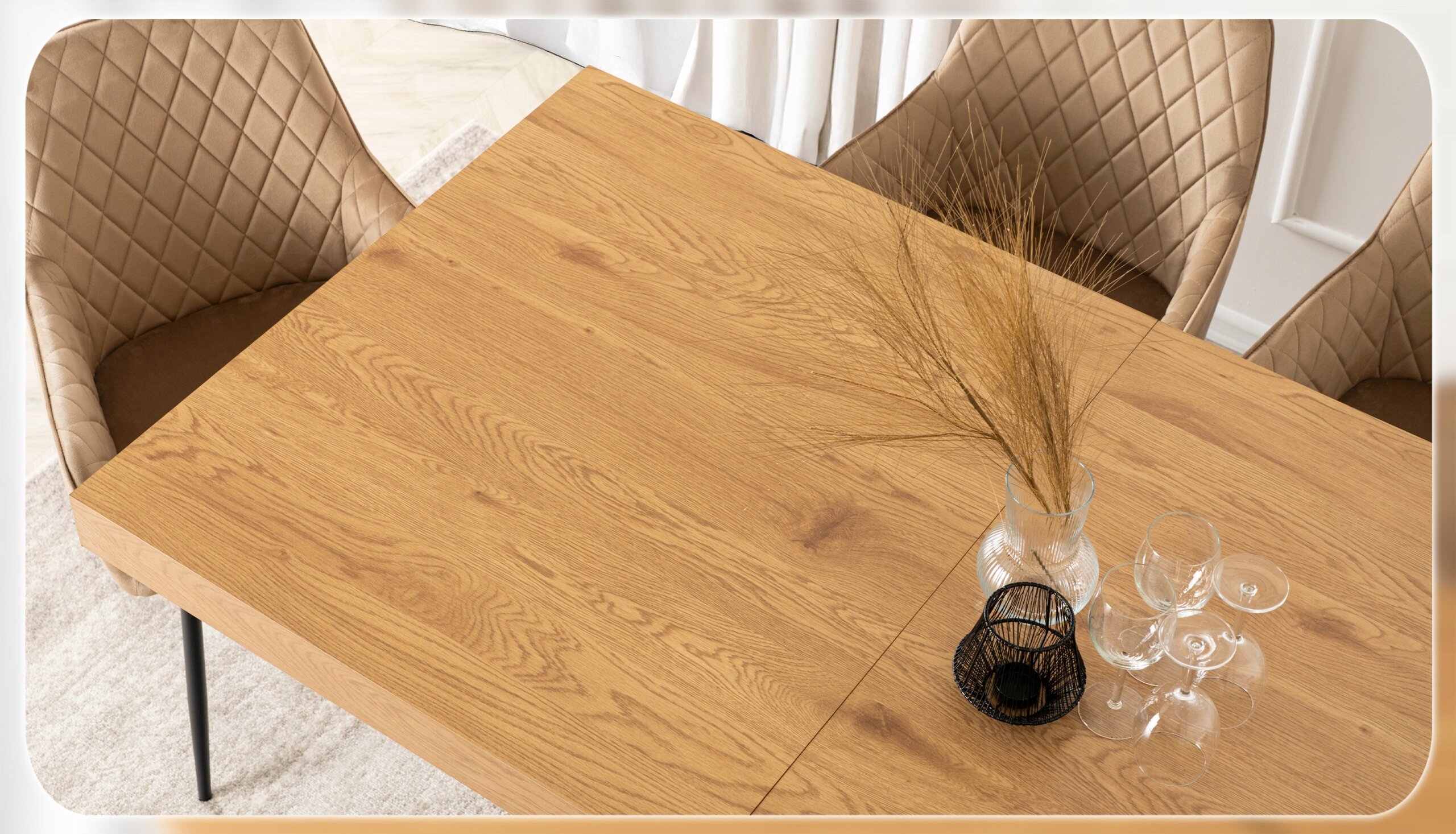 Blat stołu HAMPTON został wykonany z wysokiej jakości płyty MDF w kolorze dębu, wykończonej trwałą i elegancką powłoką. Nie stanowi jednego kawałka drewna. Jego wnętrze nie jest pełne – zastosowano konstrukcję zapewniającą lekkość i stabilność.