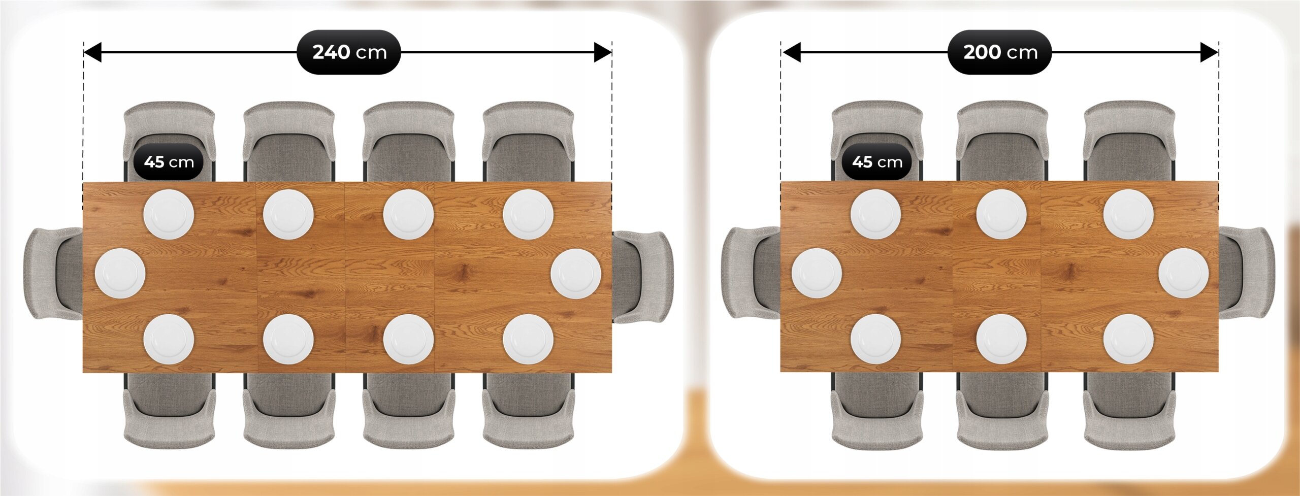 - Stół rozłożony (240 cm) – zalecana przestrzeń z krzesłami: 340 cm x 190 cm