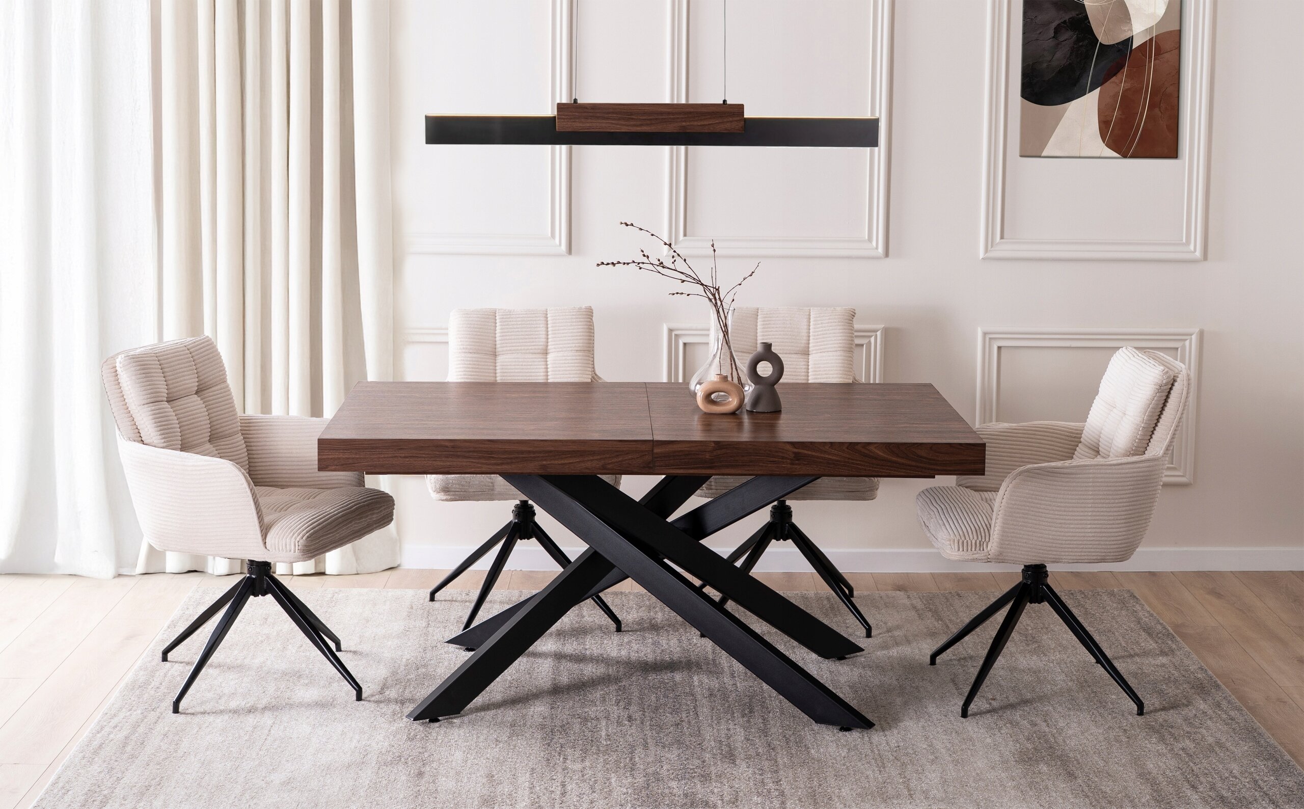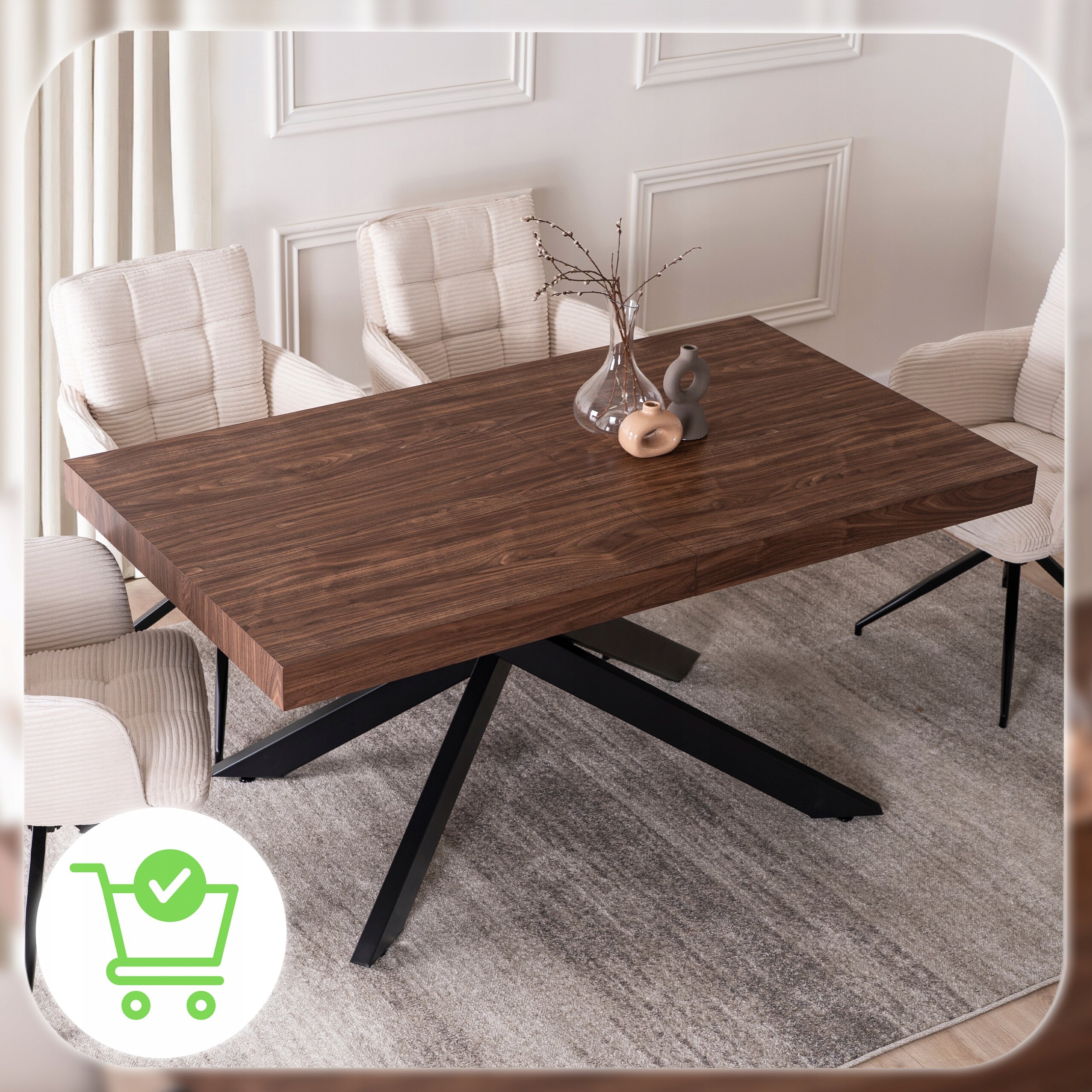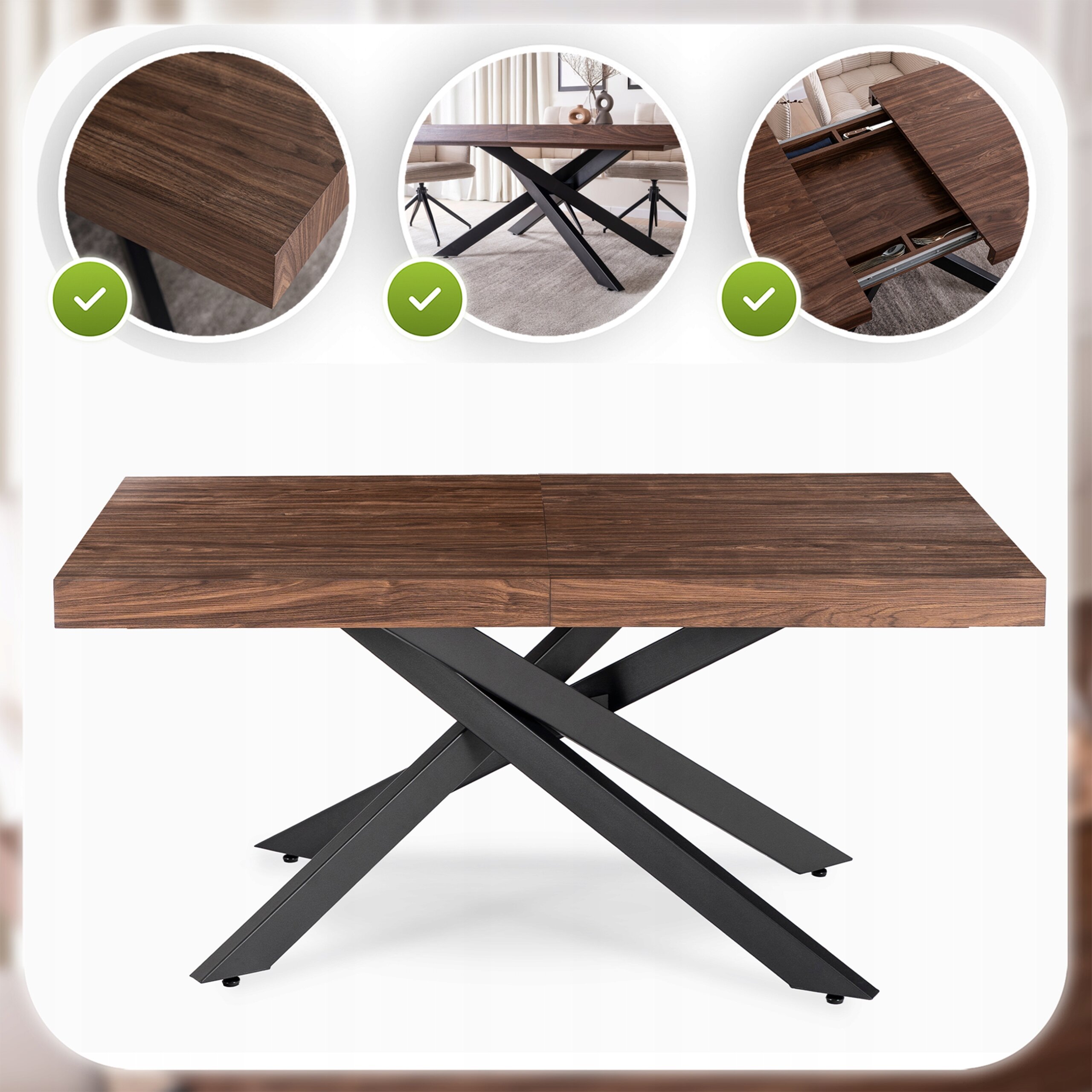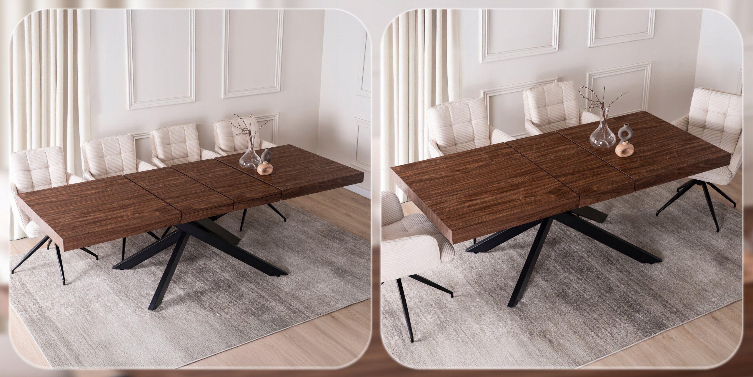 Stół HAMPTON to funkcjonalny i elegancki wybór do jadalni, salonu lub kuchni. Jego rozkładany blat w kolorze orzecha zachwyca naturalnym nowoczesnym designem, doskonale komponując się z różnymi aranżacjami wnętrz. Stabilna podstawa w formie czarnych metalowych nóg nadaje mu wyjątkowego charakteru, a jednocześnie zapewnia trwałość i stabilność nawet przy maksymalnym rozłożeniu.