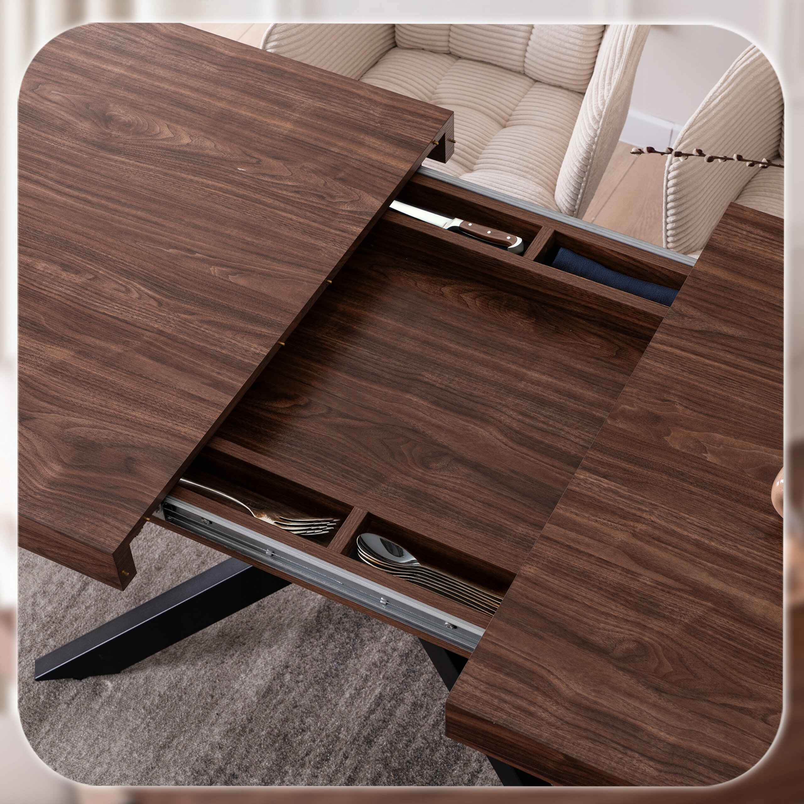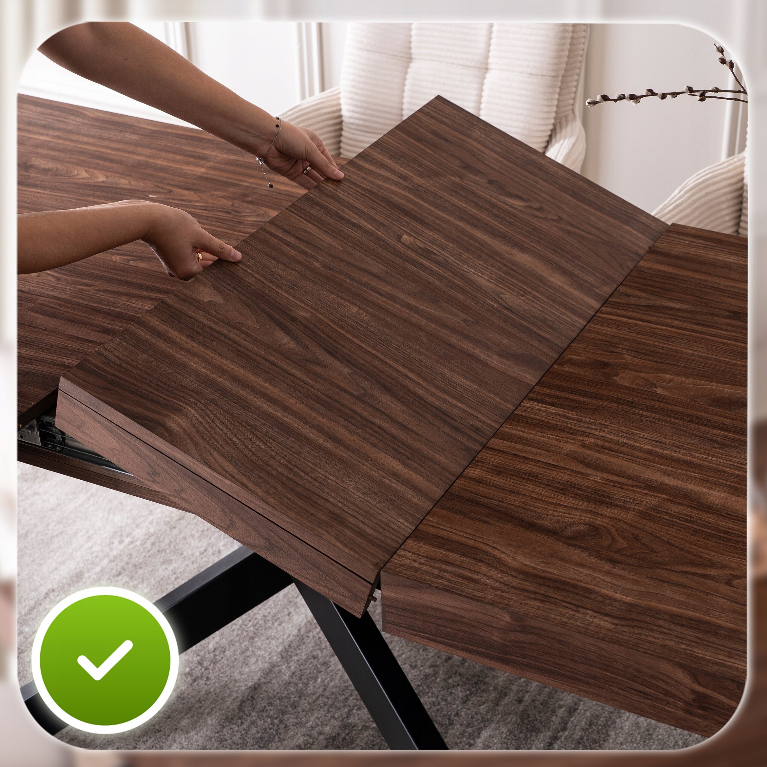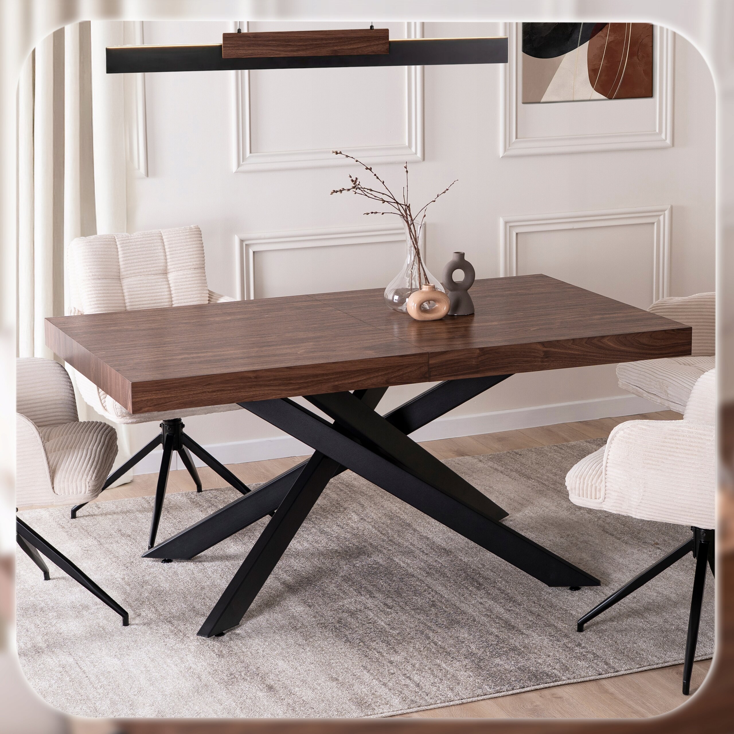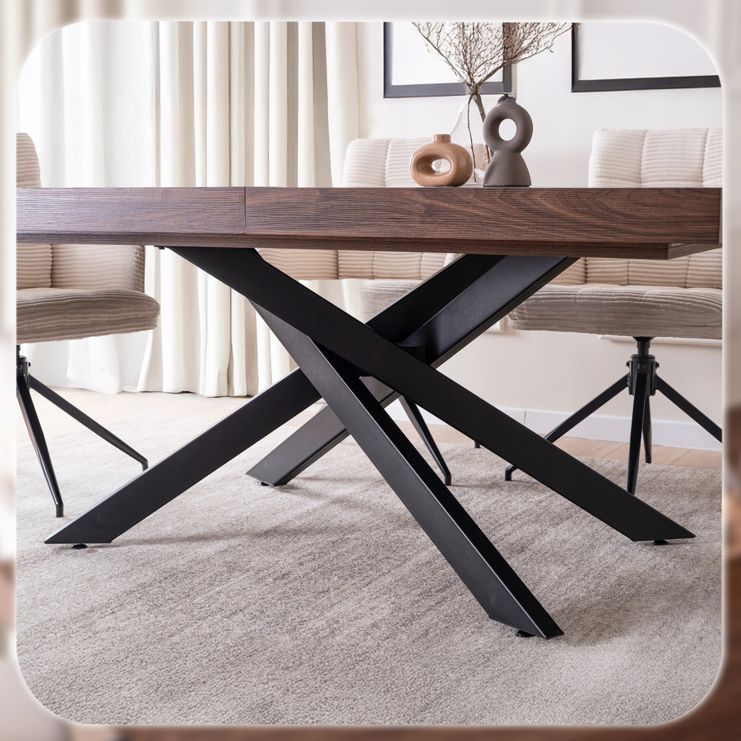 Stół HAMPTON to funkcjonalny i elegancki wybór do jadalni, salonu lub kuchni. Jego rozkładany blat w kolorze orzecha zachwyca naturalnym nowoczesnym designem, doskonale komponując się z różnymi aranżacjami wnętrz. Stabilna podstawa w formie czarnych metalowych nóg nadaje mu wyjątkowego charakteru, a jednocześnie zapewnia trwałość i stabilność nawet przy maksymalnym rozłożeniu.