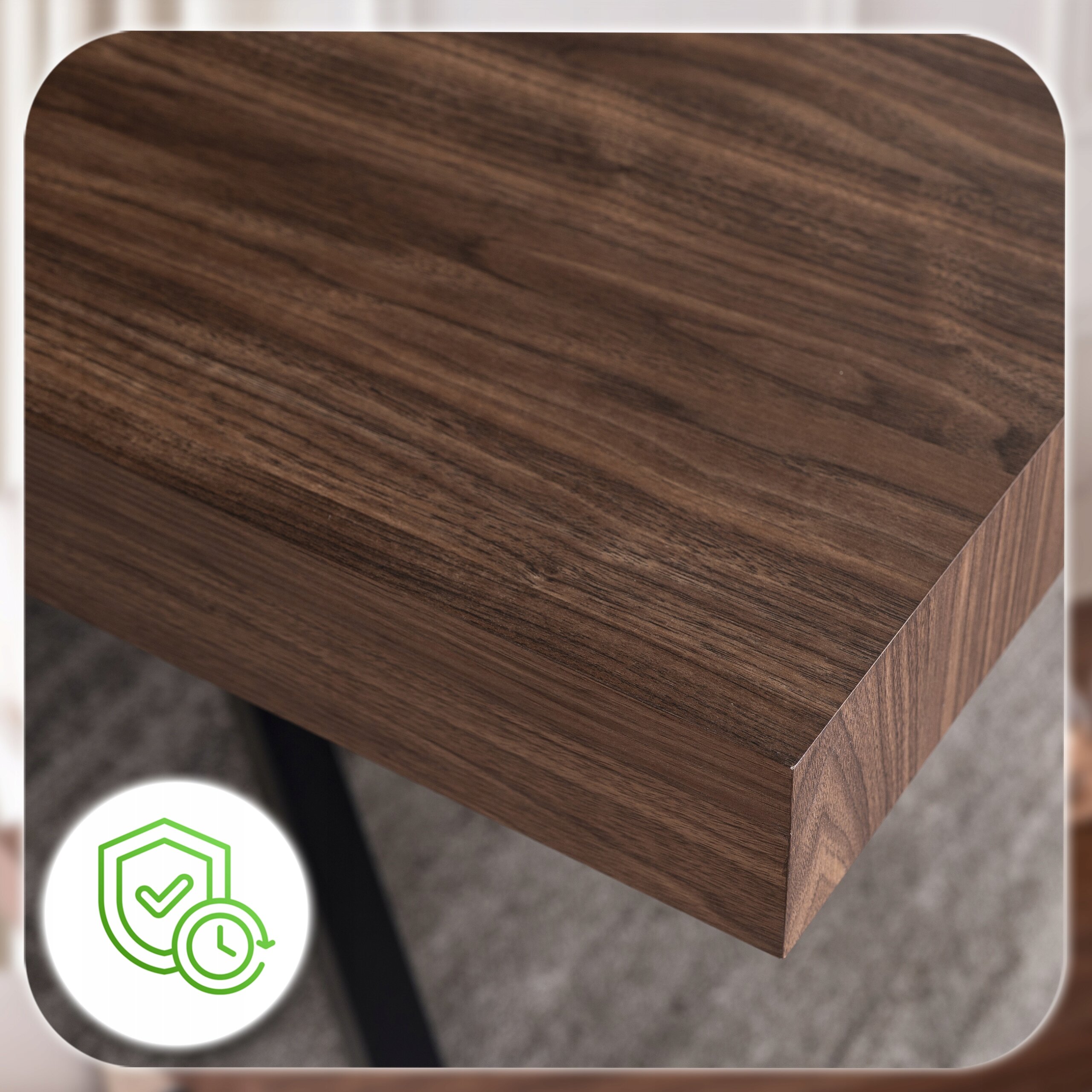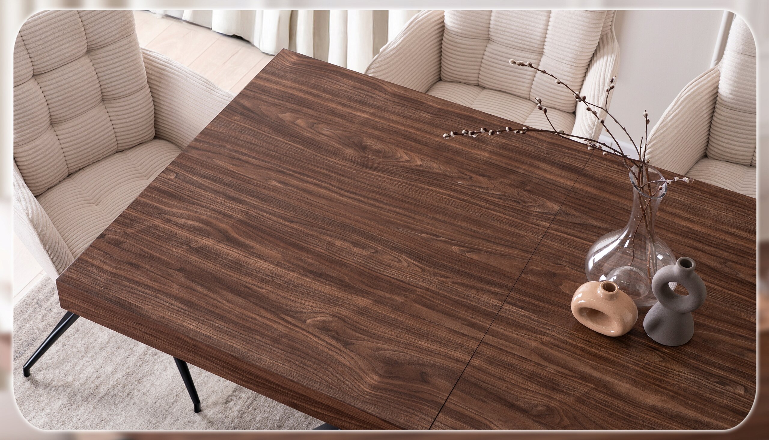 Blat stołu HAMPTON został wykonany z wysokiej jakości płyty MDF w kolorze orzecha, wykończonej trwałą i elegancką powłoką. Nie stanowi jednego kawałka drewna. Jego wnętrze nie jest pełne – zastosowano konstrukcję zapewniającą lekkość i stabilność.