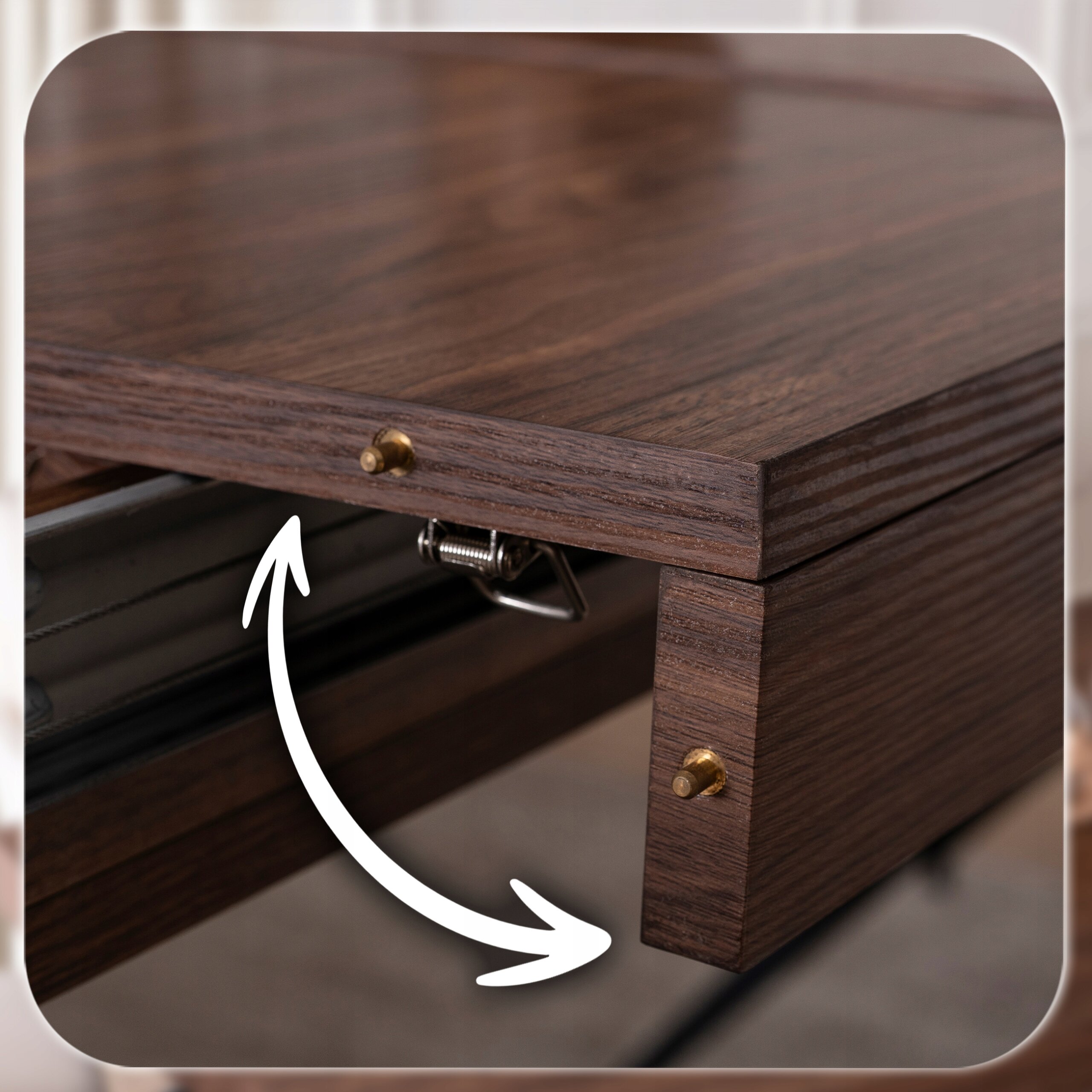 - Rozkładany blat – pozwala w kilka chwil powiększyć powierzchnię stołu, zapewniając wygodę podczas spotkań z rodziną i przyjaciółmi.