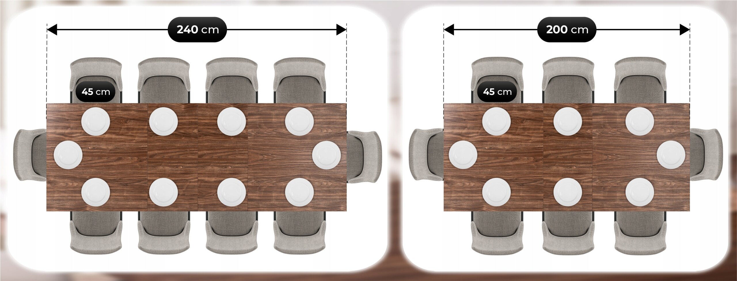- Stół rozłożony (240 cm) – zalecana przestrzeń z krzesłami: 340 cm x 190 cm