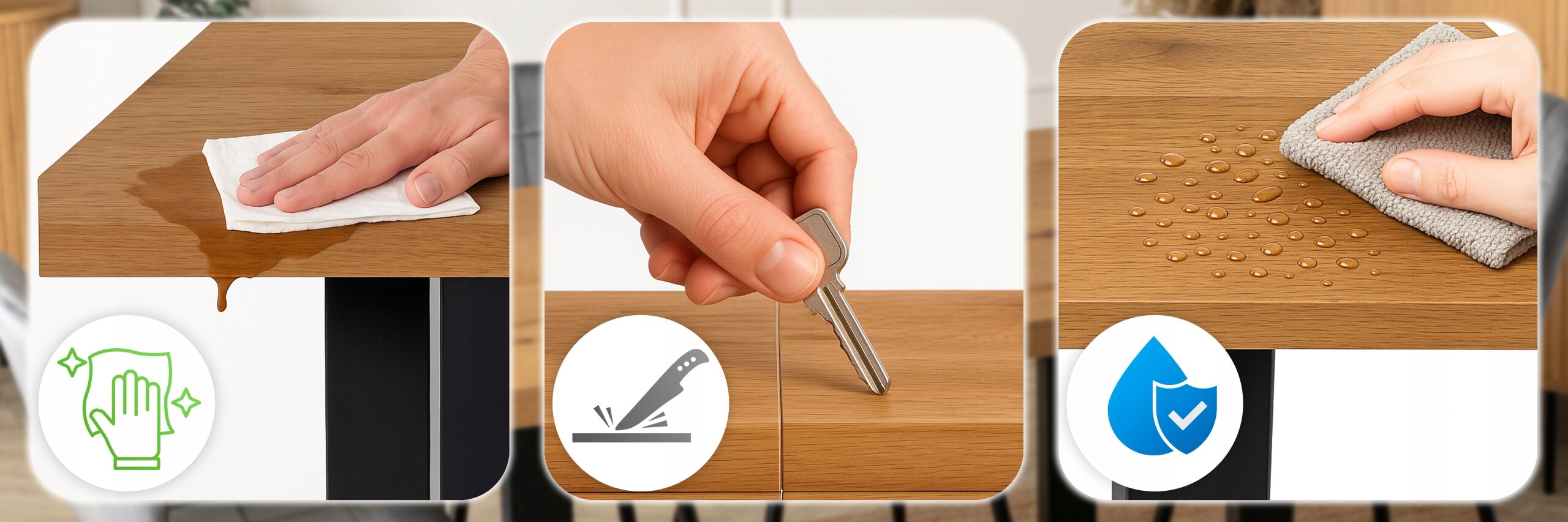 - Łatwa pielęgnacja – powierzchnia blatu jest odporna na zabrudzenia, zarysowania i wilgoć – wystarczy przetrzeć wilgotną ściereczką, aby utrzymać ją w czystości.