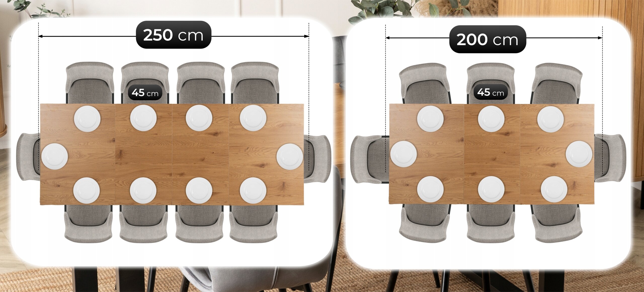 - Stół z dwiema wkładkami (230 cm) – bez problemu ustawisz przy nim 8 krzeseł, co czyni go doskonałym rozwiązaniem na większe uroczystości i przyjęcia.
