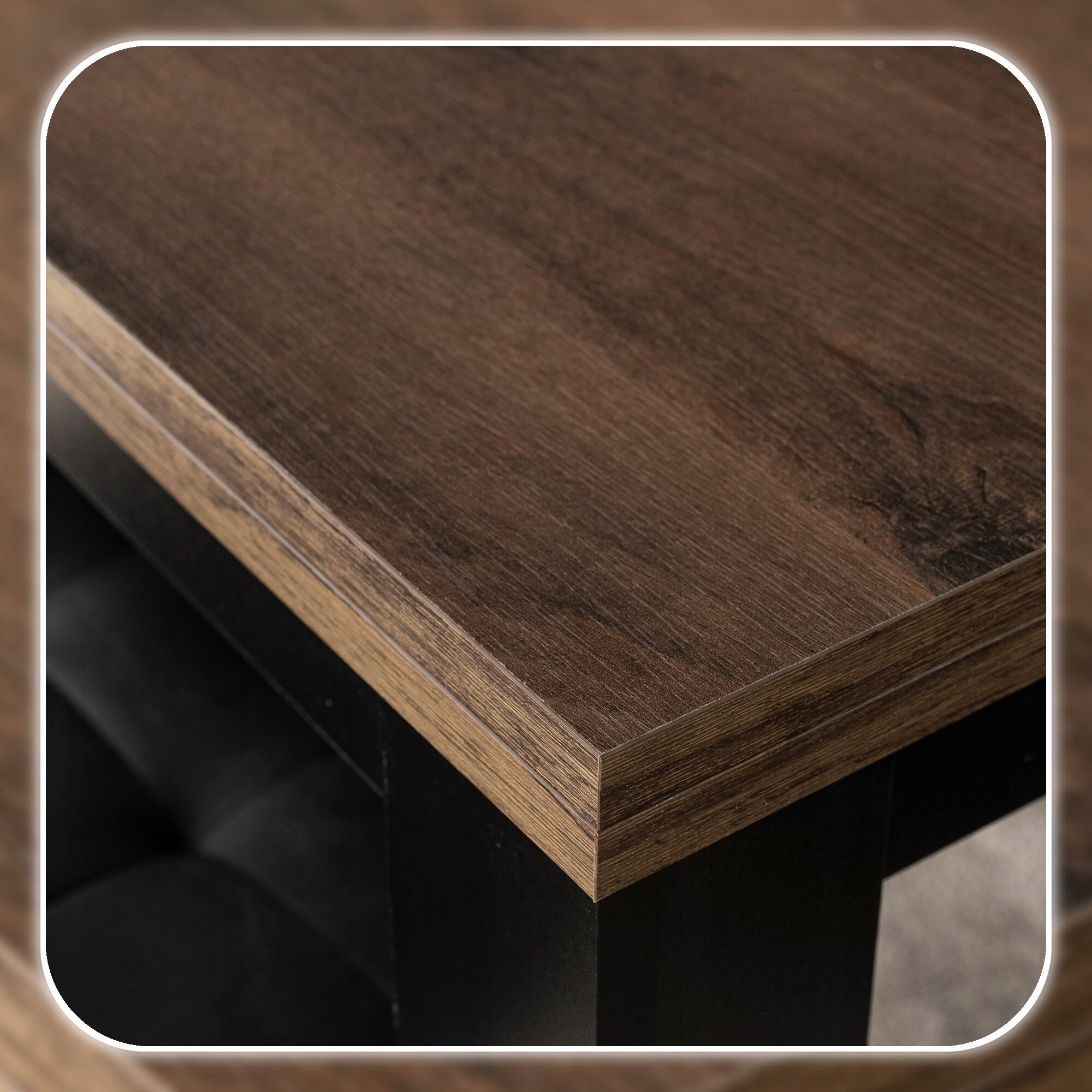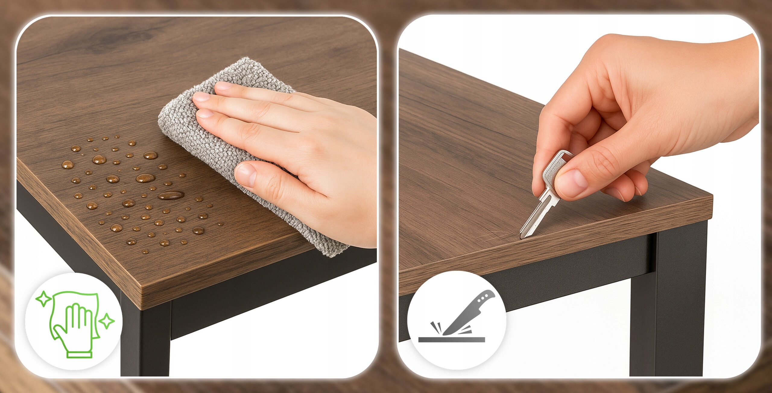 Blat wykonano z płyty MDF z wykończeniem w kolorze orzechu. Materiał ten zapewnia trwałość, a jednocześnie efektowny wygląd z widocznym usłojeniem. Powierzchnia blatu jest zabezpieczona warstwą ochronną ułatwiającą pielęgnację.