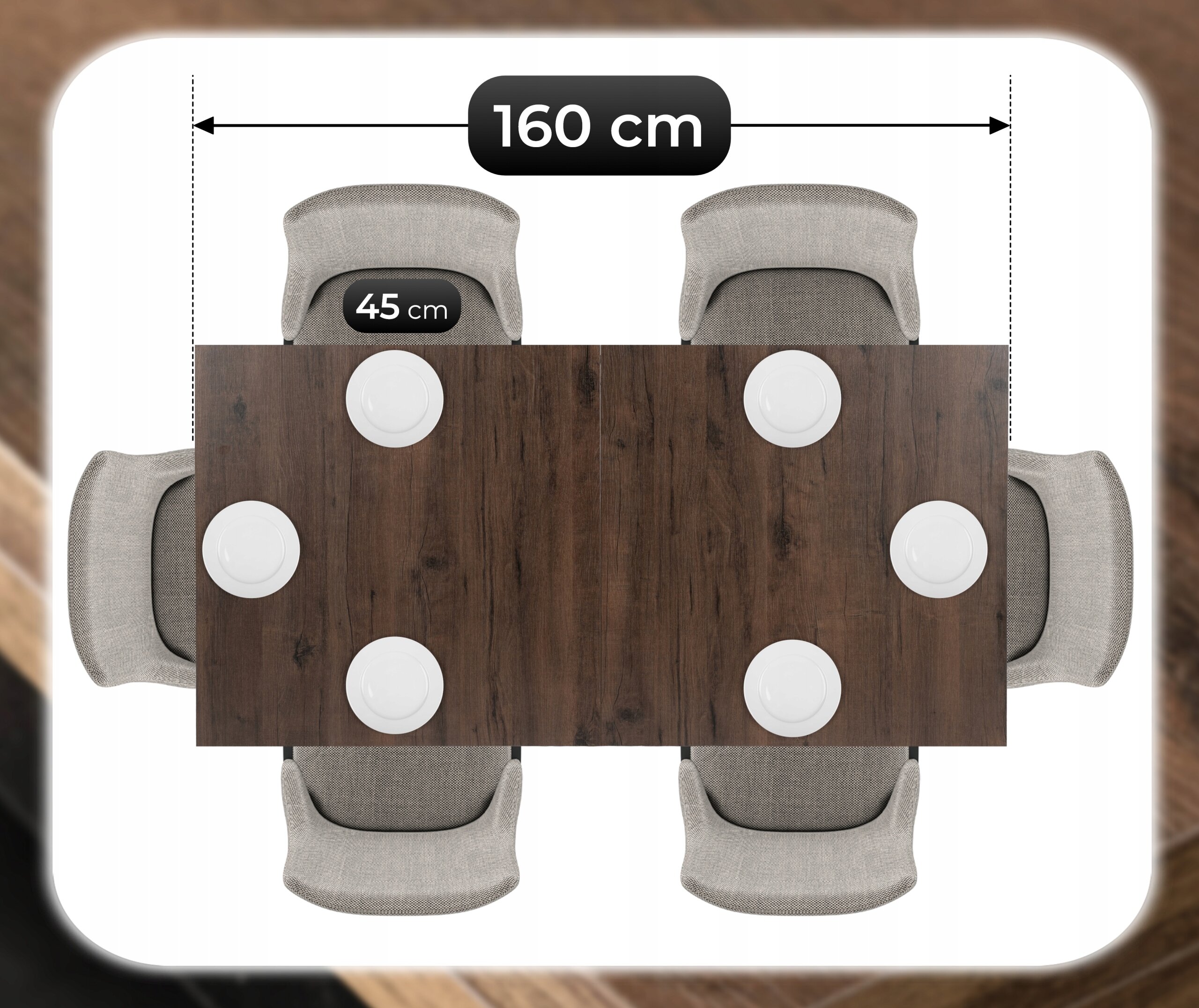 - Stół po rozłożeniu (160 cm) – wygodnie pomieści 6 krzeseł, idealny na codzienne posiłki w gronie rodziny.